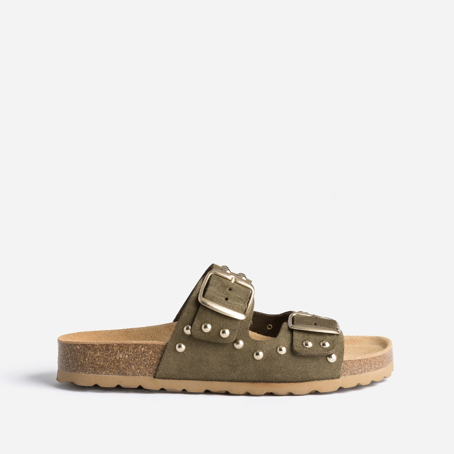 Il n’y a que celles qui ne l’ont pas encore essayée qui peuvent encore y résister ! La mule anatomique assume son côté irrésistible, par son confort et son style, alliés dans un parfait équilibre. Déclinée en coloris kaki, elle présente deux larges brides en cuir velours, décorées de clous en métal doré et ajustables par boucles. Elle est montée sur une semelle première ergonomique en cuir velours, un pur bonheur pour la plante du pied. Un modèle ultra rock, à imaginer avec un tee-shirt à épaulettes et un short en jean à franges, en total look black or white.