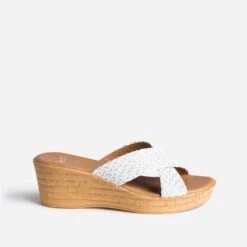 La mule se porte précisément en période estivale. Montée sur un talon compensé imitation liège, elle maintient le pied par deux brides en matières synthétiques tressées, associant le blanc et l’argenté. Un modèle à porter décontracté, avec un tee-shirt blanc et une jupe midi grise et plissée.