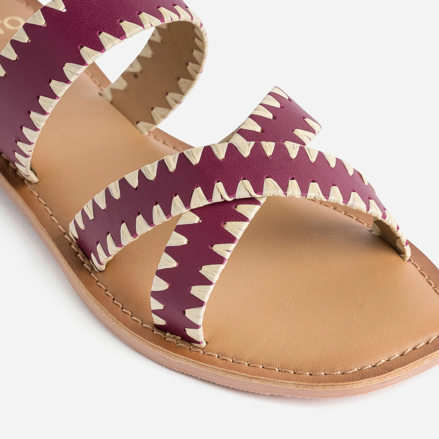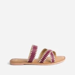 Sur le dessus, une bride simple et deux brides croisées. Cette mule plate pour femme opte pour un esprit ethnique, marqué par l’association de cuir prune et d’un tressage imitation raphia beige. A réserver avec une longue robe écrue à broderies unies ou de couleurs. Pour un look ethnique, chic et tendance.
