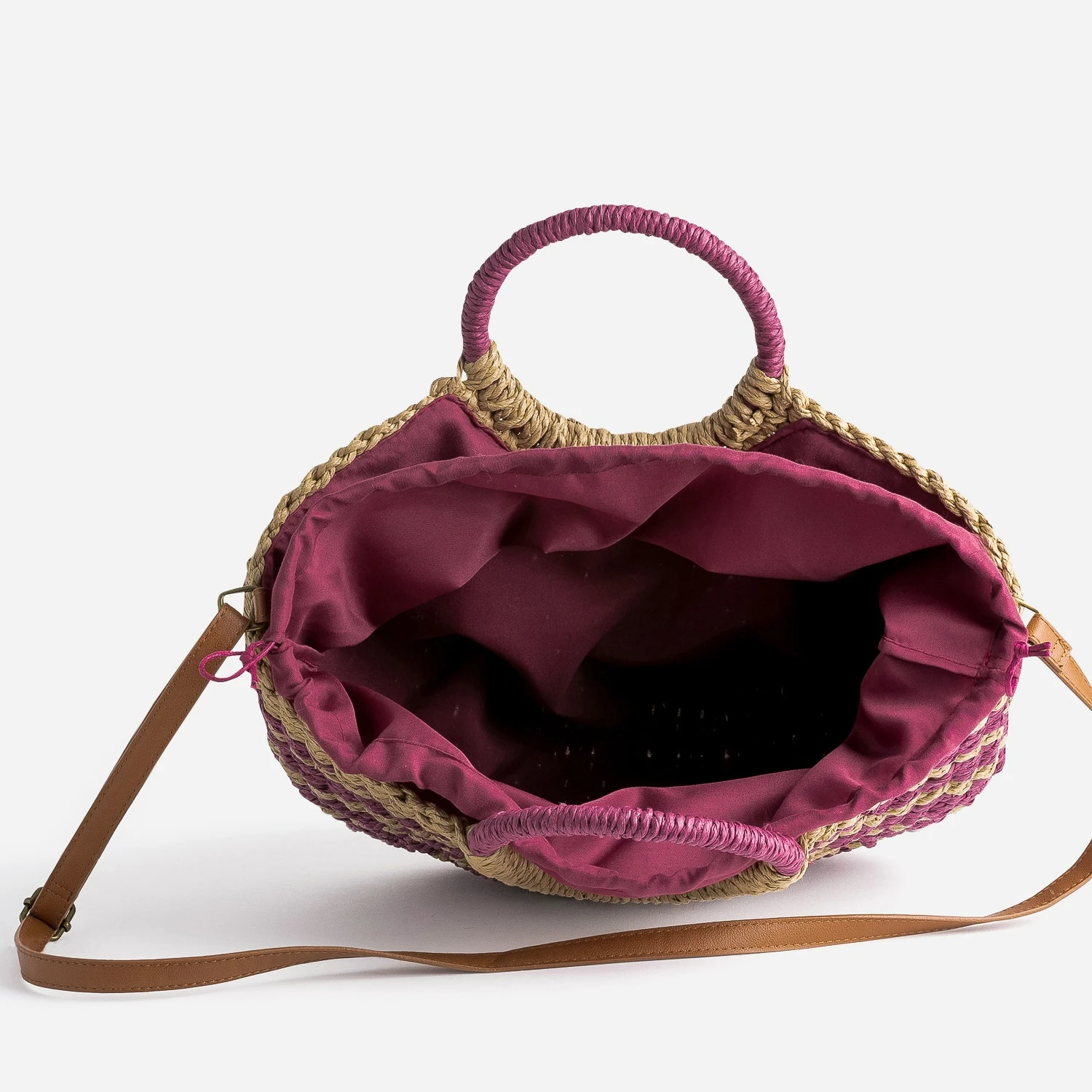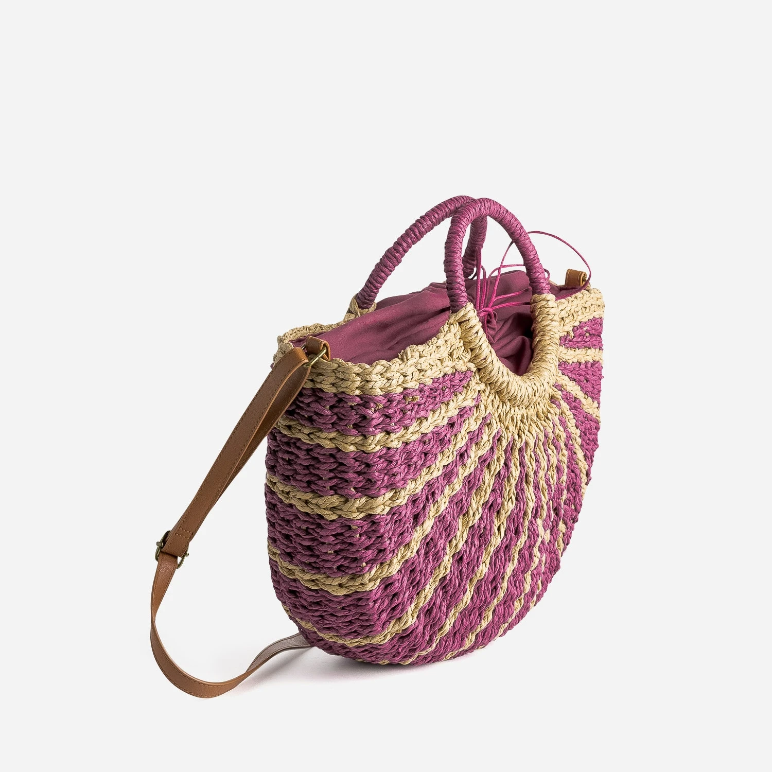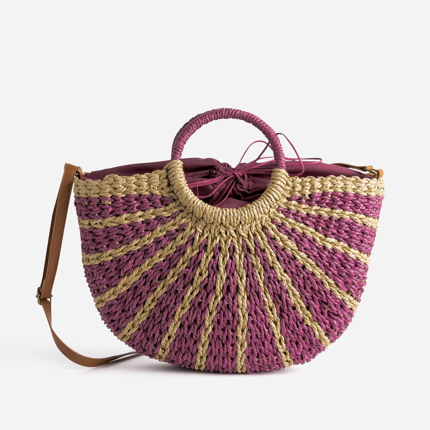 Jeu de rayures fantaisie réussi pour ce panier pour femme. En papier façon paille tressée, il alterne les coloris beige et prune, dans une parfaite harmonie. Transportable à la main, grâce à ses doubles anses, il peut se porter aussi sur l’épaule ou croisé, grâce à sa bandoulière réglable. A l’intérieur, la doublure prune se prolonge comme un sac, fermé par un lacet, pour garder vos affaires personnelles en toute sécurité.