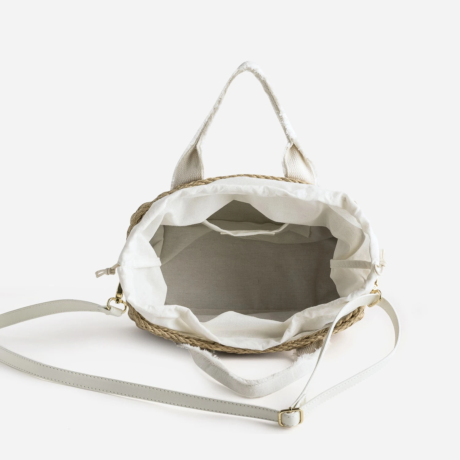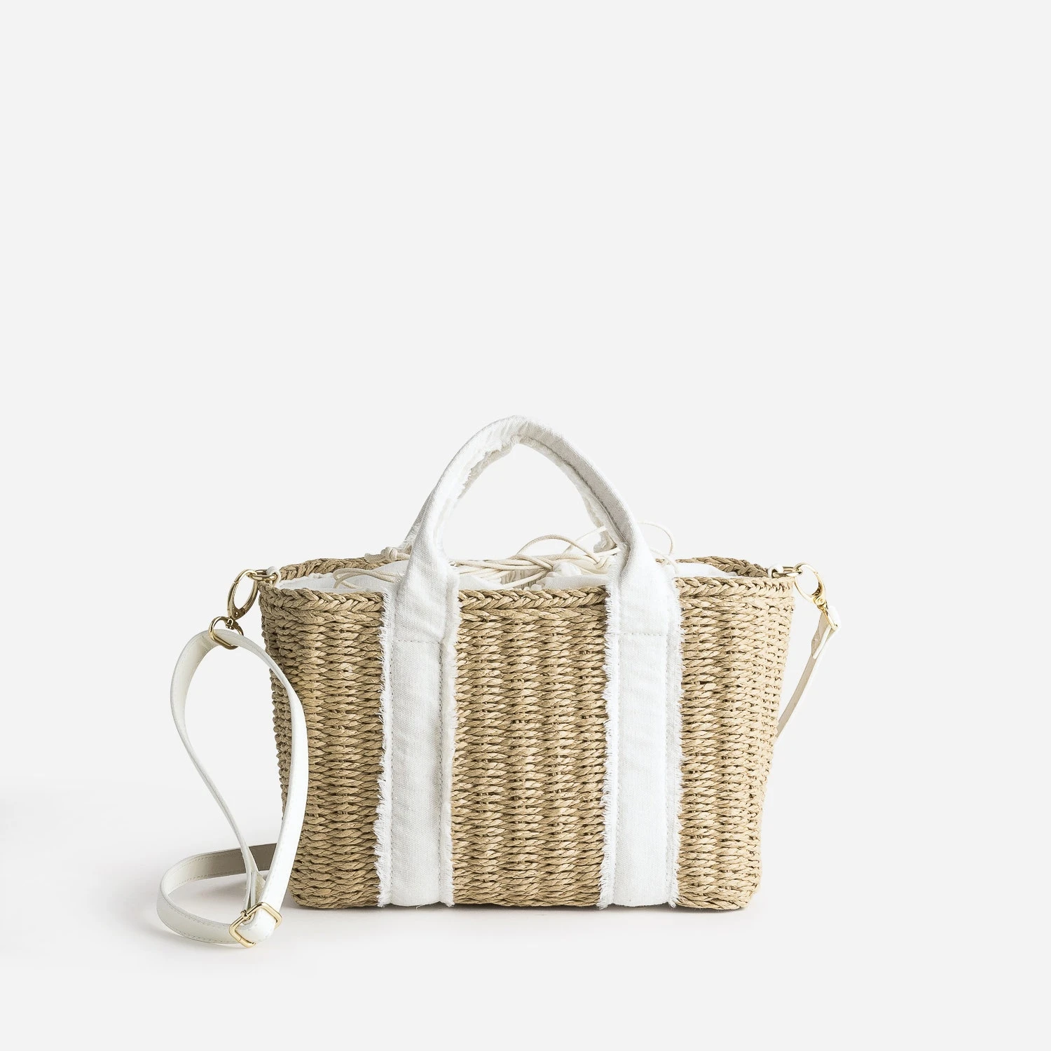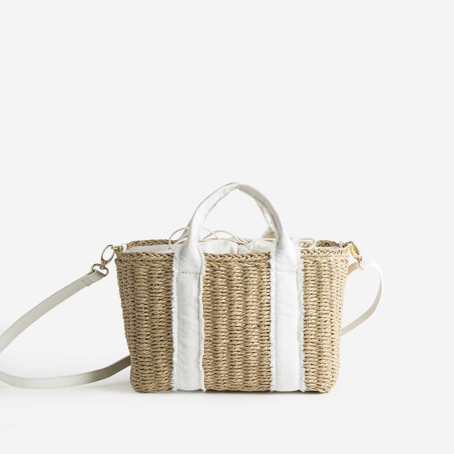 Une forme parallélépipède, qui permet un rangement optimal. Une matière 100% paille, avec doublure allongée qui vient se fermer, par un lacet, sur le dessus. Des anses courtes en textile écru à bords frangés, renforcées par une bandoulière réglable et amovible, pour multiplier les portés. Ce panier pour femme défend un style bohème chic et simple, très plébiscité en été.