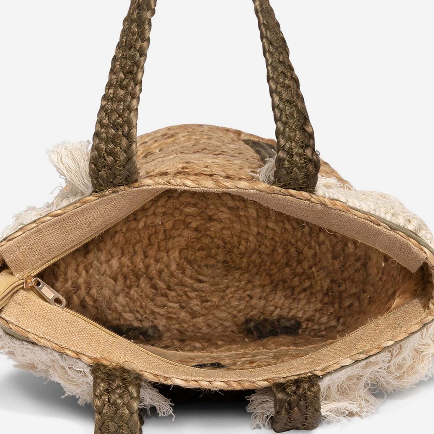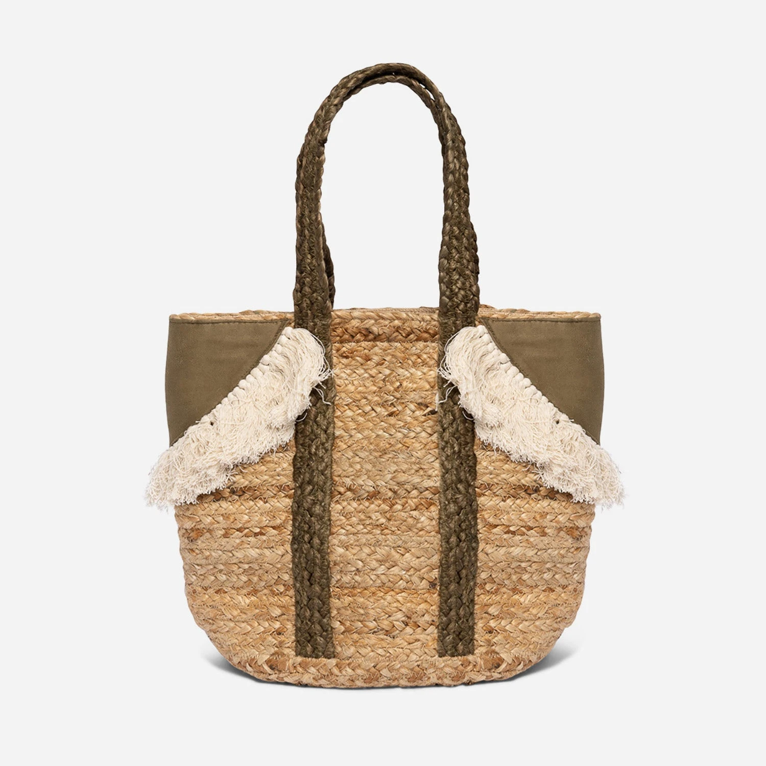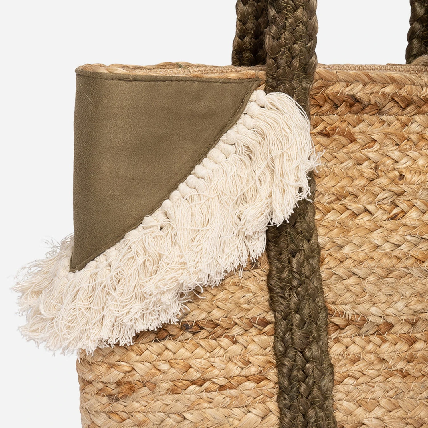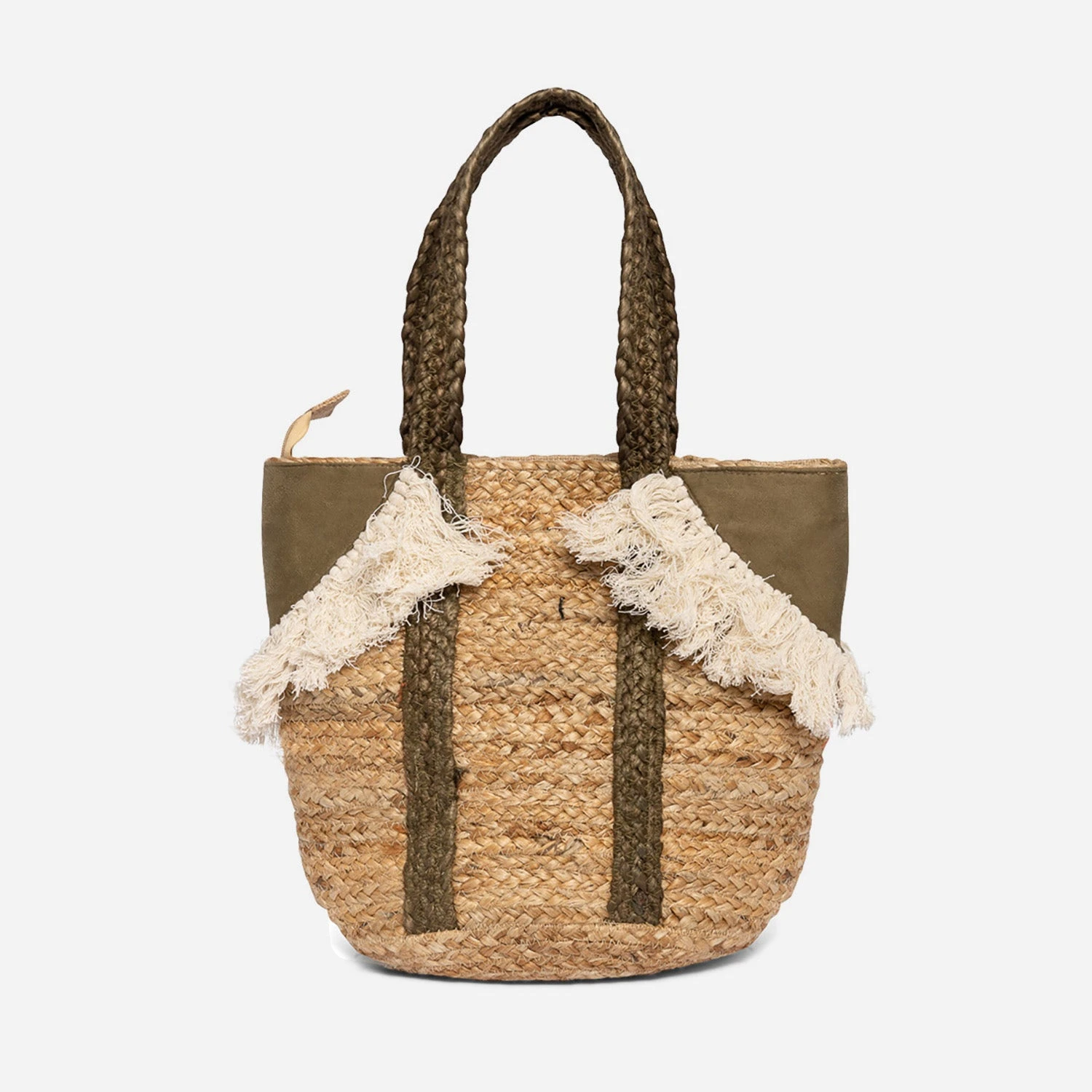Coup de cœur pour ce nouveau panier ! Confectionné à partir de toile de jute naturelle, il affirme son style ethnique par deux anses kaki tressées et des franges ivoire en bordures d’empiècements suédés. Le fond, légèrement arrondi, permet d’accueillir un maximum de choses. Un modèle à porter à la main ou sur l’épaule, avec une saharienne kaki.