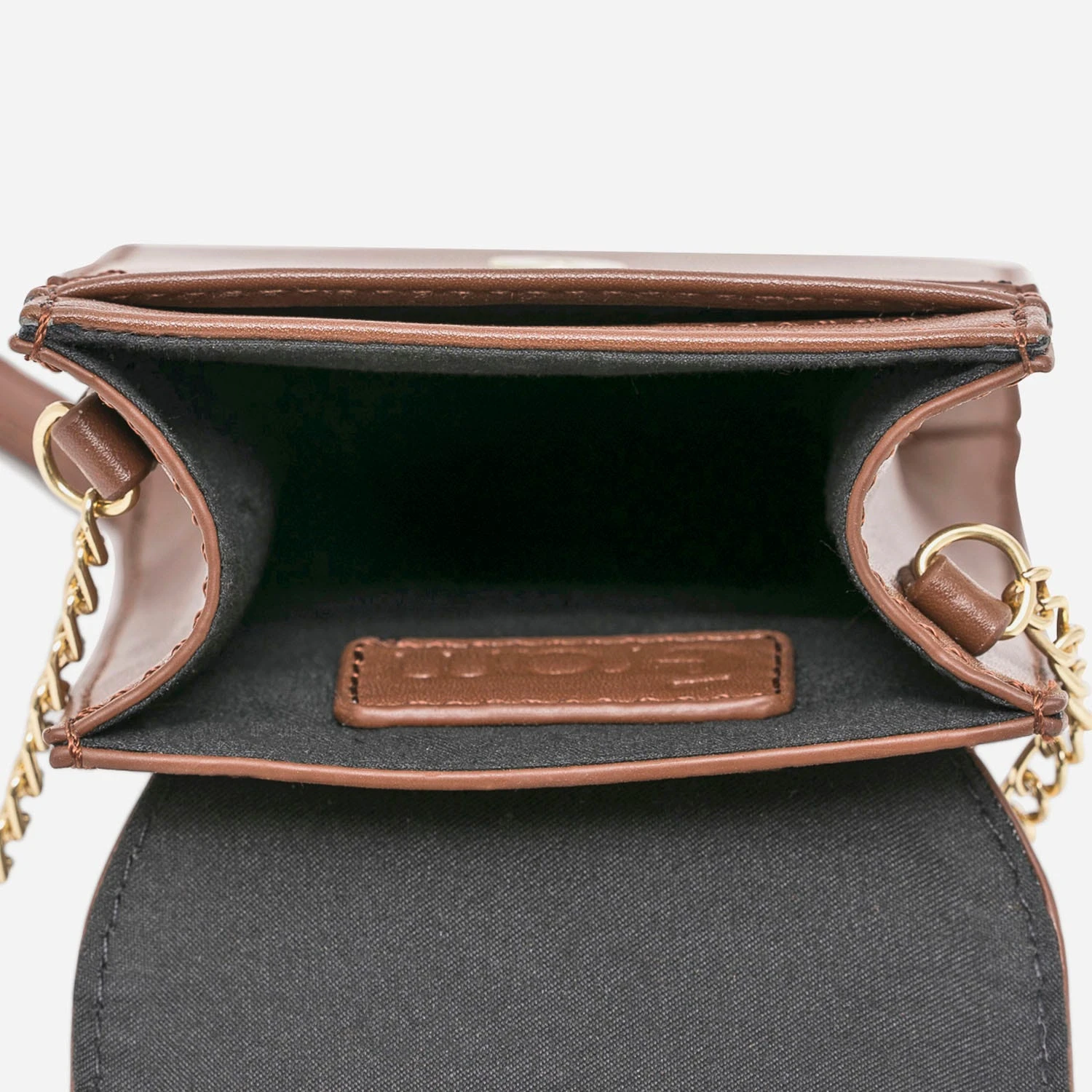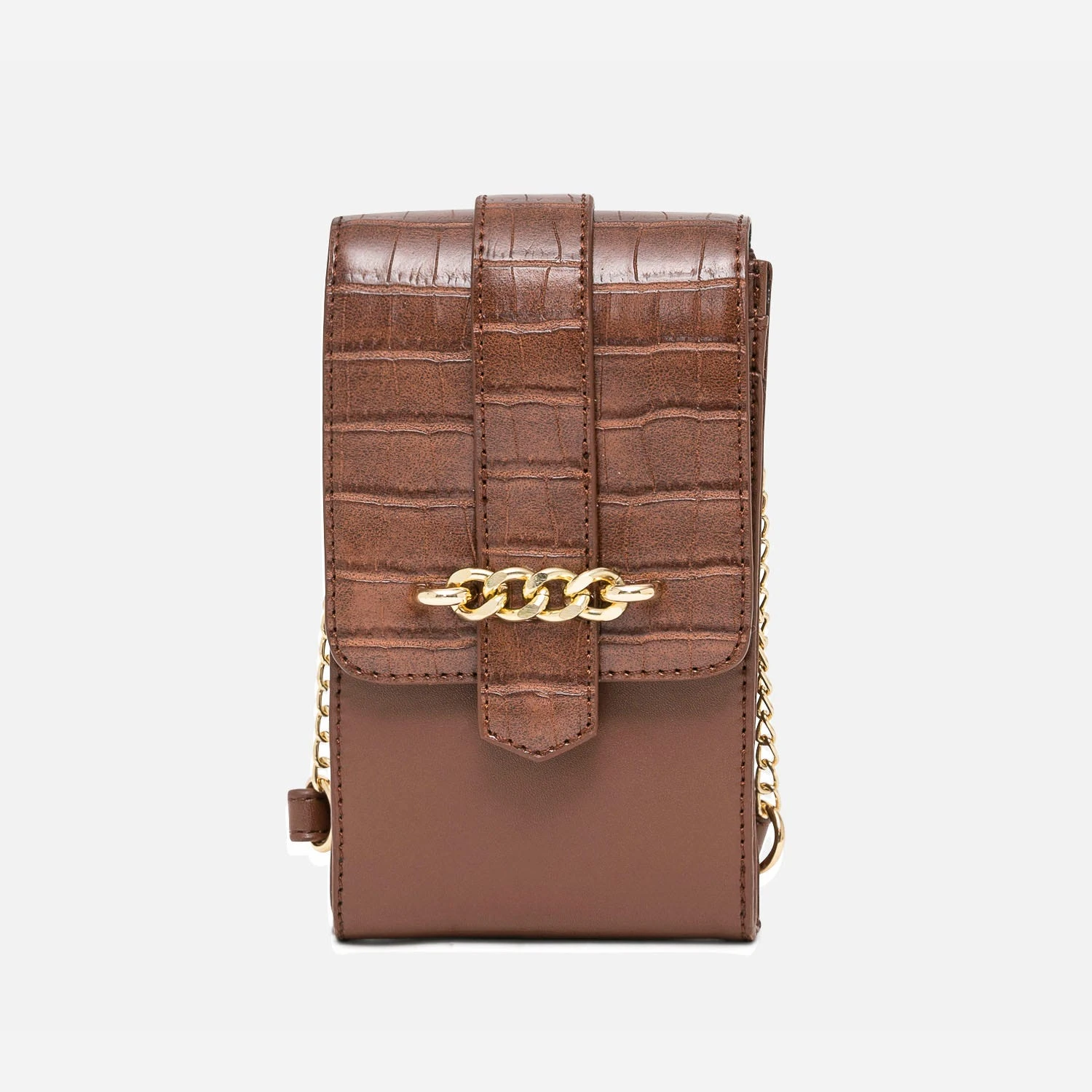 Allégez votre quotidien, en commençant par changer de sac à main. Pensé pour y ranger le téléphone et quelques cartes, cette pochette va vite devenir indispensable. En matière synthétique cognac, elle gagne en style et en chic, par son rabat embossé effet croco et sa patte décorée d’une chaîne en métal doré. Une nouvelle liberté !