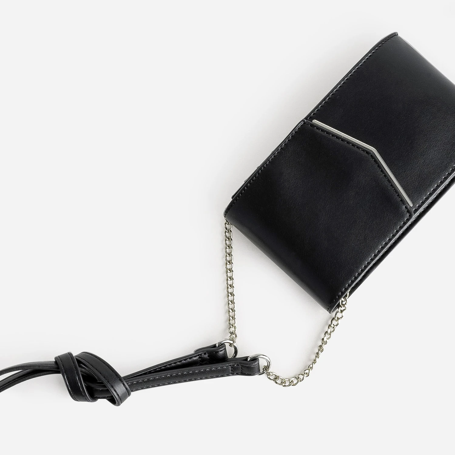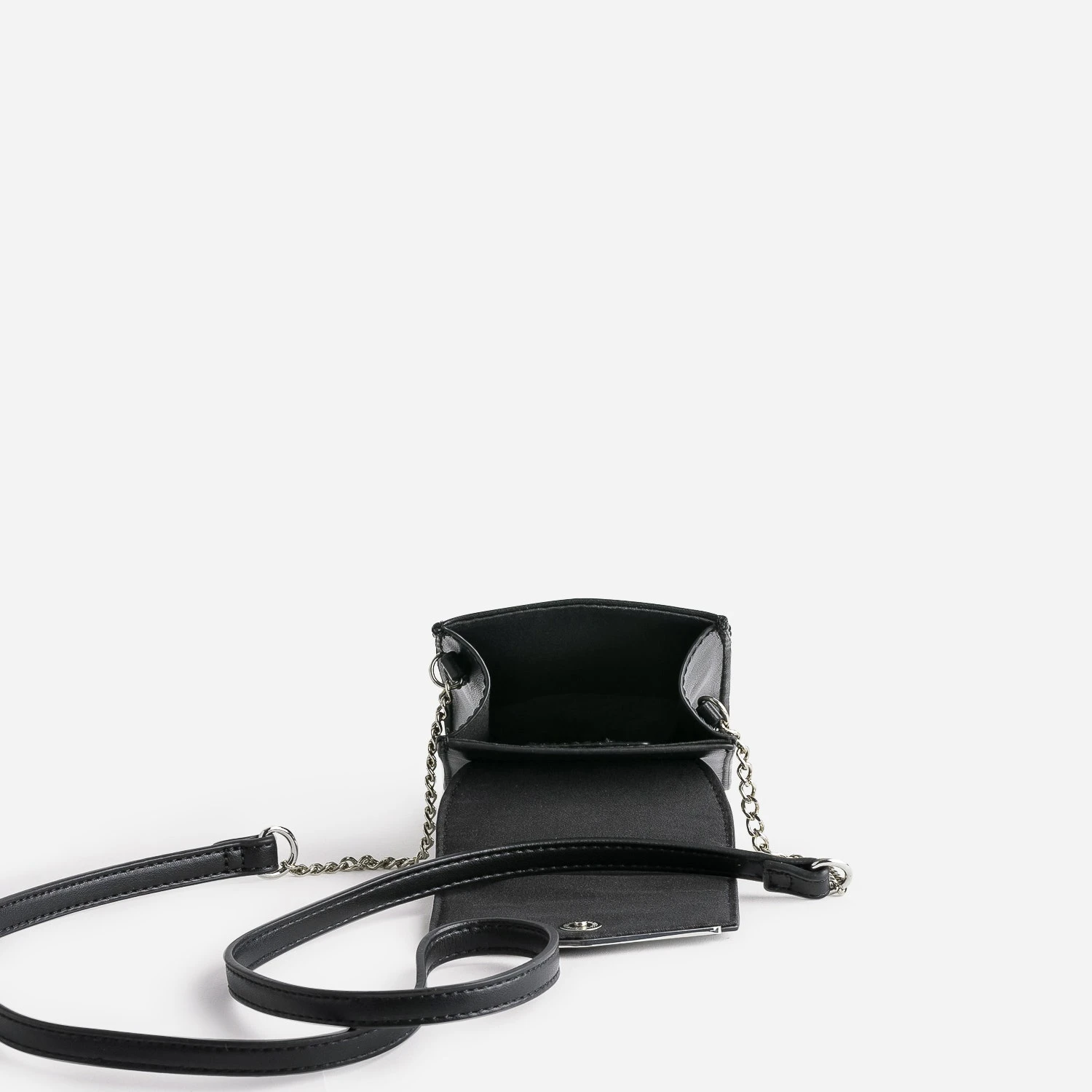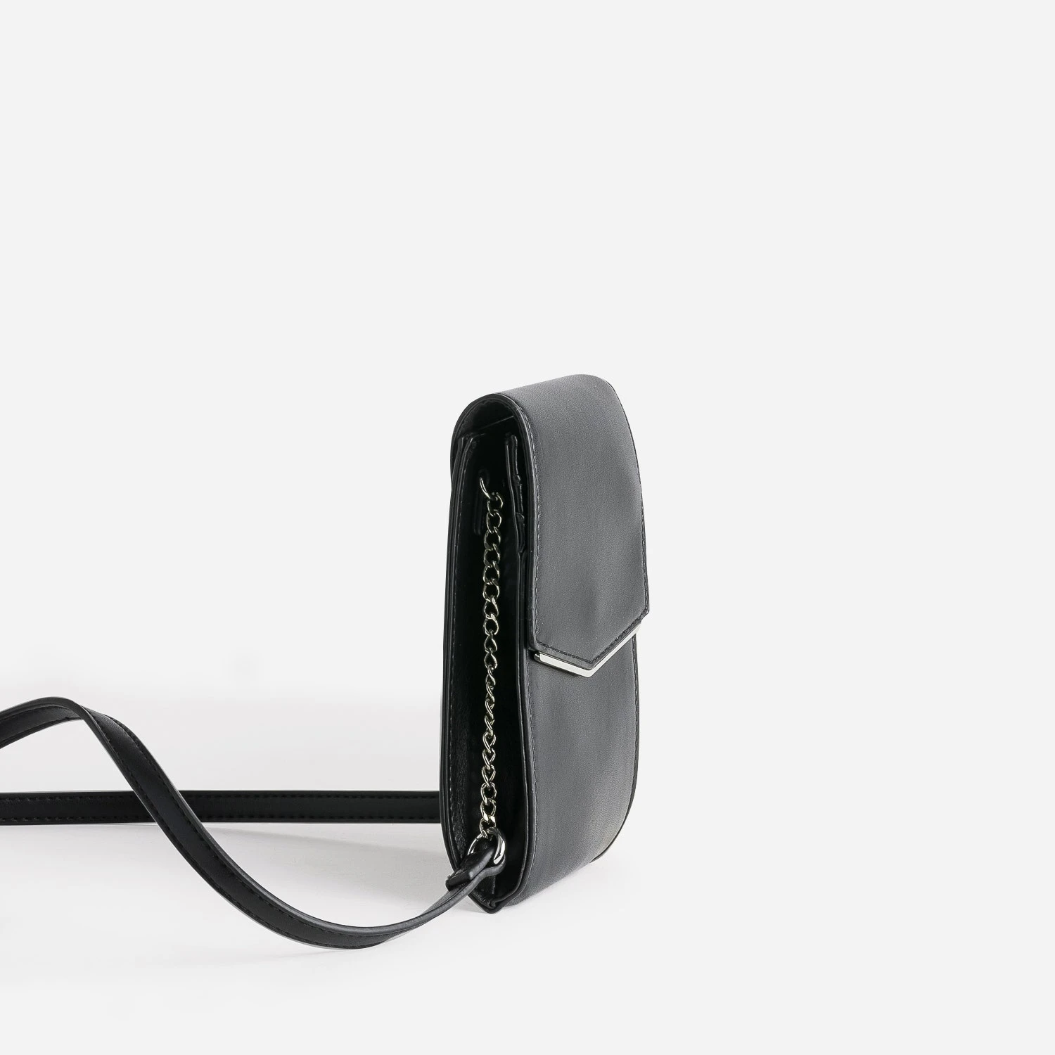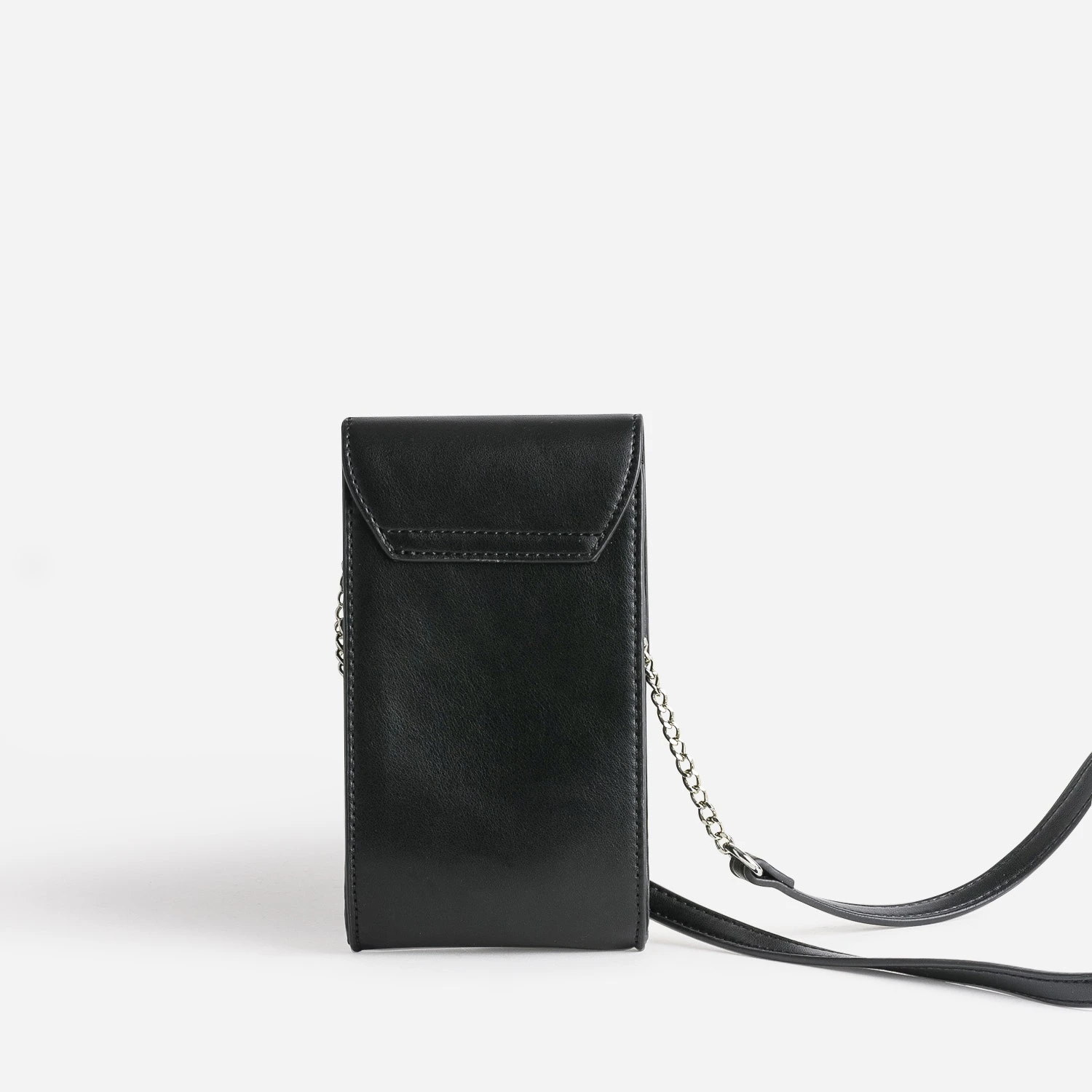 Gardez votre téléphone et quelques cartes toujours à portée de main, c’est l’idée de cette pochette à placer autour du cou, sur l’épaule ou croisée, grâce à sa bandoulière bi matière. En matière synthétique noir, elle gagne en style, par sa barrette métal en V, placée sur le bord du rabat.
