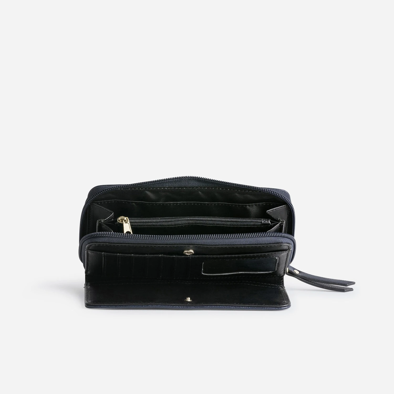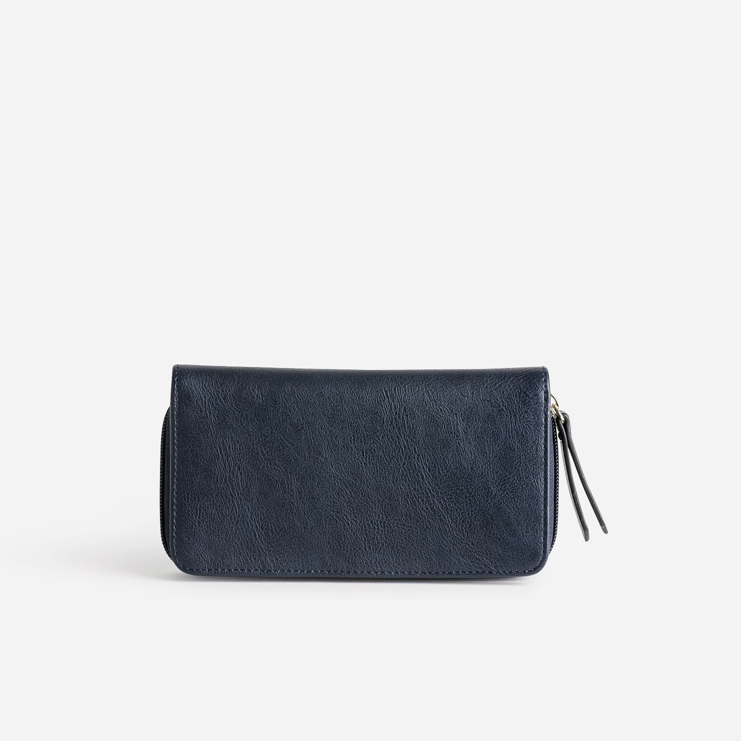 Des fentes pour les cartes, des compartiments pour les billets, une poche zippée pour la monnaie, et des espaces libres pour les papiers : ce portefeuille est étudiée pour vous accompagner, au quotidien. En matière synthétique, il séduit par son coloris sobre bleu marine.