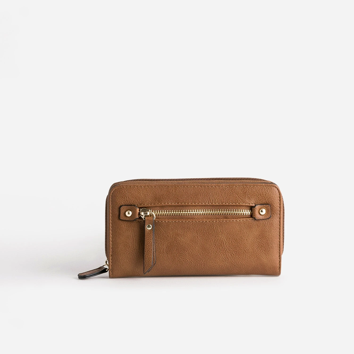 Monnaie, billets, cartes : il y a, dans ce portefeuille, de la place pour tout. En matière synthétique camel, il séduit par sa poche externe zippée, décorée, de part et d’autre, de clous dorés. Sobre et intemporel, il s’impose en accessoire indispensable du quotidien, en toutes saisons.