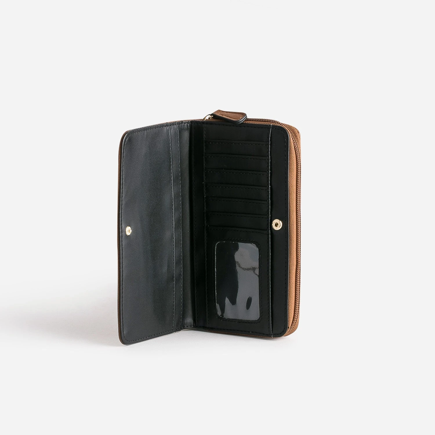 Fermeture par zip et pression. 1 compartiment central zippé. 6 compartiments pour billets. 7 fentes pour cartes. 1 poche externe zippée.