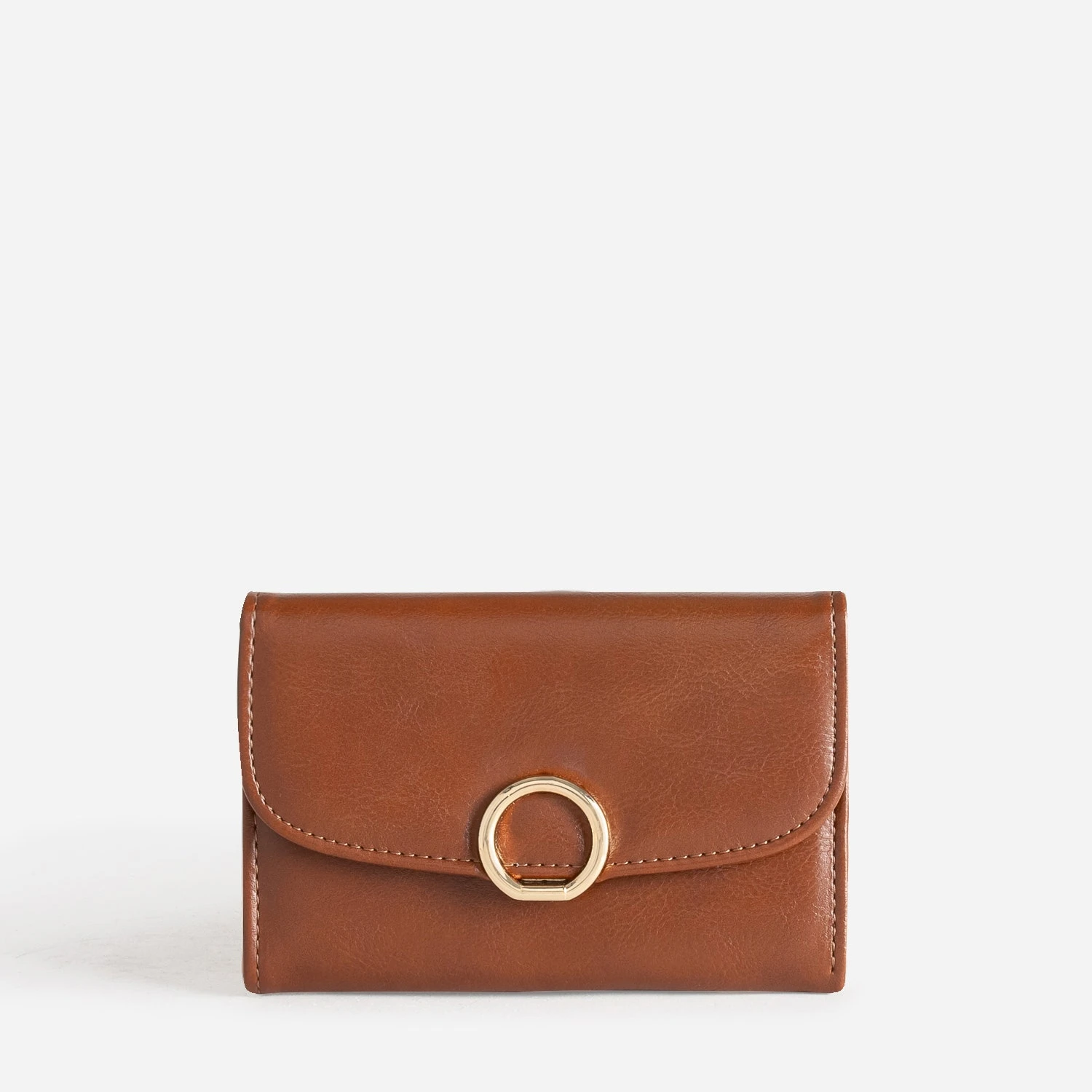 Ni trop grand, ni trop petit, ce portefeuille se glisse facilement dans votre sac à main. En matière synthétique lisse, il affirme son chic par un coloris cognac et un anneau en métal doré, posé sur le rabat. A l’intérieur, compartiment zippé, compartiment à billets, compartiments à papiers, fentes pour cartes : tout est pensé pour optimiser le rangement, en toute sécurité.
