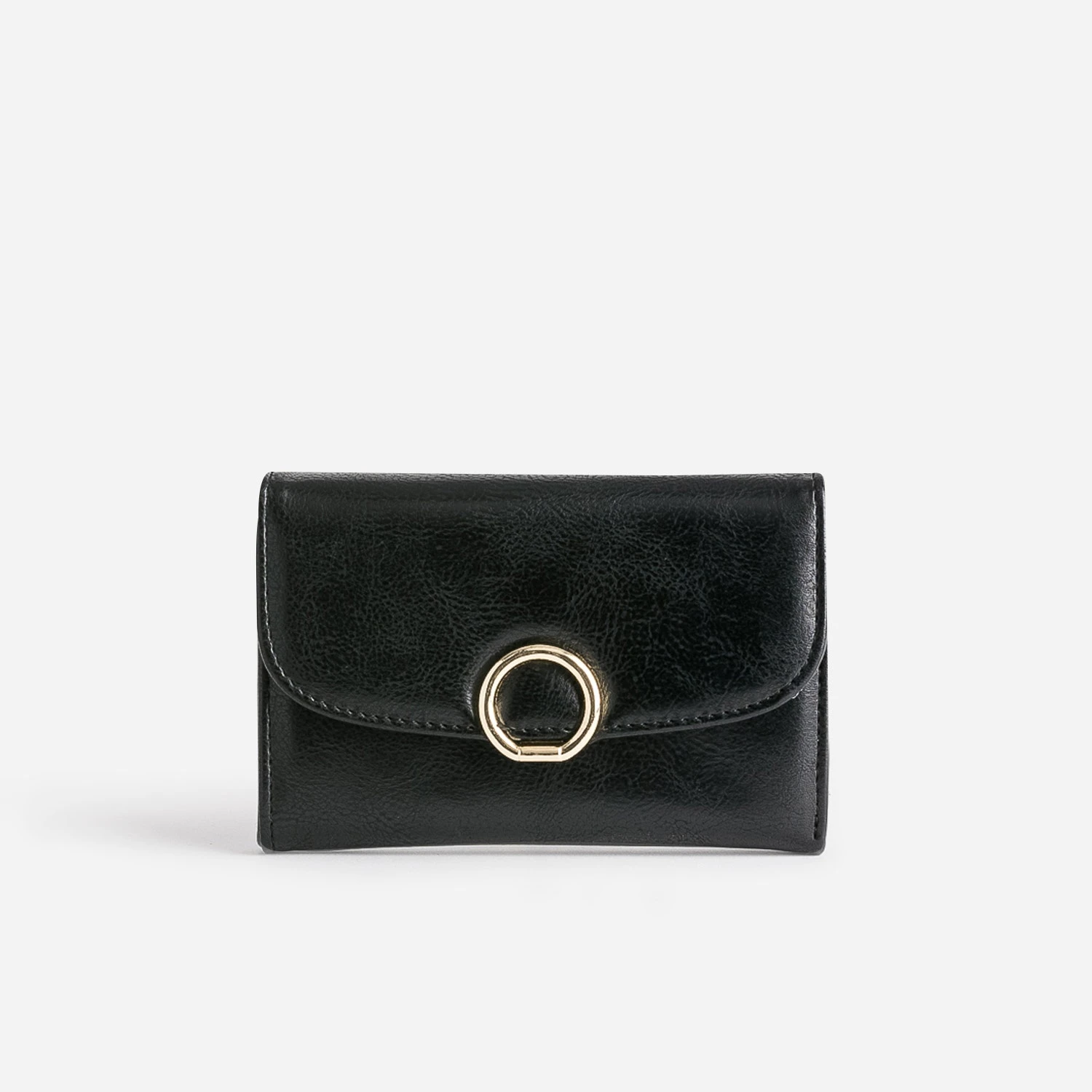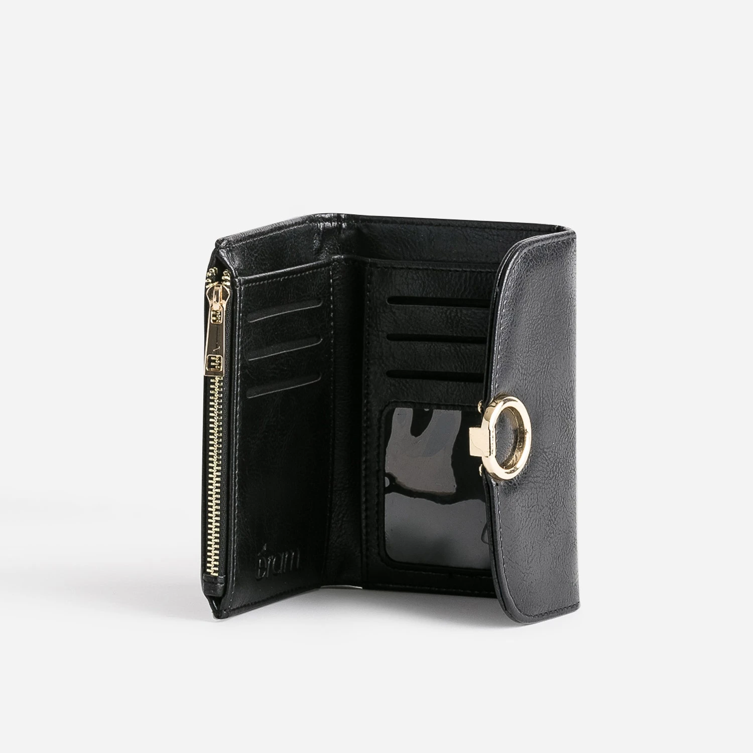 Ni trop grand, ni trop petit, ce portefeuille se glisse facilement dans votre sac à main. En matière synthétique lisse, il affirme son chic par un coloris noir, sobre et intemporel, un anneau en métal doré, posé sur le rabat. A l’intérieur, compartiment zippé, compartiment à billets, compartiments à papiers, fentes pour cartes : tout est pensé pour optimiser le rangement, en toute sécurité.