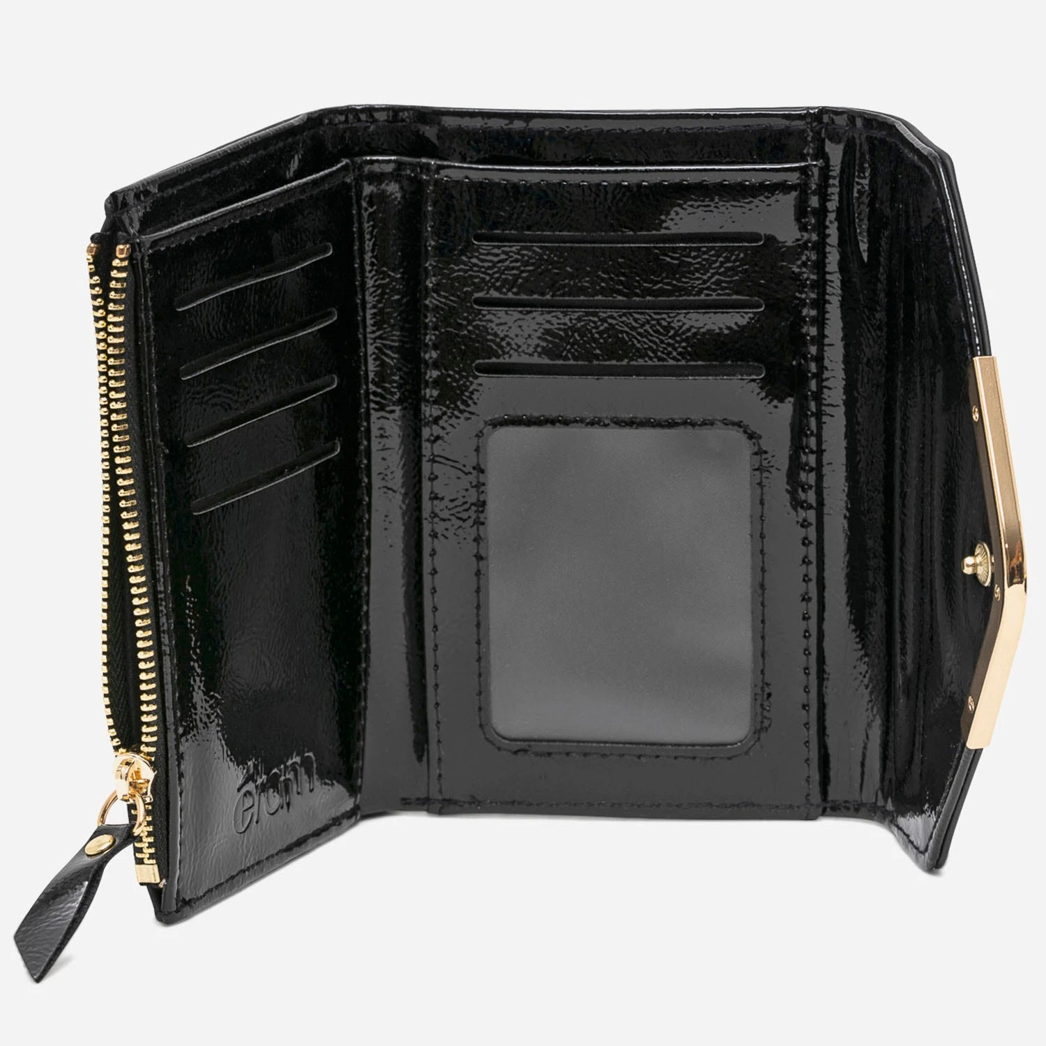Mini format, maxi rangements. Ce portefeuille est pensĂ© pour soulager l’organisation. Sur le cĂ´tĂ©, 1 compartiment zippĂ© pour accueillir la monnaie. A l’intĂ©rieur, 1 compartiment pour billets et 7 fentes pour cartes. C’est votre alliĂ© pour faire du shopping. A choisir ou pas, avec le sac enveloppe noir assorti.Fermeture par pressions. 1 compartiment zippĂ©. 1 compartiment pour billets. 7 fentes pour cartes.Dimensions : 9 cm (l) x 14 cm (l) x 2 cm (p)