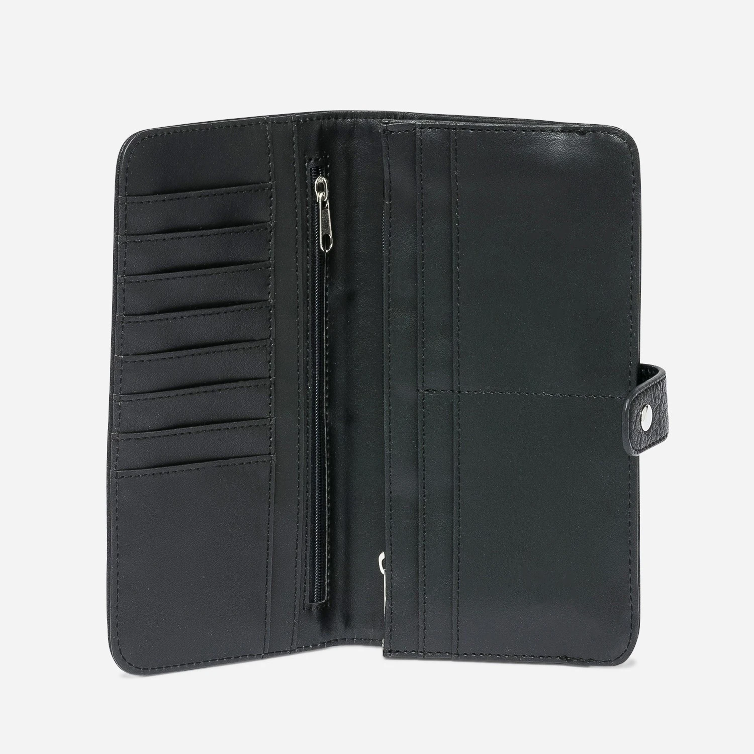 Baguette, stationnement ou nouvelle paire de chaussures, qu’importe la nature de l’achat. Ce portefeuille pour femme mise tout sur l’élégance. La matière synthétique imite le cuir grené à la perfection et le coloris noir reste sobre et intemporel. Un accessoire qui sait joindre l’utile à l’agréable.