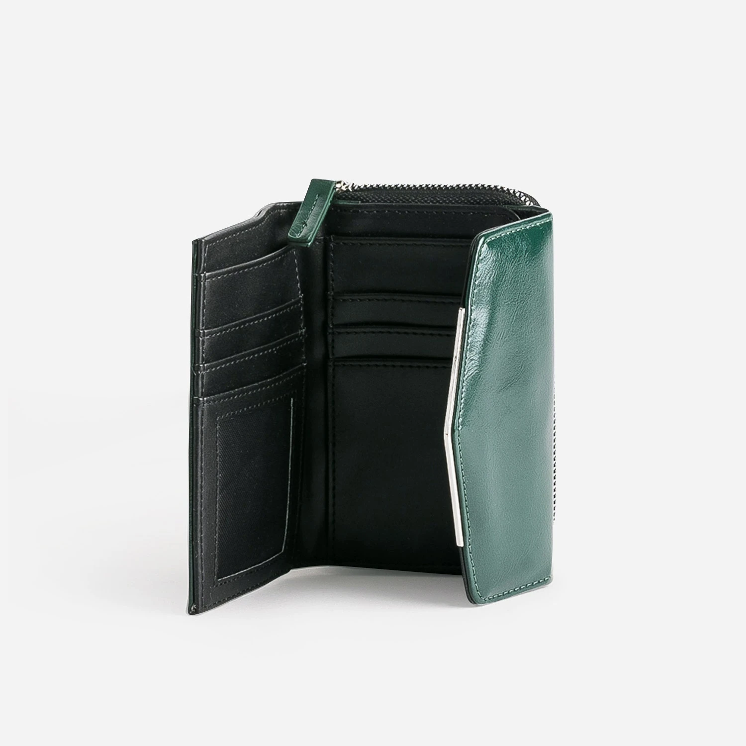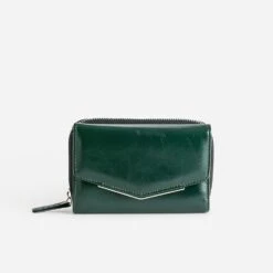 D’un côté, un compartiment zippé, avec deux espaces pour accueillir la monnaie. De l’autre, un compartiment sous rabat pressionné, accueillant billets et cartes dans des fentes dédiées. En matière synthétique vert foncé, ce portefeuille de taille moyenne est décorée d’une barrette en métal argenté sur le bord du rabat. Une signature rock, à glisser dans votre sac à main.
