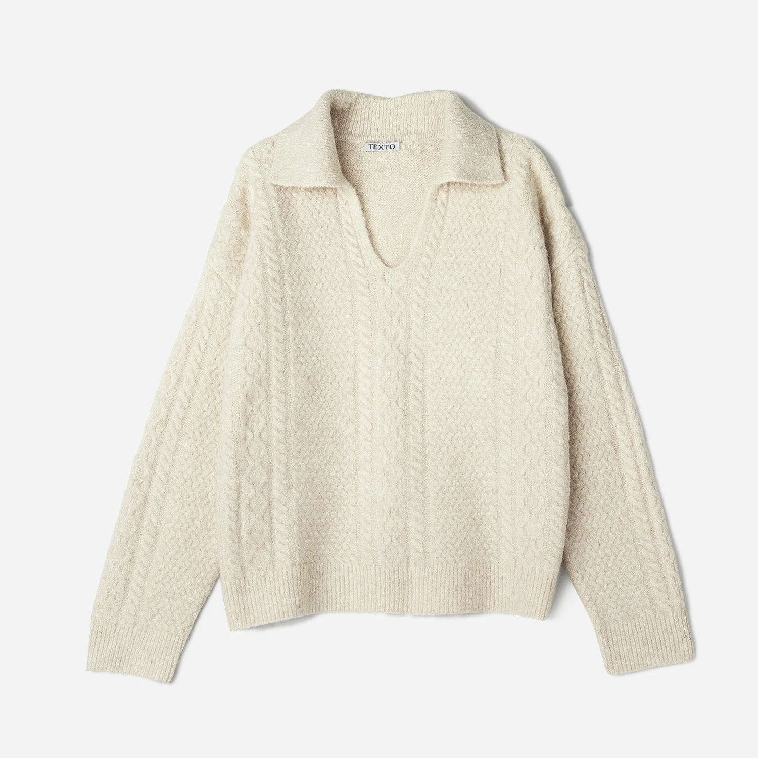 Forme large, encolure V avec col chemise, manches longues, tricot avec points fantaisie, bords-côtes 1×1 au col, manches et buste.