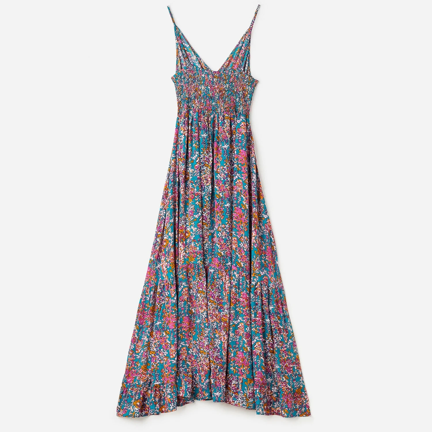Coupe évasée, encolure en V devant, encolure droite au dos, fines bretelles réglables, dos élastiqué avec smocks, doublure, découpe taille avec liens à nouer, découpe bas de robe pour volume, longueur : 147 cm.