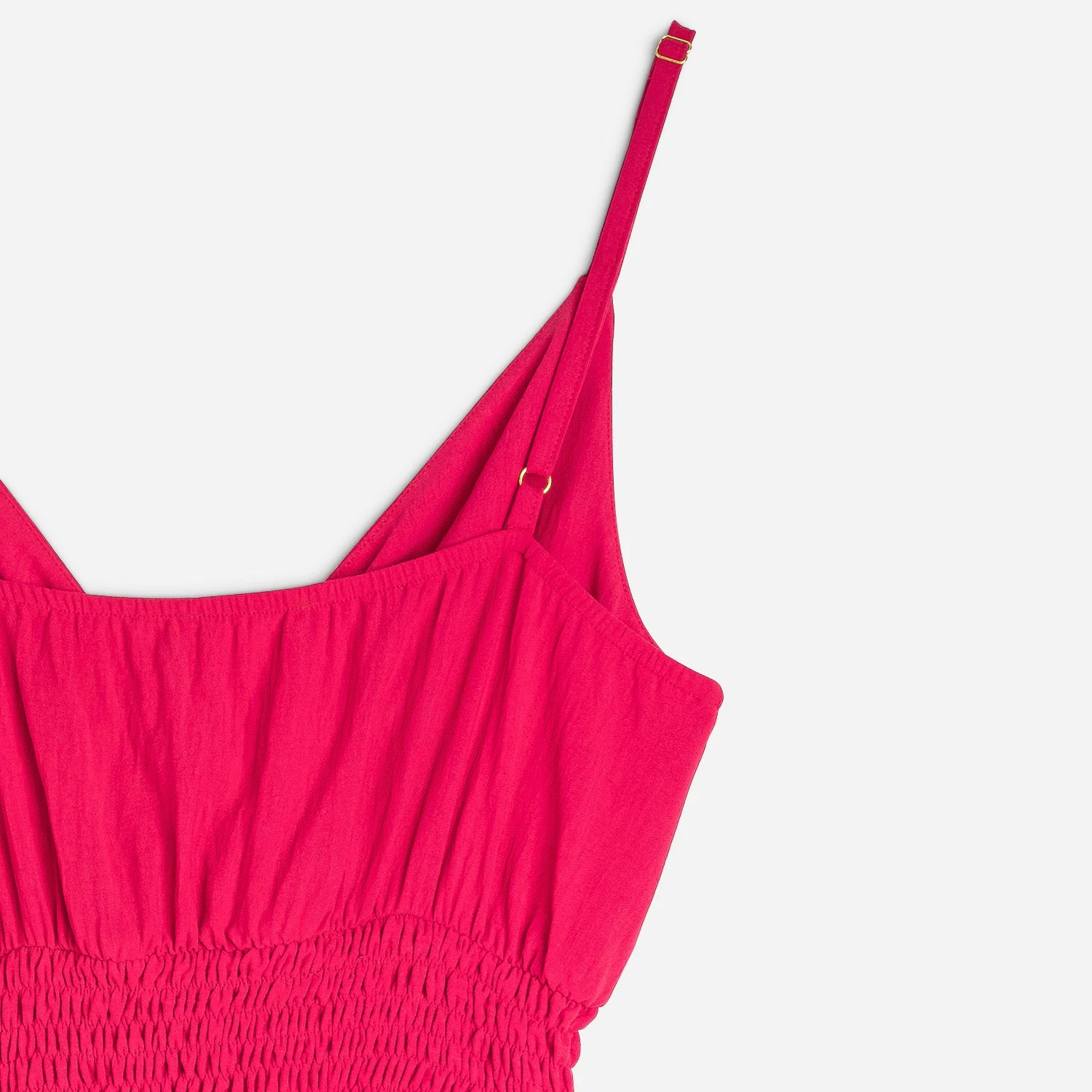 Coupe évasée, encolure en V, fines bretelles réglables, nœud à nouer devant, dos élastiqué, taille élastiquée avec smocks, découpe bas de robe pour volume, longueur : 135 cm.
