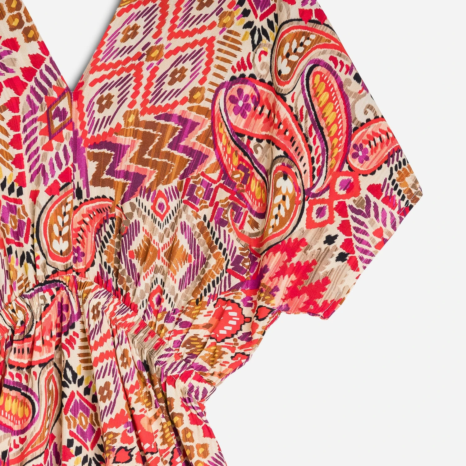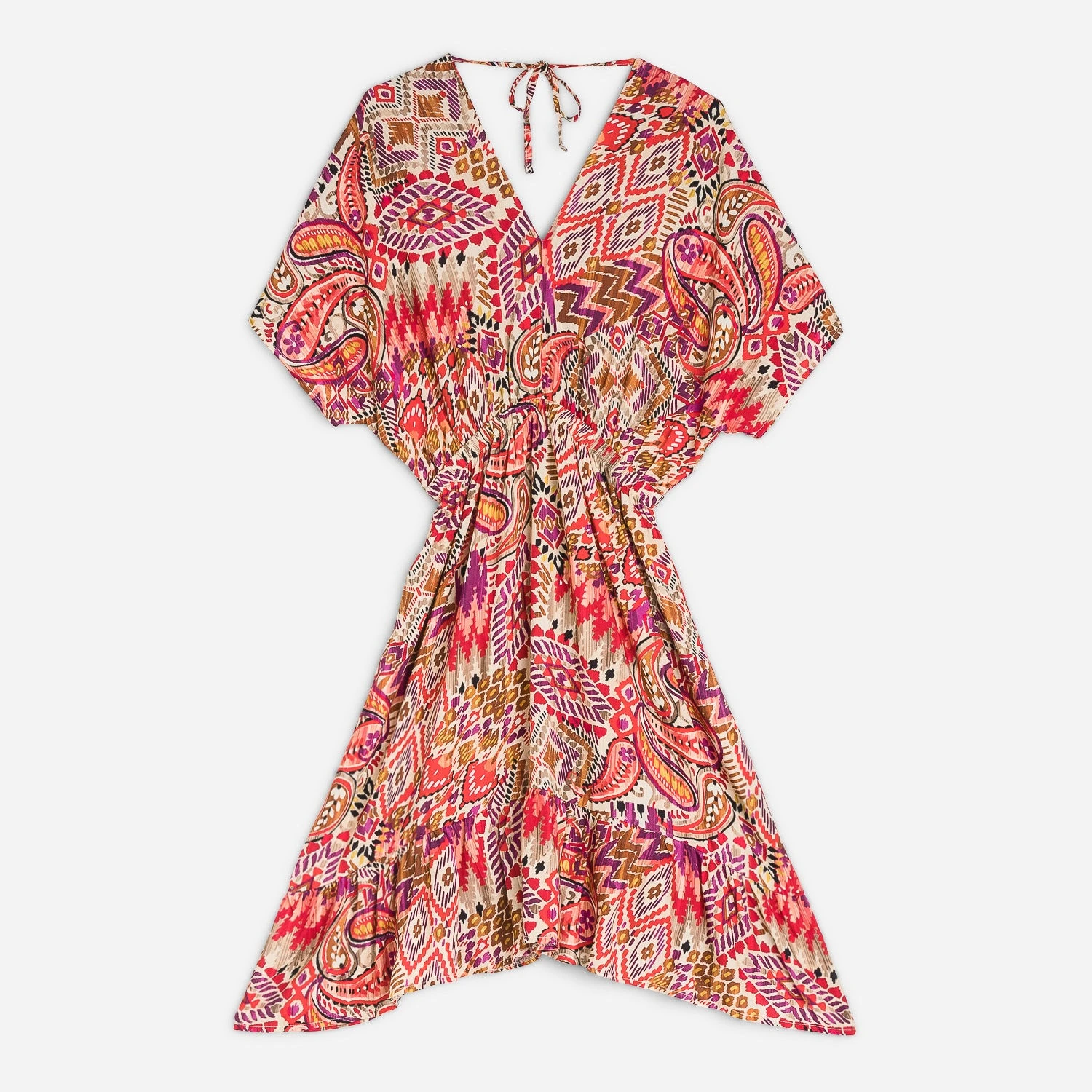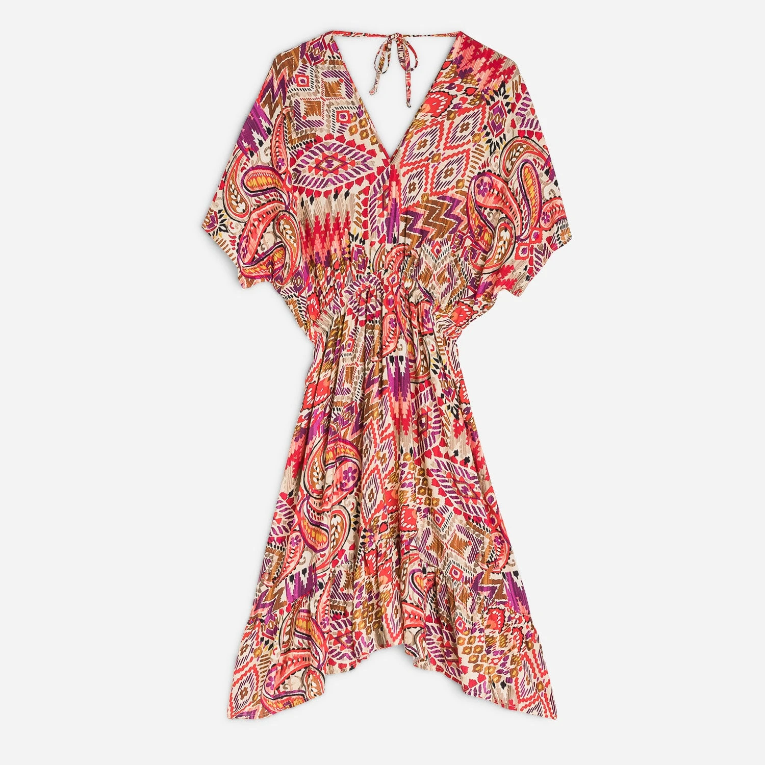 Adoptez le style ethnique aux couleurs d’été, avec cette robe courte et évasée. Rose, violet, rouge, marron, jaune, le motif ikat réveille le fond écru, avec pep’s. Encolure en V devant et dos, taille élastiquée, elle convient à toutes les morphologies.