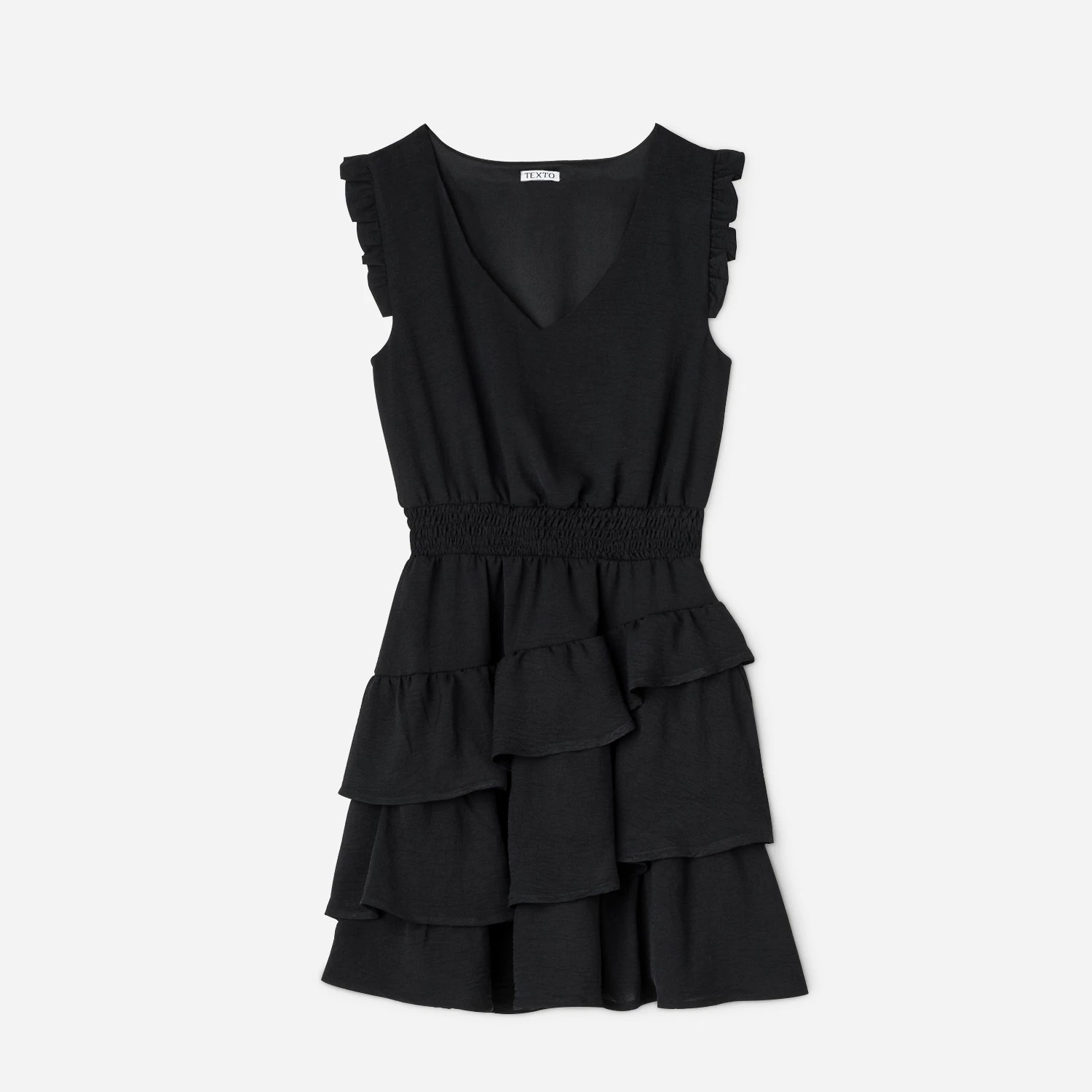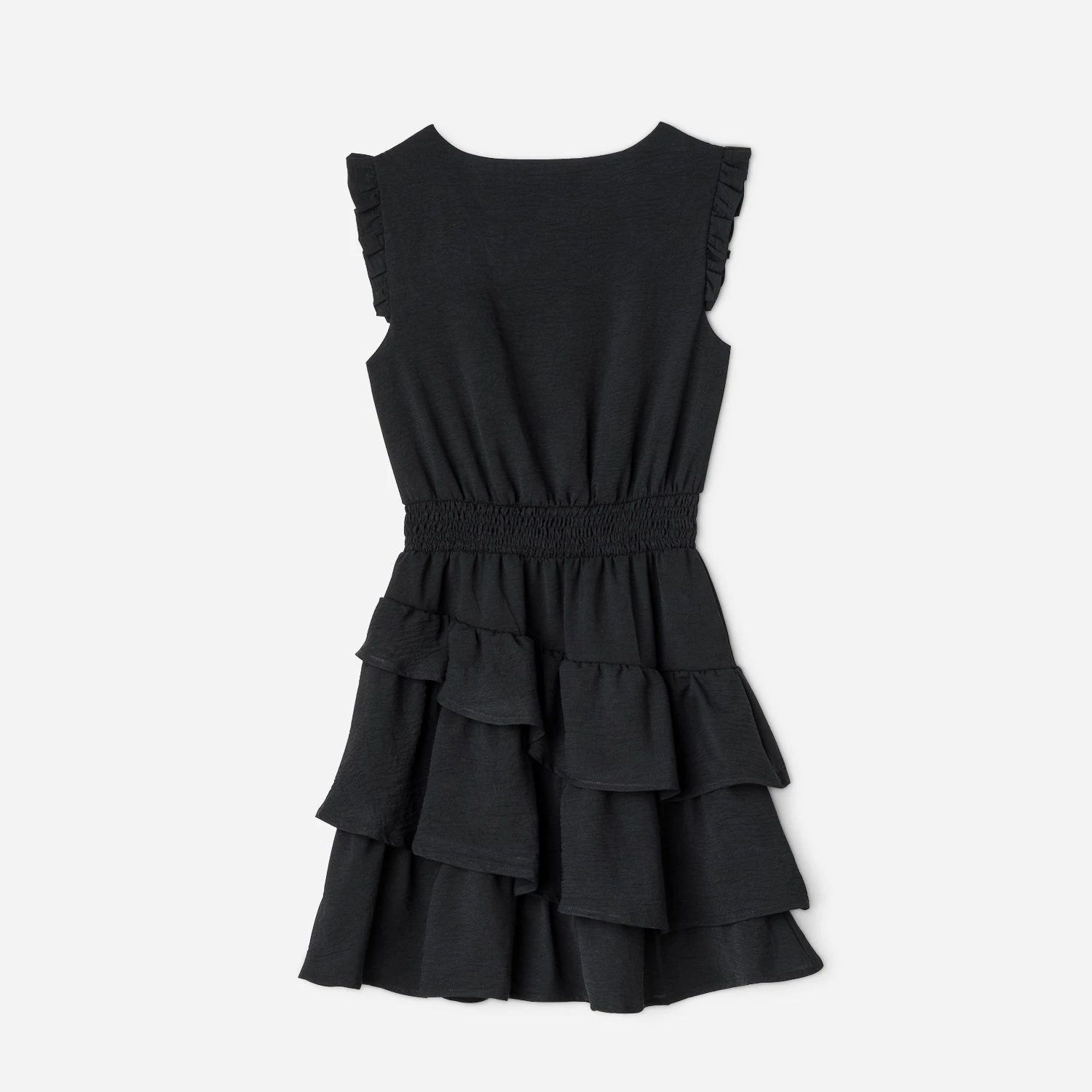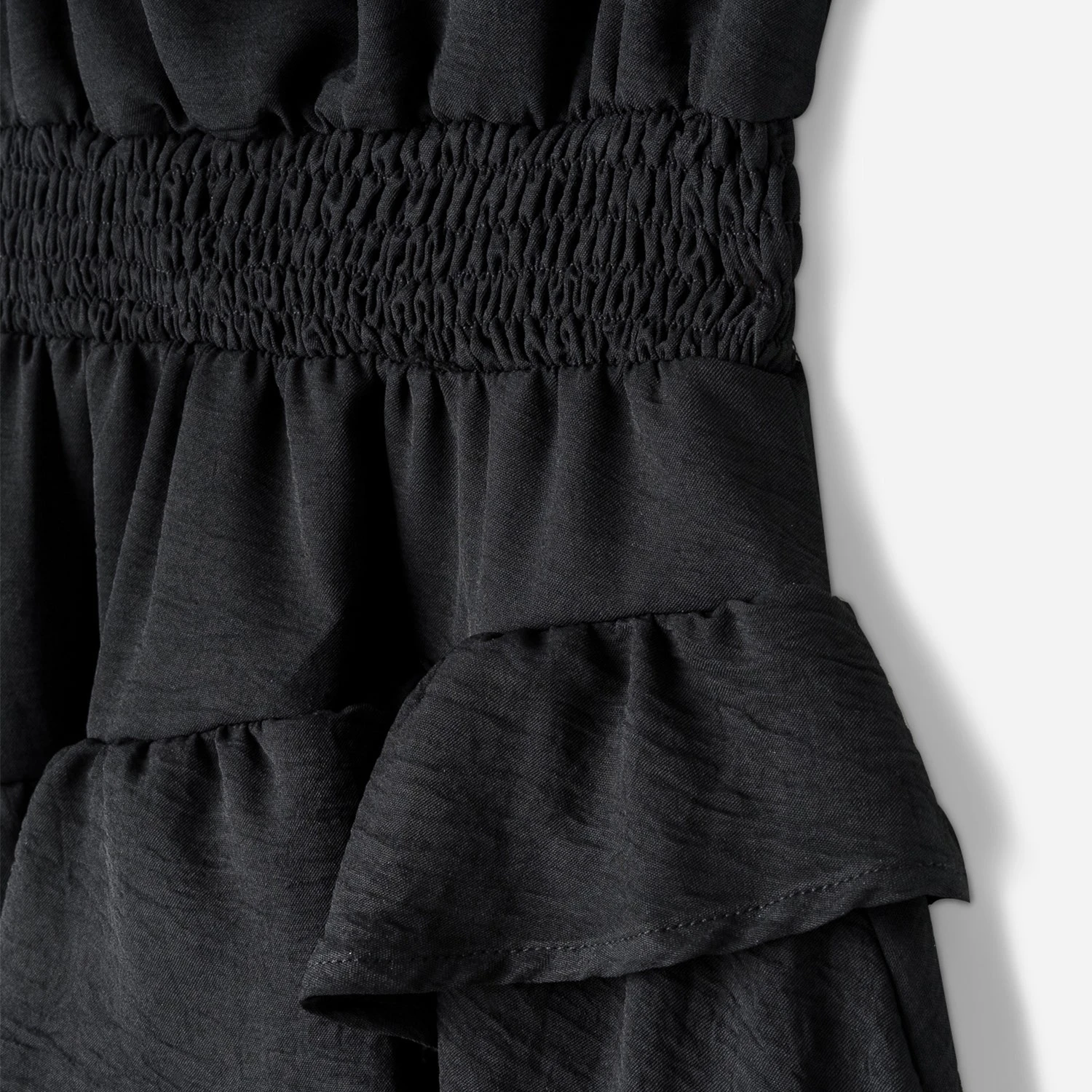 Une coupe évasée mais cintrée à la taille par un large élastique à smocks, une matière fluide, légèrement gaufrée et doublée, un coloris sobre et intemporel, la petite robe noire n’a pas fini de faire parler d’elle. Détails de plis ruchés aux emmanchures, détails de volants sur le bas, elle est votre meilleure alliée, en journée comme en soirée.