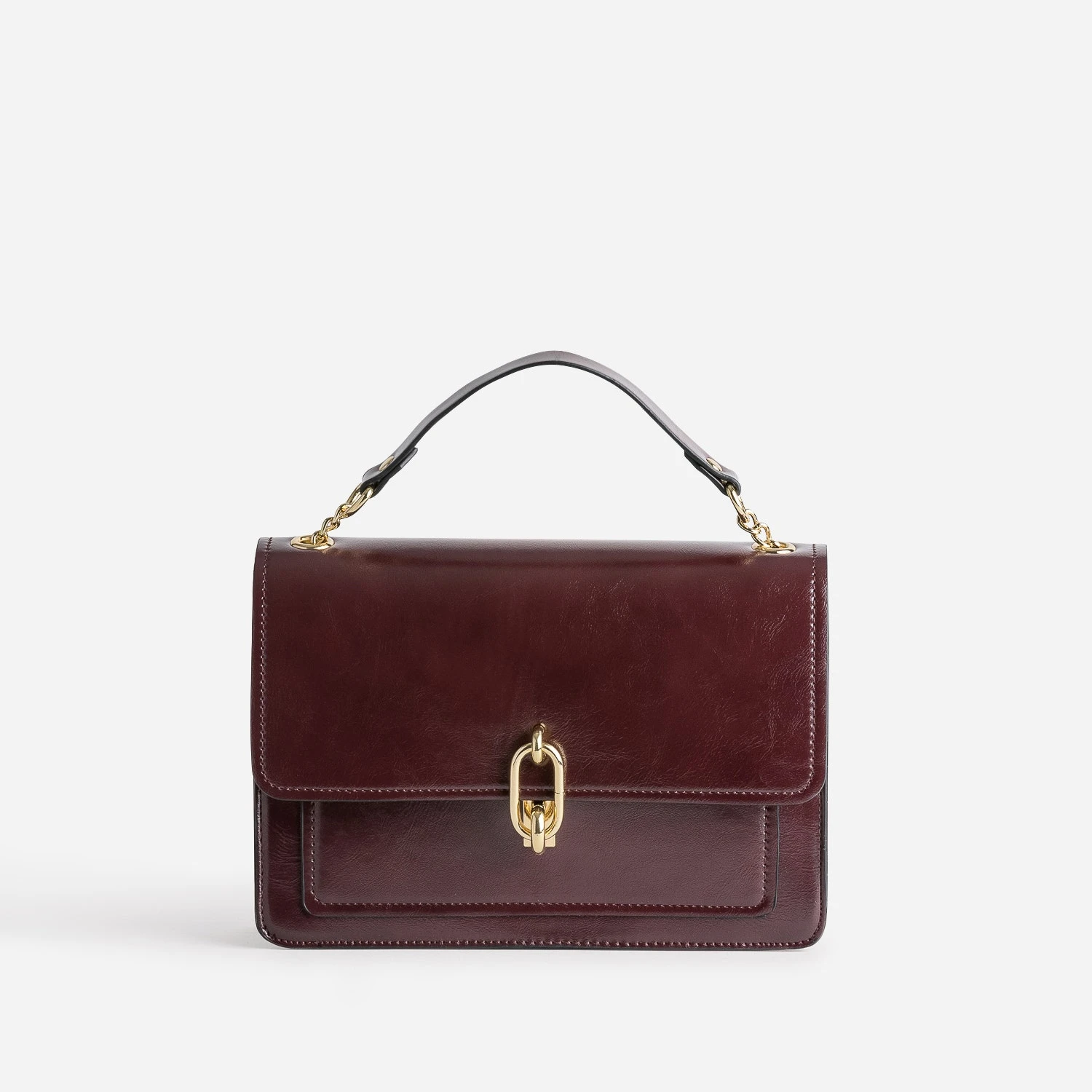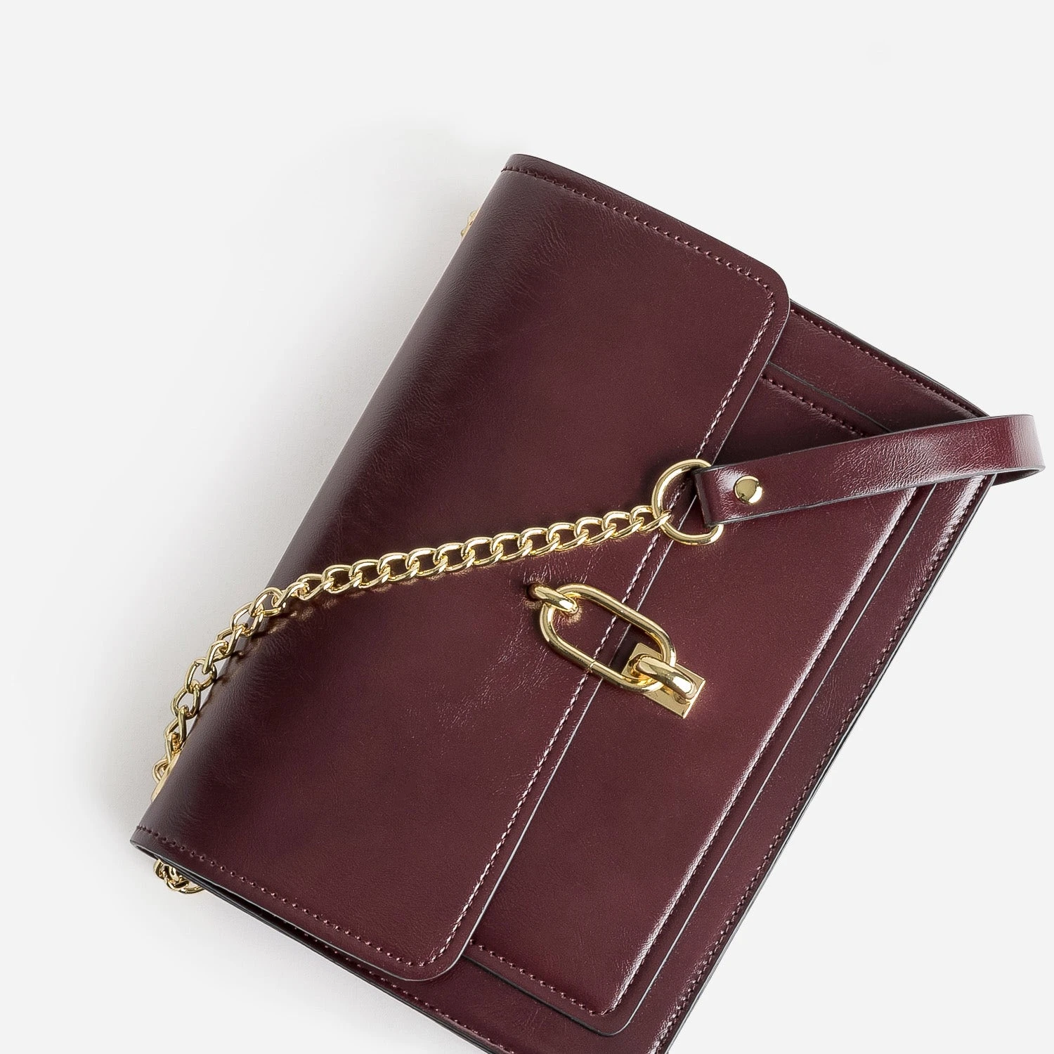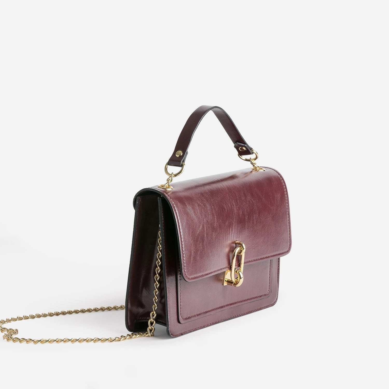 Pour son format ni trop petit, ni trop grand. Pour sa matière synthétique rigide. Pour son coloris bordeaux. Pour ses métalleries dorées. Pour sa fermeture par tourniquet fantaisie. Pour sa bandoulière en chaînette métal, ajustable par un système de coulisse. Qu’importe la raison qui vous fera craquer pour ce sac à main : il est irrésistible. Forcément. Il signe une allure chic, un peu Madame. Evidemment.