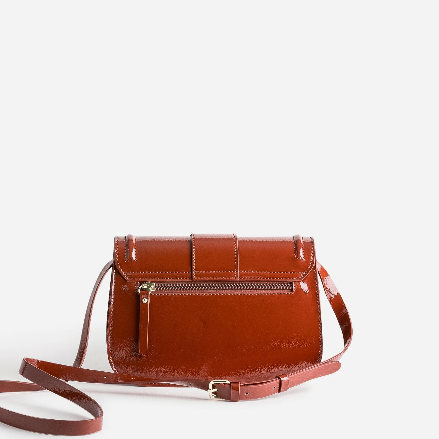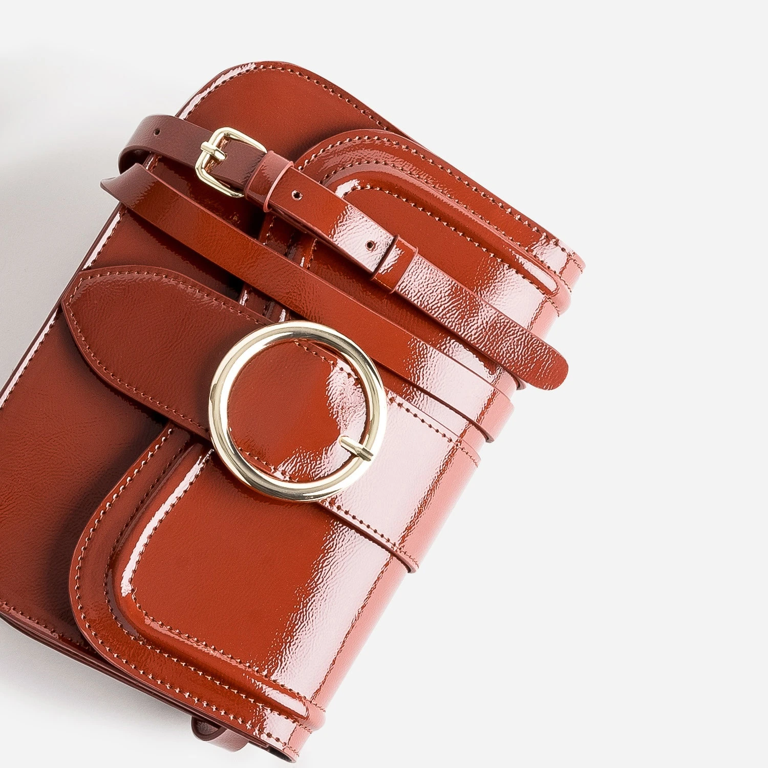 Le sac à main est le ‘compagnon’ le plus présent dans votre quotidien. Choisissez-le bien ! D’abord, son format : ni trop petit, ni trop grand, juste idéal pour y glisser vos effets personnels. Ensuite, sa matière : du synthétique lisse, sublimé par un coloris cognac. Enfin, ses détails : une finition vernie, et sur le rabat, une large bride avec maxi boucle ronde en métal doré. La bandoulière réglable permet aussi un porté sur l’épaule ou croisé, pour s’adapter à vos activités.