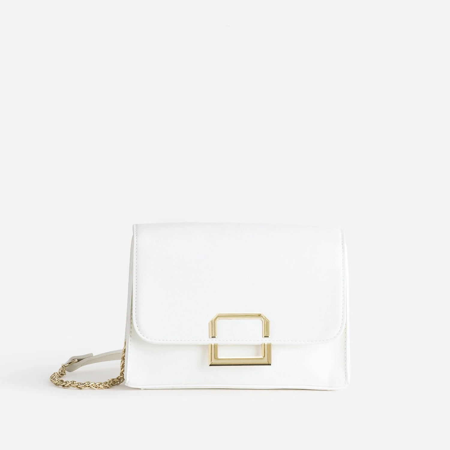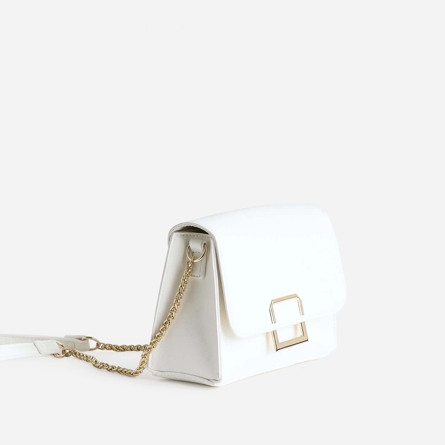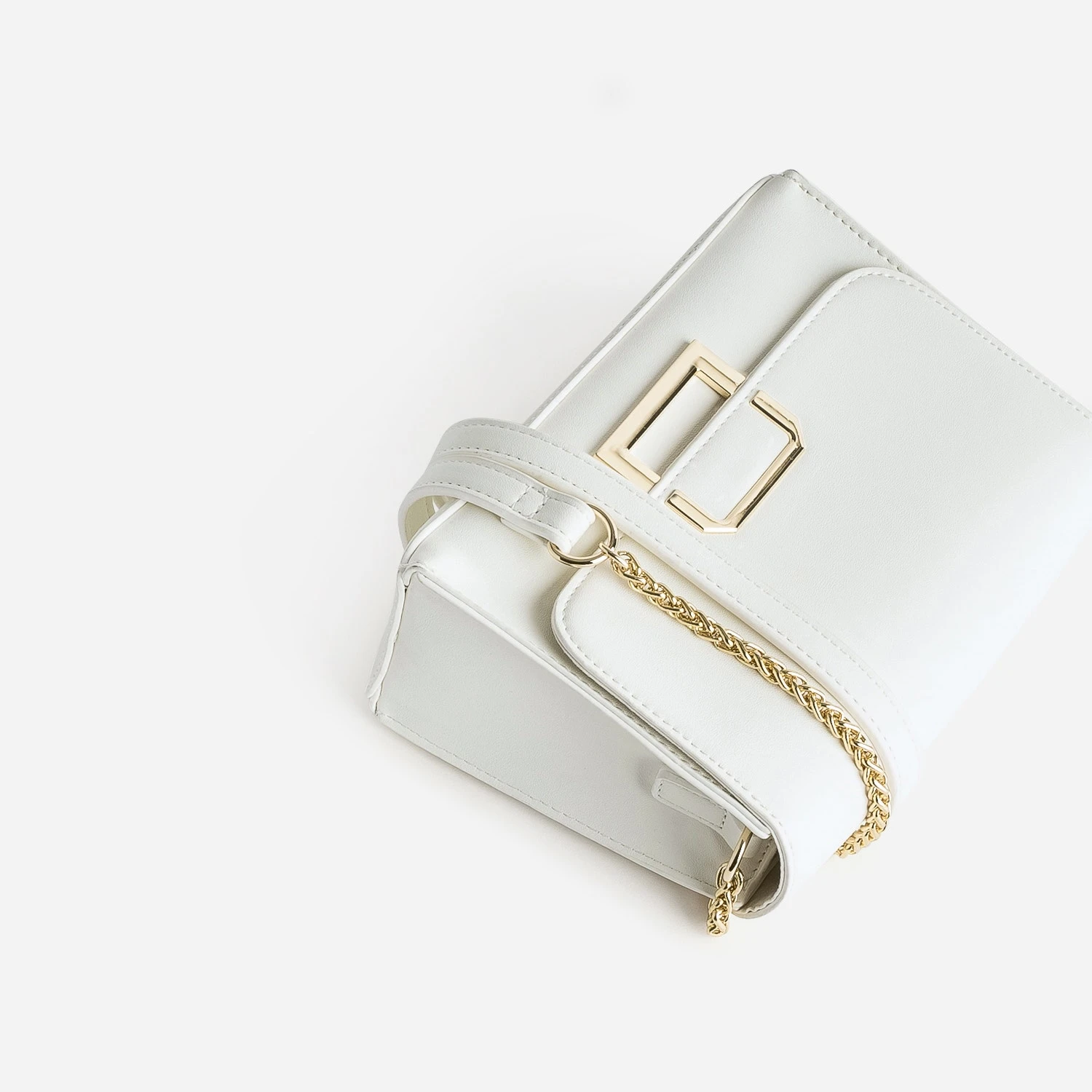 L’allure se fait printemps. Et le sac à main, terriblement élégant. En matière synthétique écrue, il présente un petit format rectangulaire, rehaussé de métalleries dorées, sur le rabat et sur la bandoulière bi matière. Idéal pour une cérémonie, il s’invite aussi, dans les tenues du quotidien, avec des teintes pastel ou naturelles.