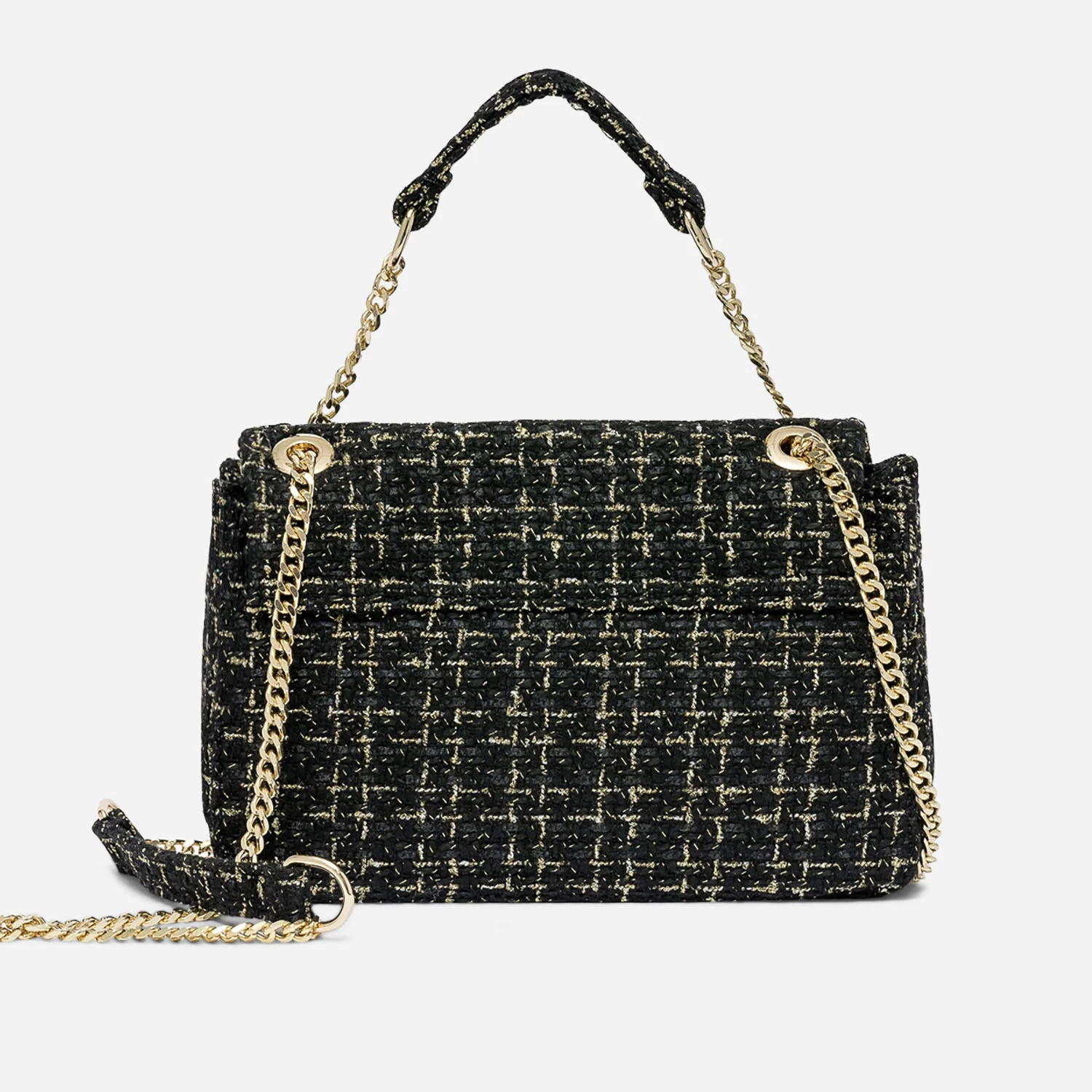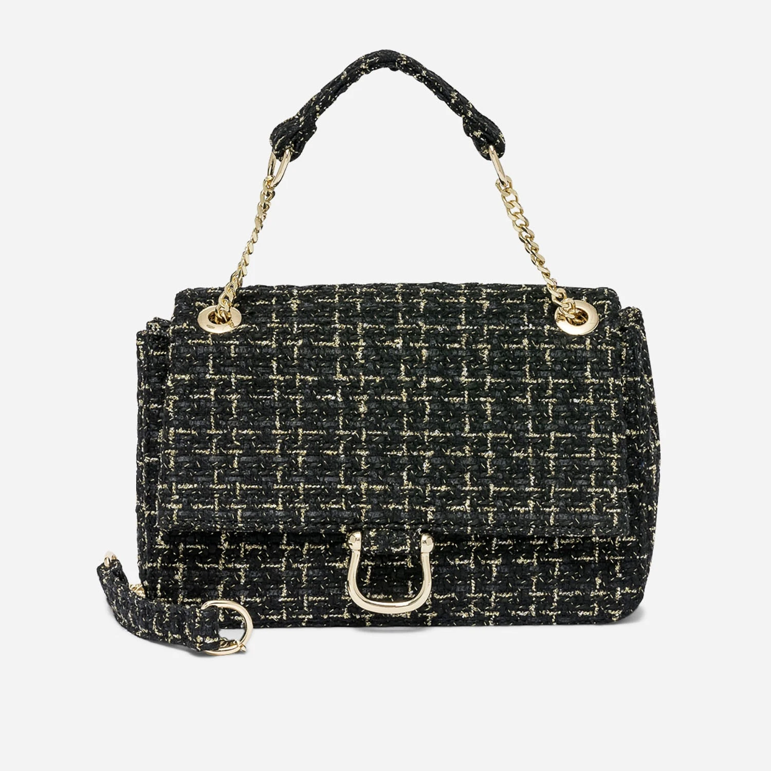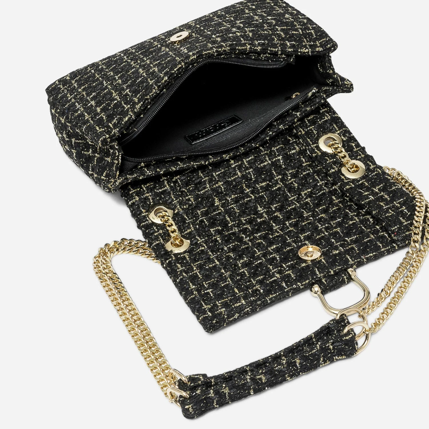 Plutôt chargé, l’esprit baroque n’est pas toujours facile à apprivoiser. Pour vous familiariser, privilégiez les accessoires. Ce sac à main pour femme revendique ainsi une nouvelle modernité. Séduisant par son format moyen, idéal au quotidien, il est confectionné dans un textile à carreaux façon tweed, très couture, dans les tons noir et or. Son système de bandoulière coulissante permet un porté sur l’épaule court ou long, voire même croisé. S’il matche à la perfection avec un look très chic, robe fourreau et talon aiguille, ce modèle s’adapte aussi parfaitement à un style plus casual, en total look jean et boots ou costume et sneakers sport.
