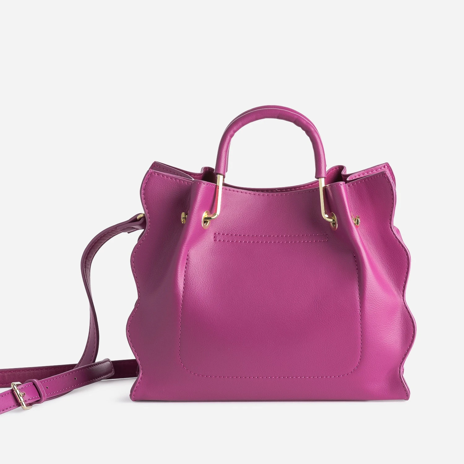 Il revient cet été ! Décliné en coloris rose foncé, sur une matière synthétique lisse, ce sac à main se démarque par des bords à finition vague et deux anses rigides montées sur métallerie dorée. Livré avec une bandoulière réglable et amovible, il se porte sur l’épaule ou croisé, de préférence avec un look sophistiqué.