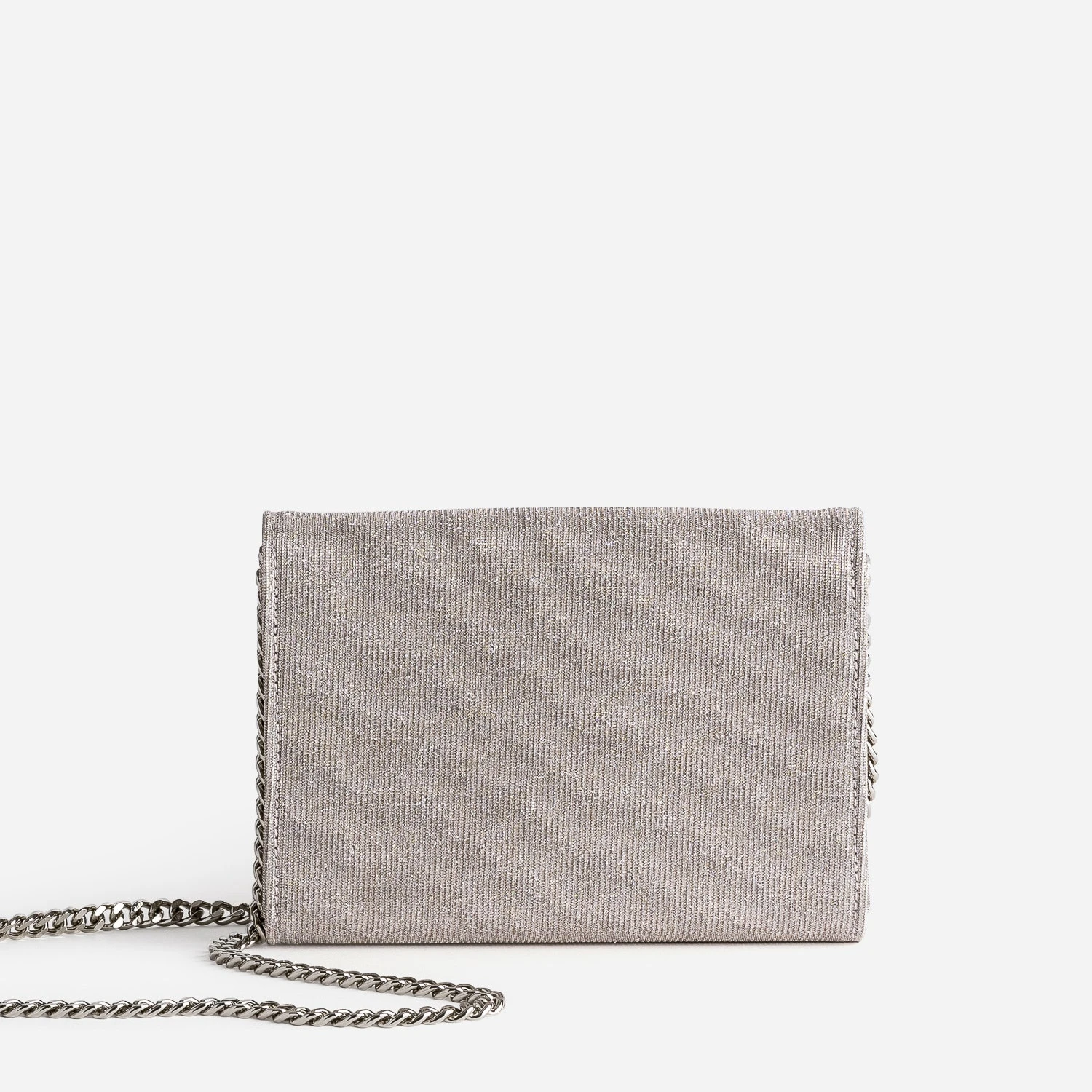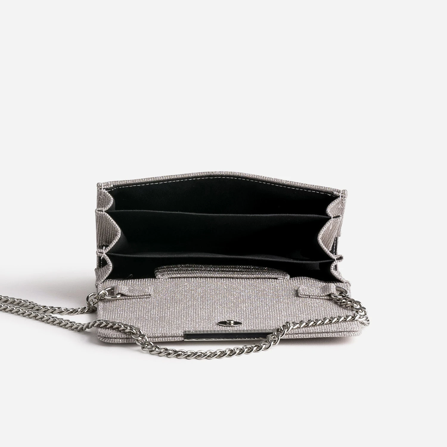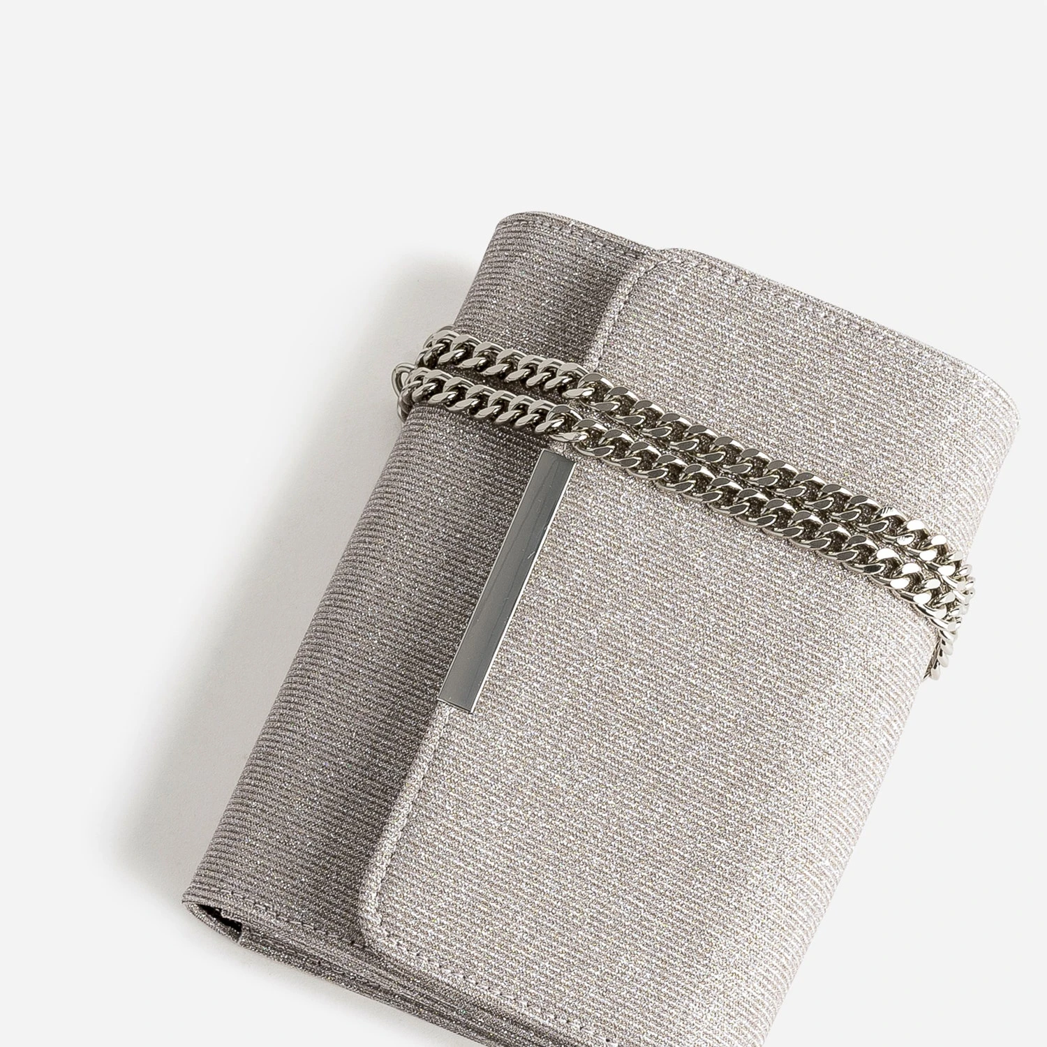 Fermeture par aimant. 3 compartiments, avec 4 fentes internes pour cartes. Bandoulière-chaînette non réglable non amovible.