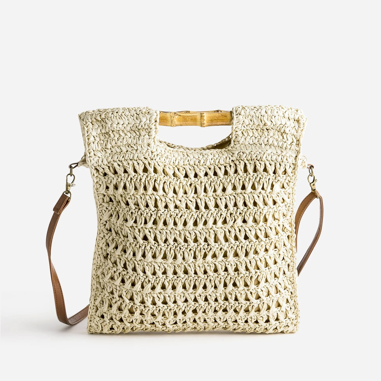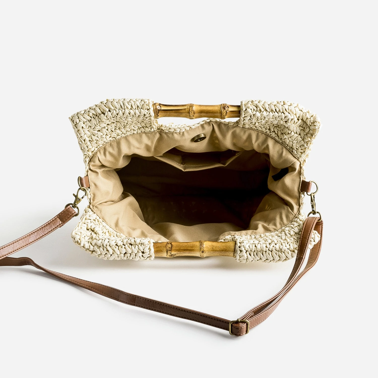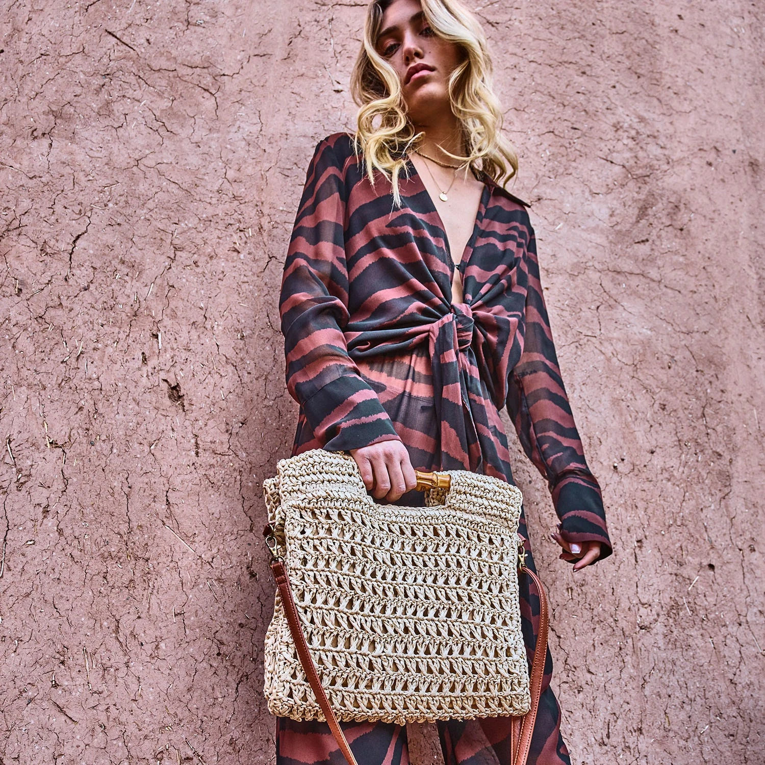 Un format presque carré. Un coloris neutre. Une matière naturelle en papier tressé. Pas de doute. Ce sac à main revendique un style bohème chic, très à la mode cet été. Les poignées inspirées des bambou permettent un porté main, et la bandoulière réglable et amovible, un porté sur l’épaule ou croisé. Un modèle à imaginer avec une veste de blazer marine, un tee-shirt blanc et un jean flare bleu.