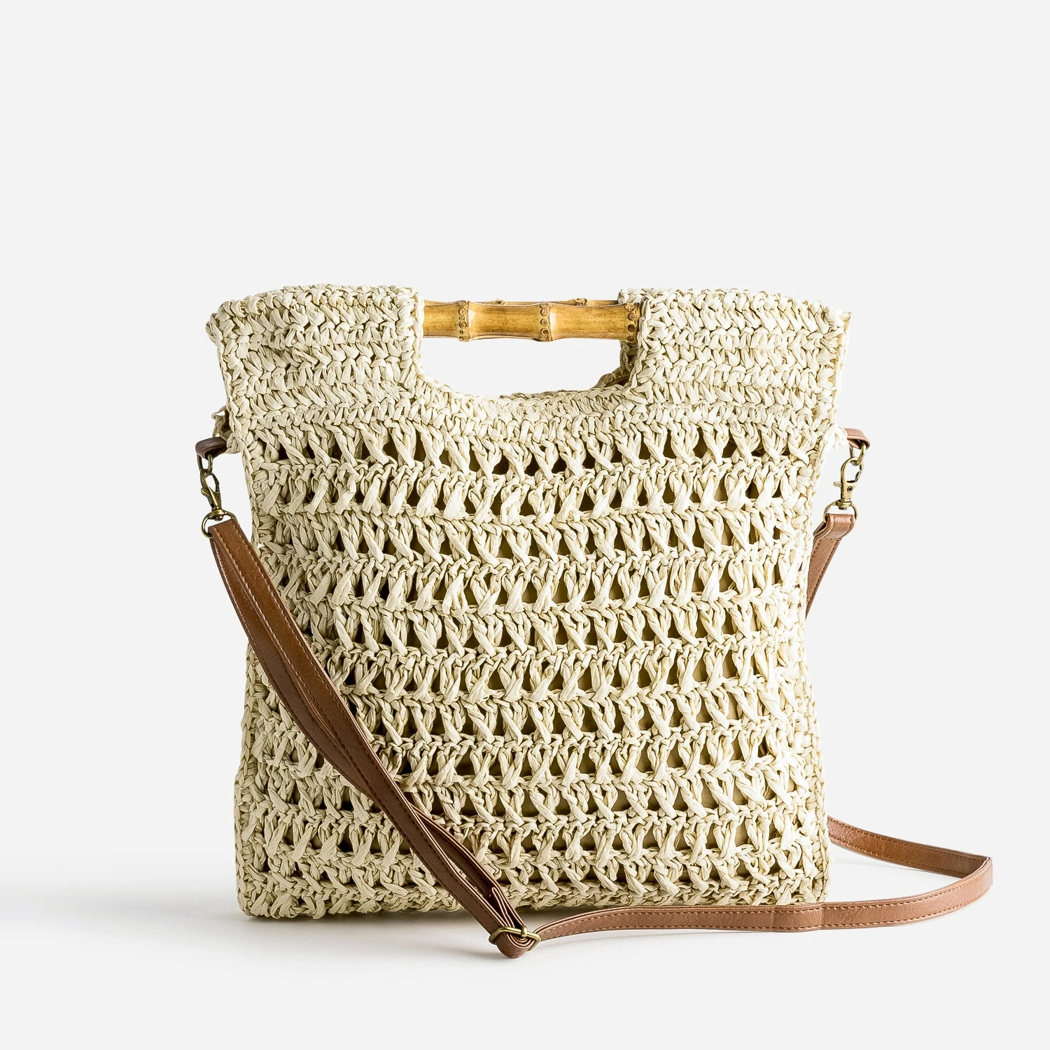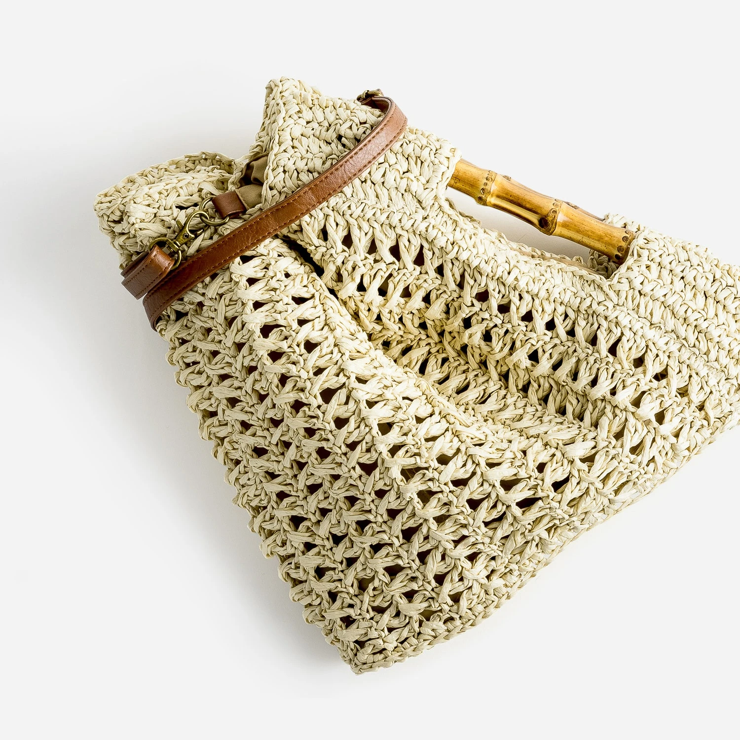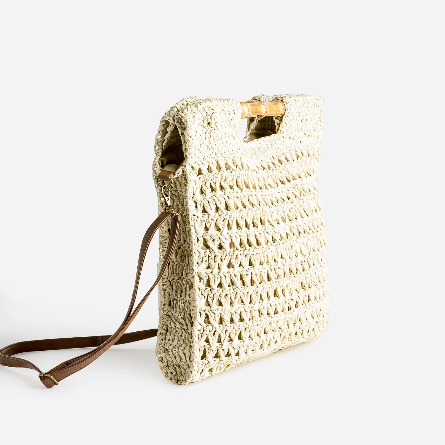 Un format presque carré. Un coloris neutre. Une matière naturelle en papier tressé. Pas de doute. Ce sac à main revendique un style bohème chic, très à la mode cet été. Les poignées inspirées des bambou permettent un porté main, et la bandoulière réglable et amovible, un porté sur l’épaule ou croisé. Un modèle à imaginer avec une veste de blazer marine, un tee-shirt blanc et un jean flare bleu.
