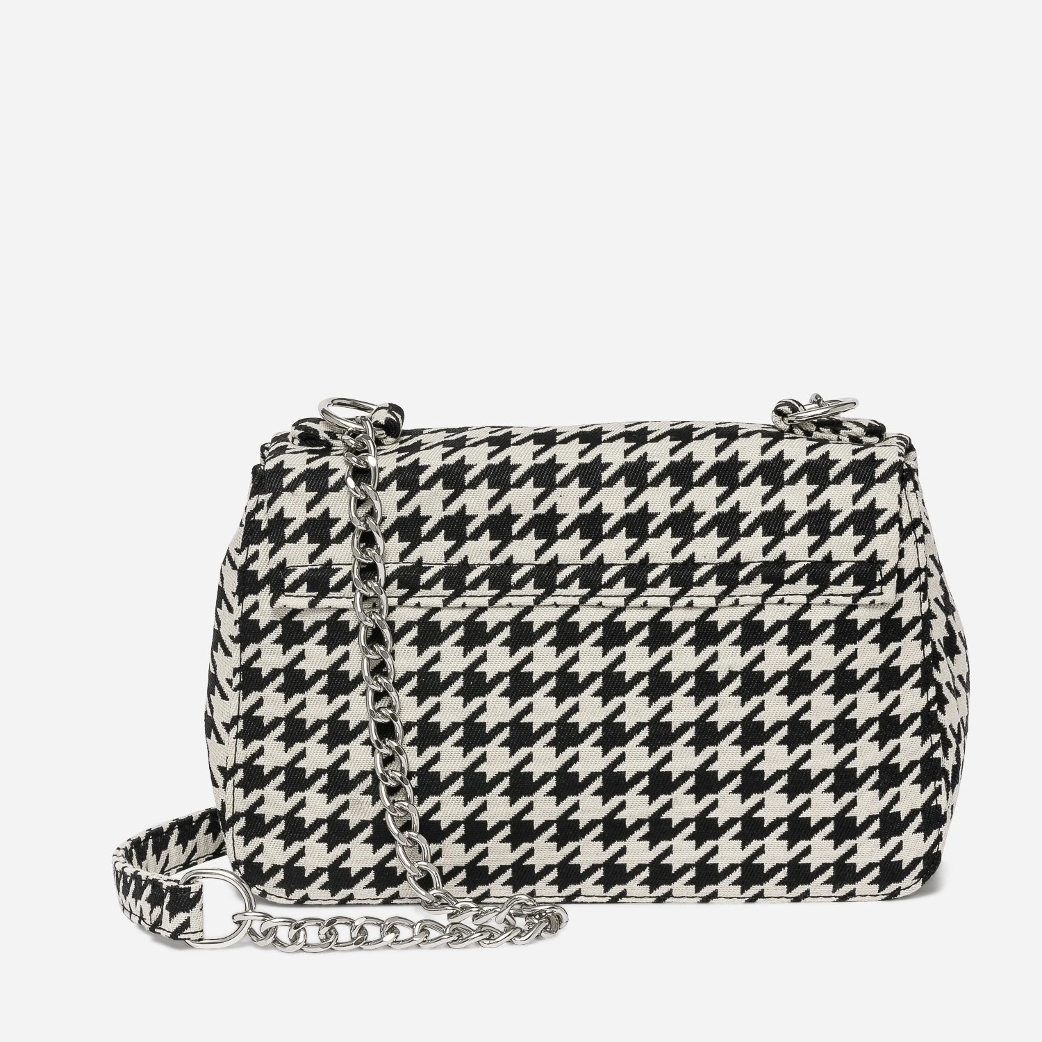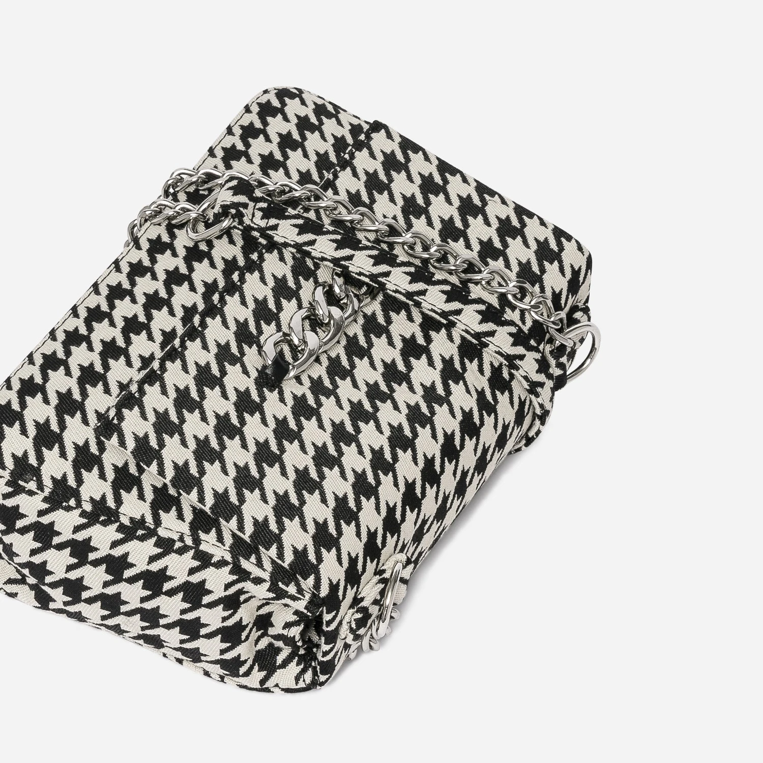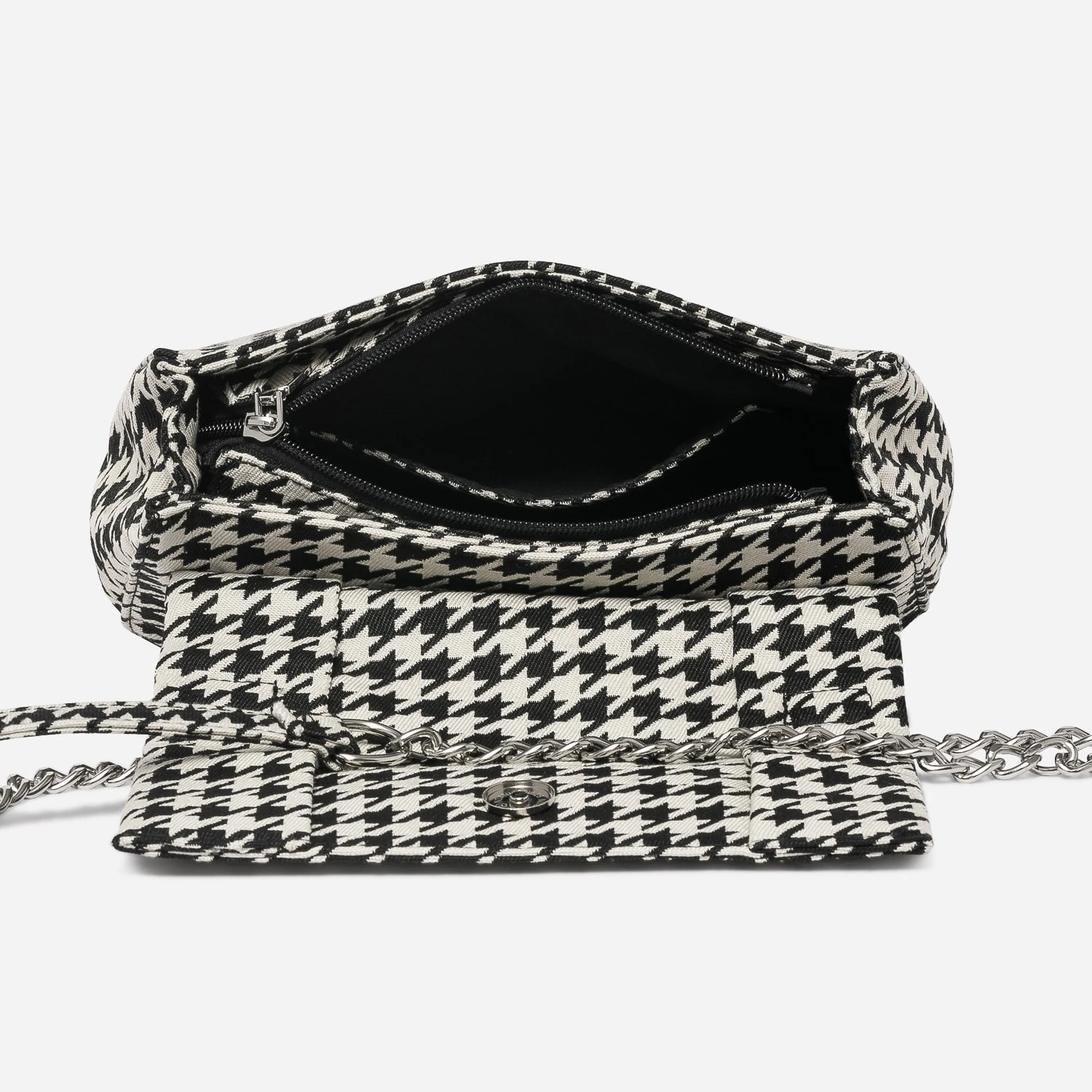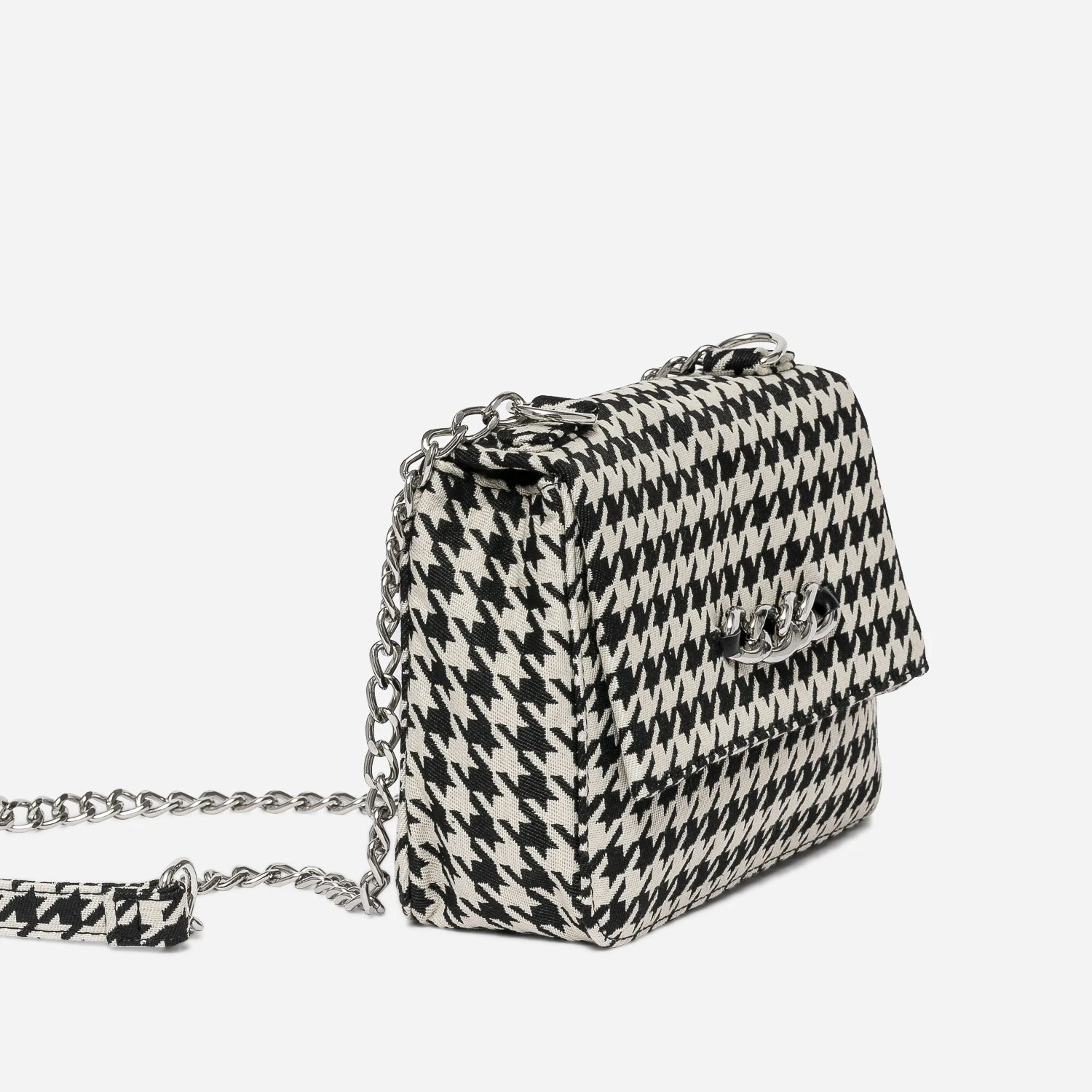 Twist rétro chic demandé. Twist rétro chic confirmé. Le motif pied-de-poule, grand gagnant parmi les imprimés phares de la saison, s’approprie le sac à main pour femme, jusqu’à la bandoulière bi matière. Devant, une maxi chaîne-bijou décore le rabat, en faisant écho aux métalleries argentées. Un accessoire à préférer avec un total look noir ou blanc, ou, plus osé, avec un autre imprimé dans les mêmes tons.