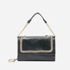 Qu’attendez-vous de votre sac à main ? La fonctionnalité d’abord, avec un compartiment et 2 poches internes dont 1 zippée, et 1 poche externe zippée. L’esthétisme ensuite, avec sa matière synthétique noire à finition glacée et décor de chaînette-bijou sur le rabat. Sans compter sur son petit format, pour voyager léger, et son coloris noir, facile à coordonner. Un modèle, pile dans les tendances mode du moment.