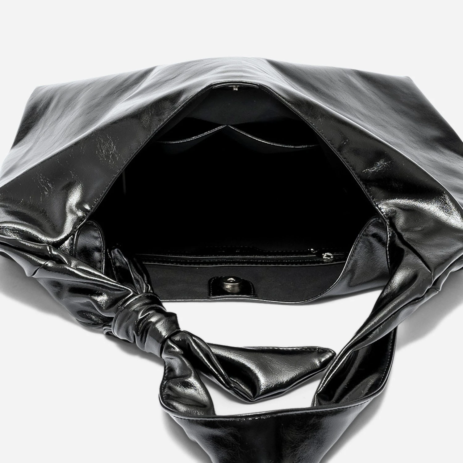Grand volume et souplesse incomparable. Ce sac à main pour femme plaît pour son bien-aller et sa facilité d’adaptation à la vie active des femmes. En matière synthétique noire, il séduit par sa finition glacée et sa anse, fermée par un nœud, à poser sur l’épaule. Un modèle féminin, idéal au quotidien.
