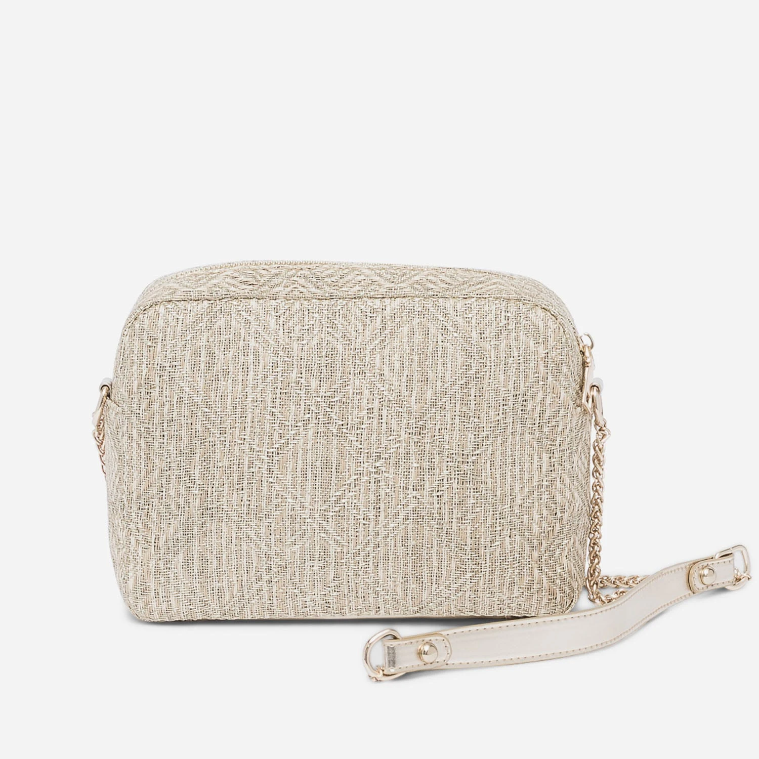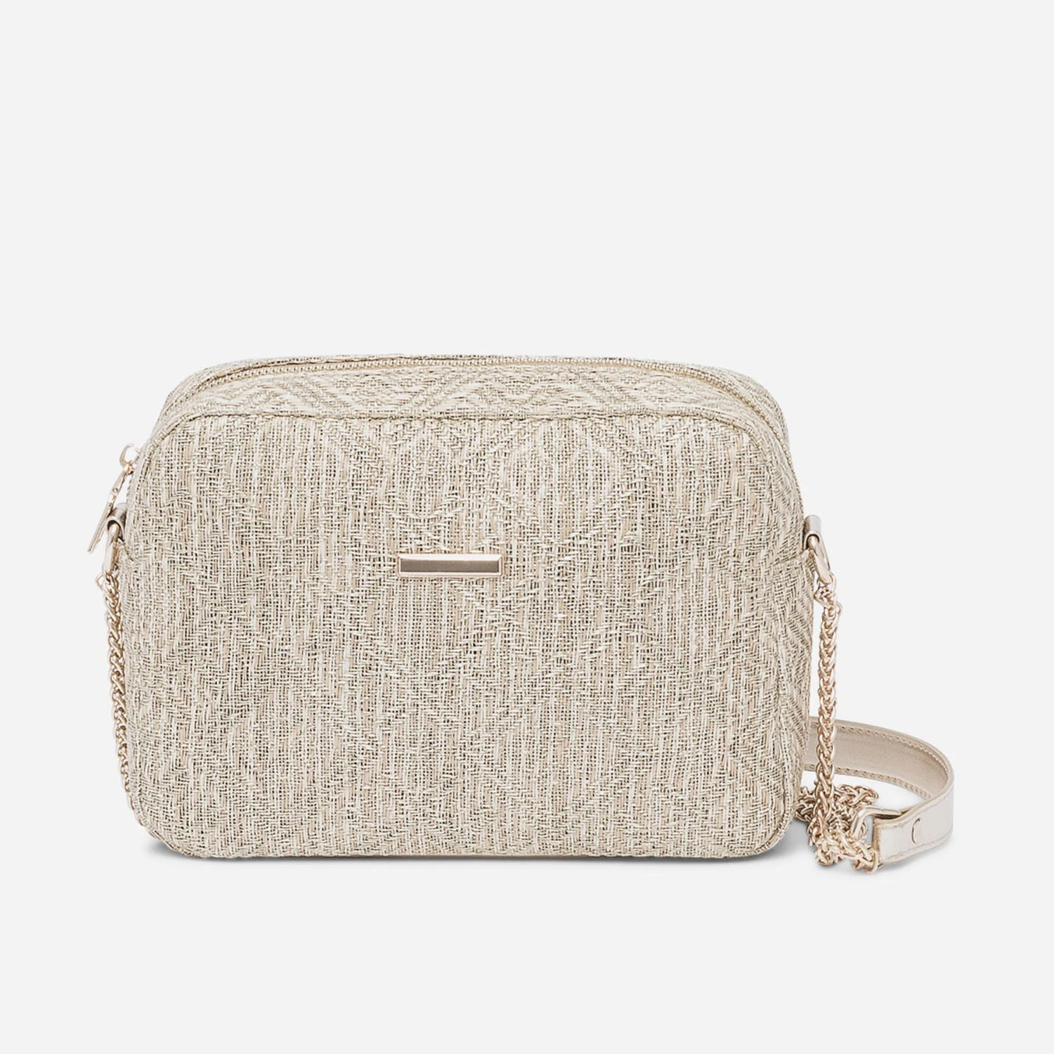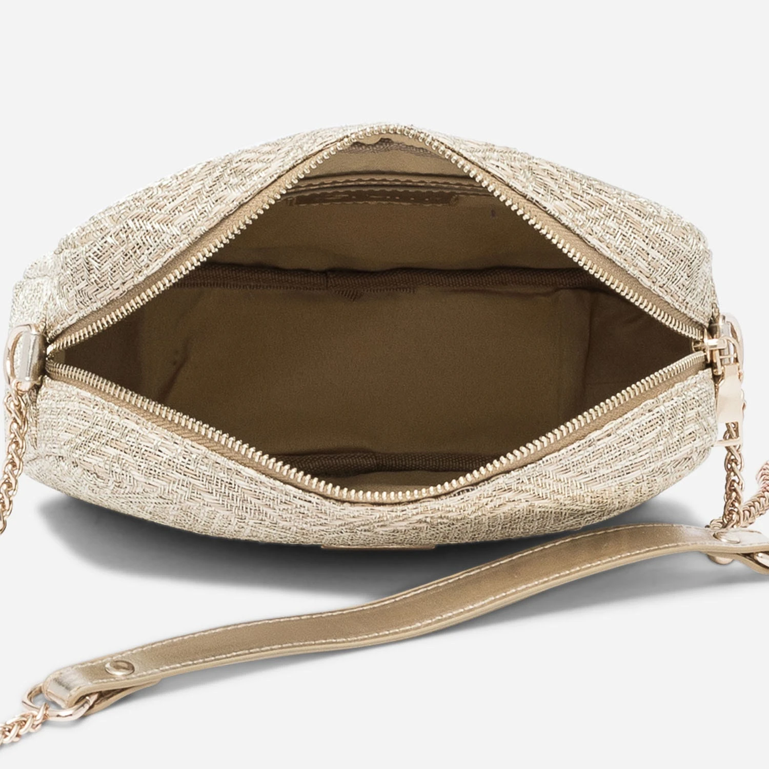 Ethnique et chic, c’est la définition du style de ce sac à main pour femme. Tressage beige rehaussé de fils dorés s’associent dans une parfaite harmonie. La bandoulière-chaînette apporte un côté glam’. Un modèle à porter sur l’épaule ou croisé, avec une tenue habillée.
