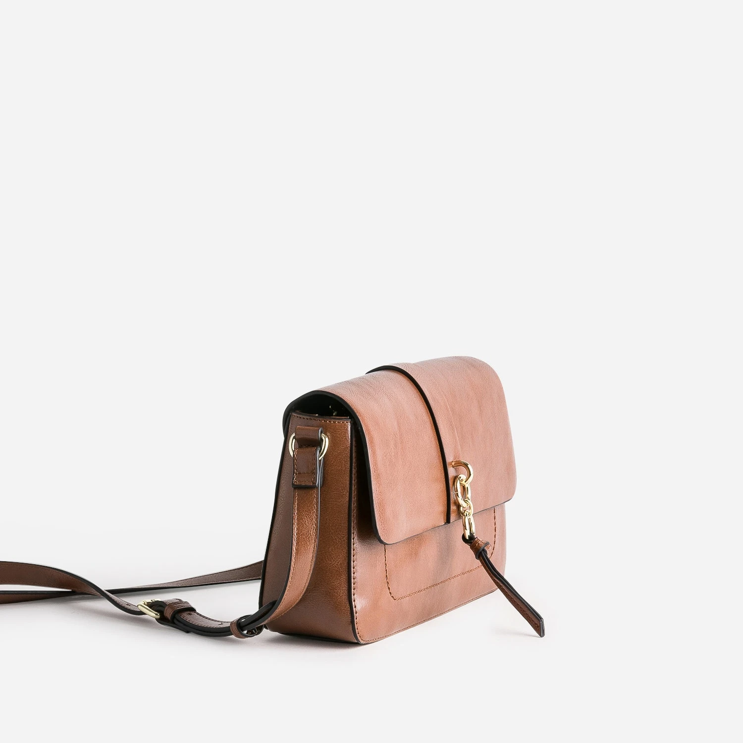 Terriblement mode, ce sac est un éternel basique. En matière synthétique cognac, il séduit par sa forme rectangulaire et son rabat décoré de 2 anneaux en métal doré. La bandoulière réglable permet d’adapter le porté sur l’épaule ou croisé. Un modèle indispensable, à s’approprier sans hésiter.