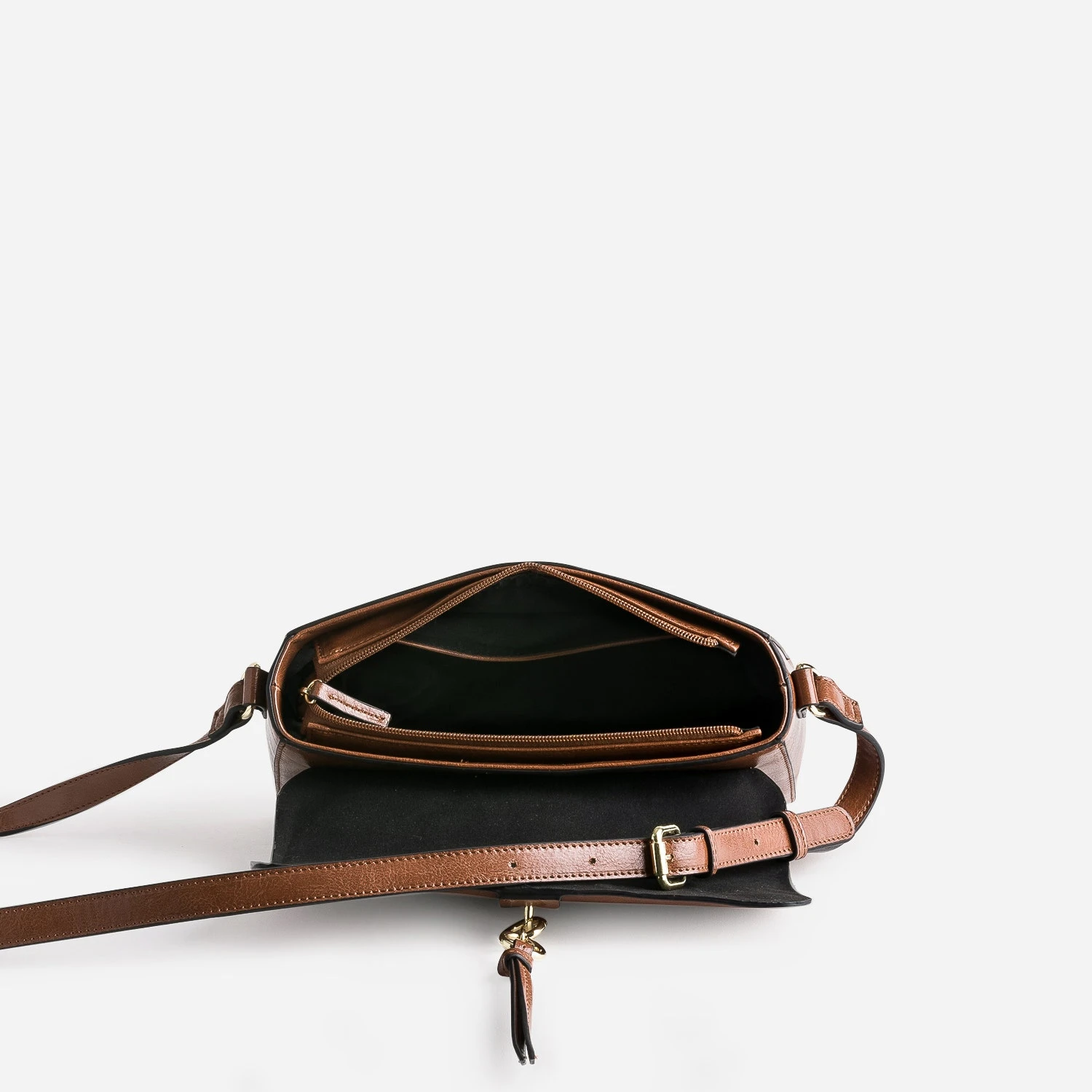 Fermeture par aimant. 1 compartiment avec 2 poches internes dont 1 zippée. 1 poche externe zippée. Bandoulière réglable non amovible.