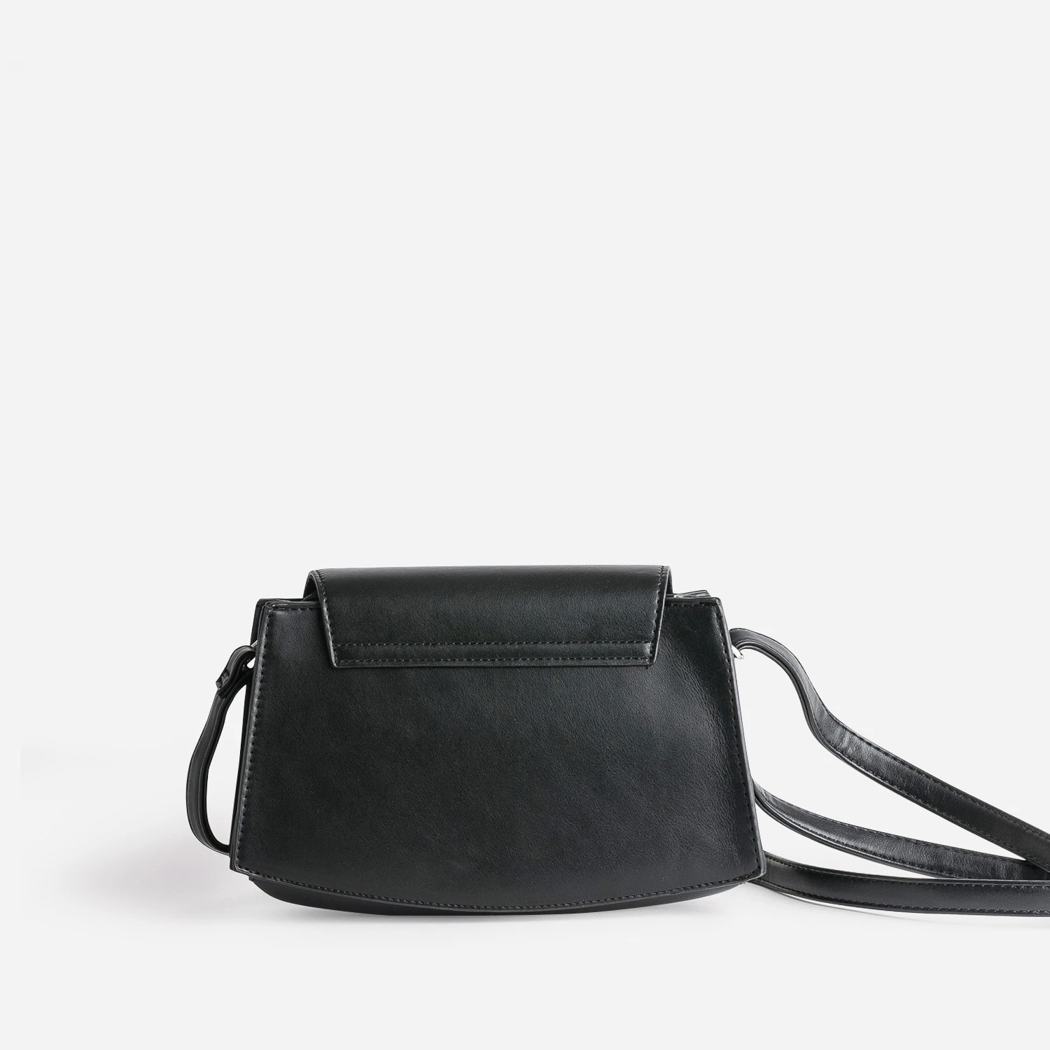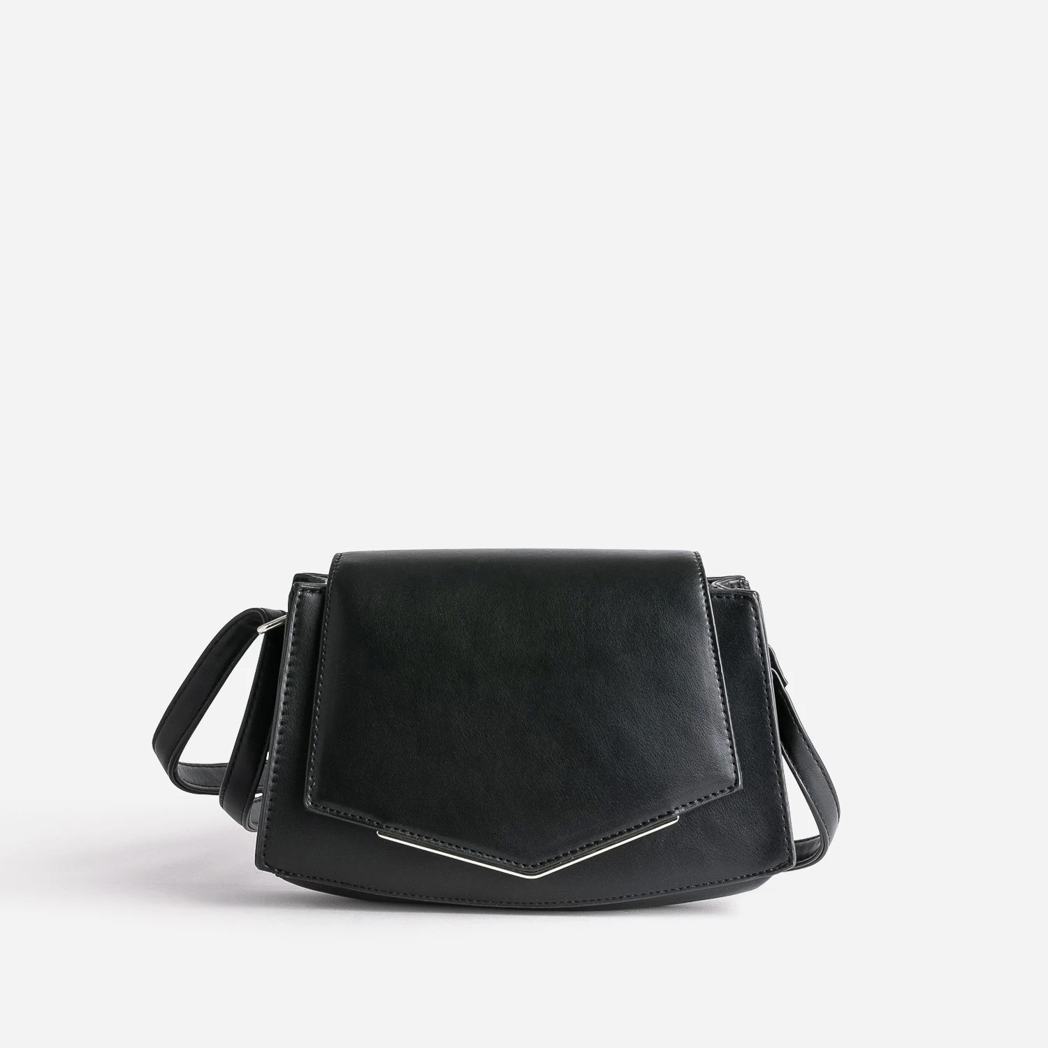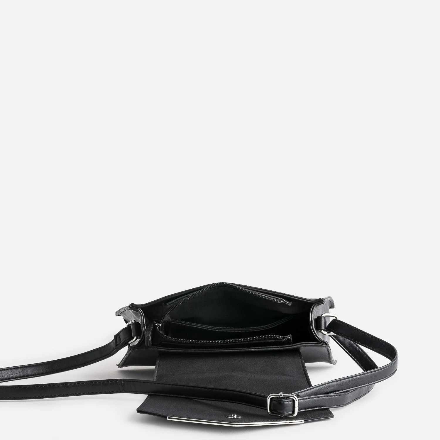 Une forme légèrement trapèze, un rabat légèrement plus long sur le devant, souligné d’une barrette en métal en V, une matière synthétique lisse coloris noir, une bandoulière réglable pour portés sur l’épaule ou croisé : 4 bonnes raisons de craquer pour ce nouveau sac à main femme.