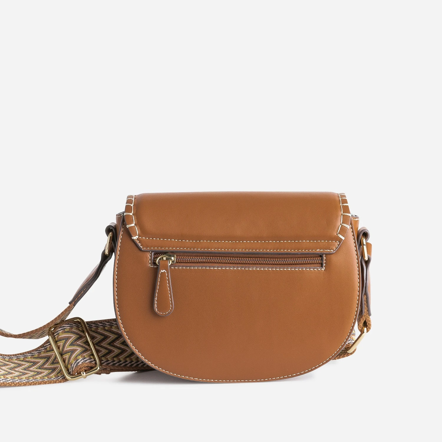 Esprit ethnique assumé pour ce sac bandoulière pour femme. En matière synthétique lisse camel, il se démarque d’abord par son rabat et sa languette rythmés de surpiqûres contrastées, ensuite par sa fermeture fantaisie par aimant caché, et enfin par sa large bandoulière en textile tressé. Un modèle à associer avec des pièces style baroudeuse urbaine, comme la saharienne ou la combinaison-pantalon.