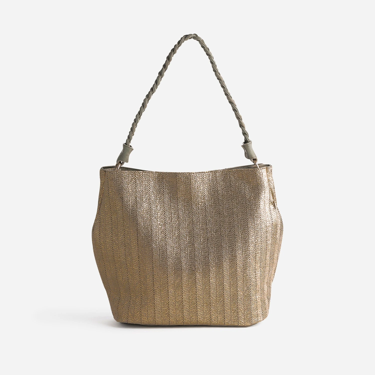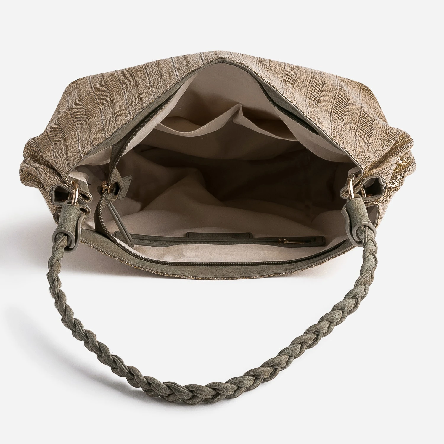 Un grand format inspiration cabas. Un coloris kaki, très tendance. Un jeu de tressage subtil. Une finition dorée. Une anse tressée. Ce sac femme multiplie ses plus beaux atouts, pour vous séduire. Un modèle à privilégier sur l’épaule, avec une robe-chemise beige et des sandales plates dorées.