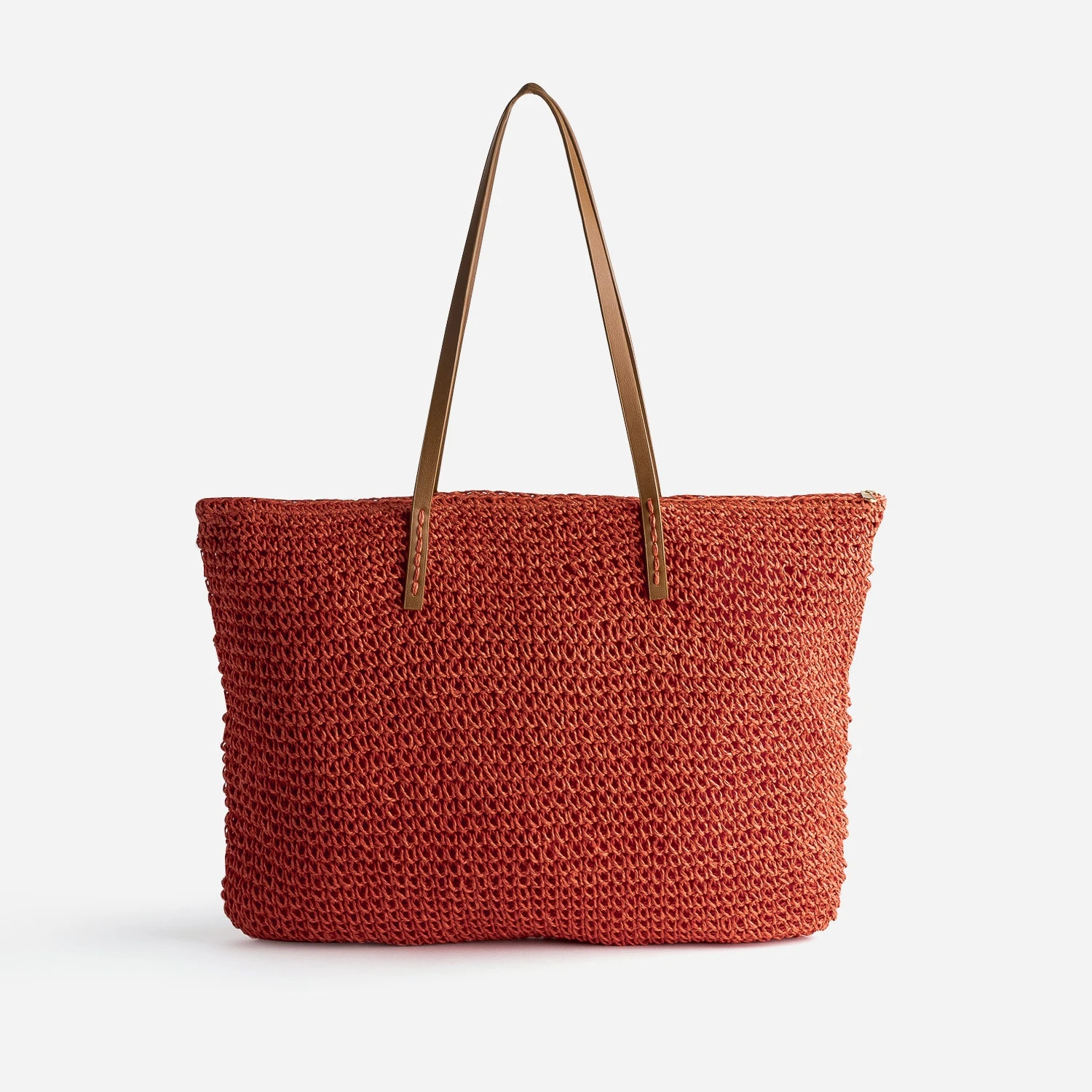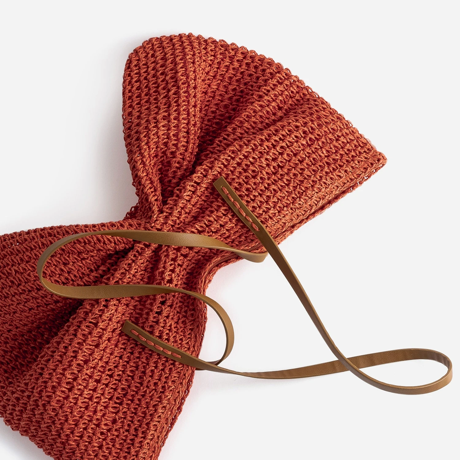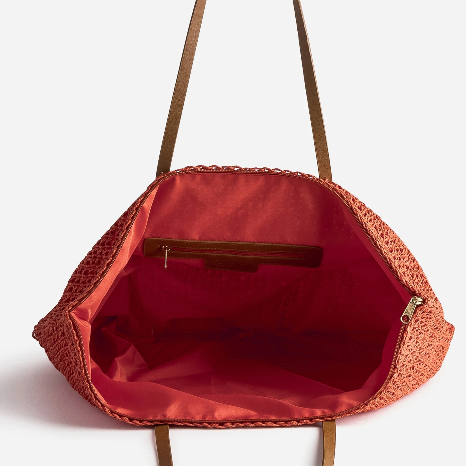Les dossiers en cours ou les affaires de plage ? Ce maxi sac cabas s’adapte à votre programme. En papier rouge orangé, il imite le raphia à la perfection, par un jeu de tressage étudié. Il se porte sur l’épaule, par deux anses en matière synthétique camel. Un accessoire à réserver à l’été, avec un look bohème-aventurière, composé de pièces en lin ou en macramé, d’imprimé fleurs et feuillages, d’espadrilles compensées en corde.