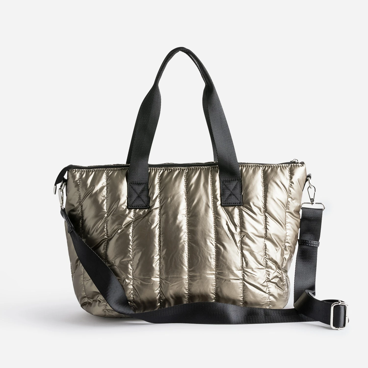 Nouvelle forme casual pour le sac cabas. Lui aussi succombe à la tendance matelassée, dans un nylon bronze métallisé. Le compartiment principal compte 3 poches dont 1 zippée ; 1 grande poche, placée devant, permet d’optimiser le rangement. Les anses courtes, pour porté bras, sont complétées par une bandoulière tissée, réglable et amovible. Bousculez les codes avec un accessoire avant-gardiste.