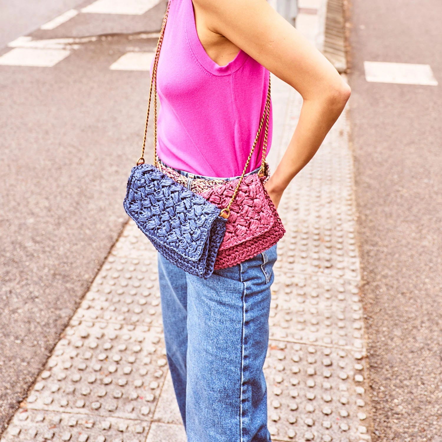 Pochette si vous la portez à la main, sac si vous préférez sur l’épaule, voilà un accessoire que vous n’allez plus quitter. Confectionné en 100% papier, il imite le raphia par un subtil jeu de tressage. Coloris bleu marine, il se réserve à la saison estivale, pour finaliser un look de cérémonie ou du quotidien, dans les tons parme ou vert amande par exemple.