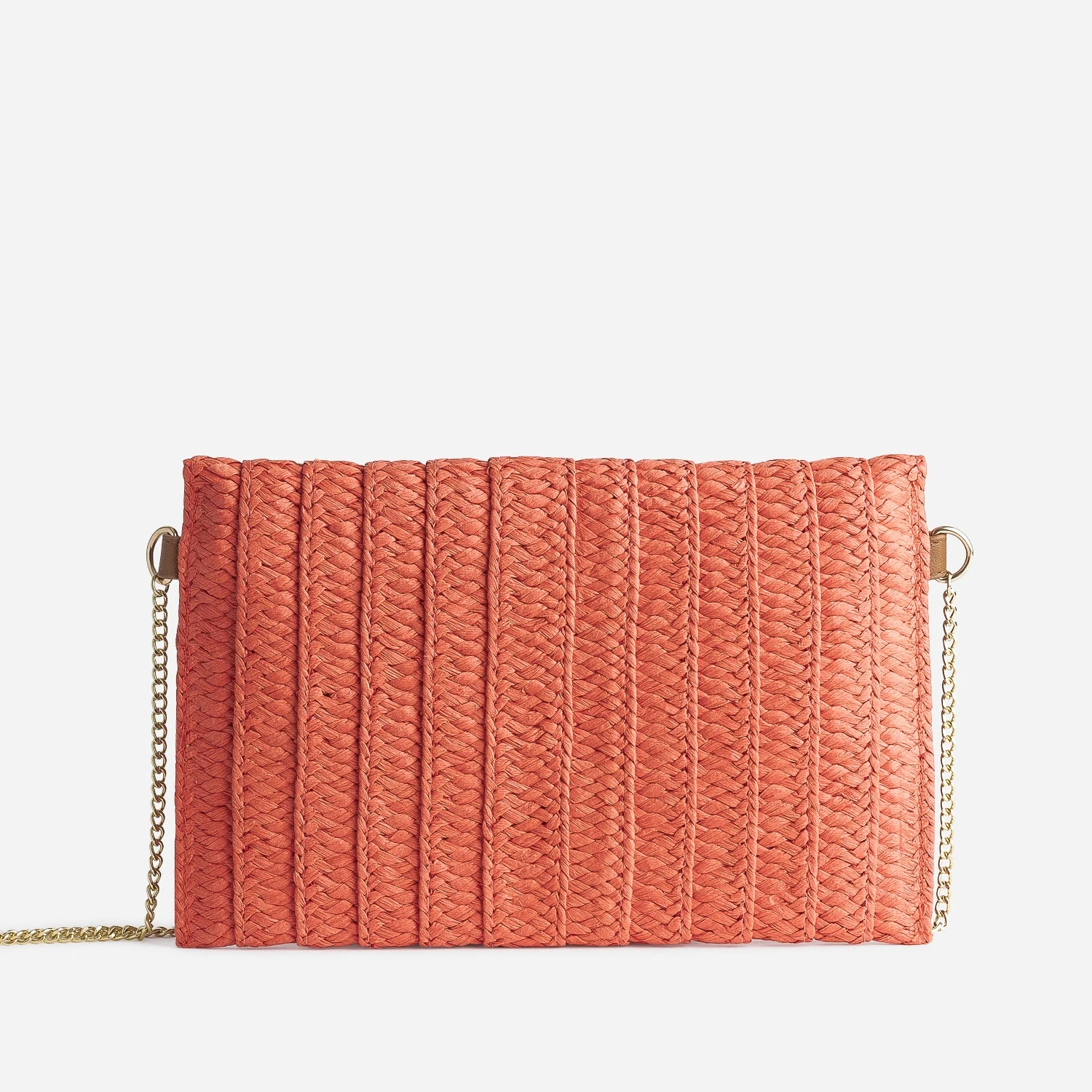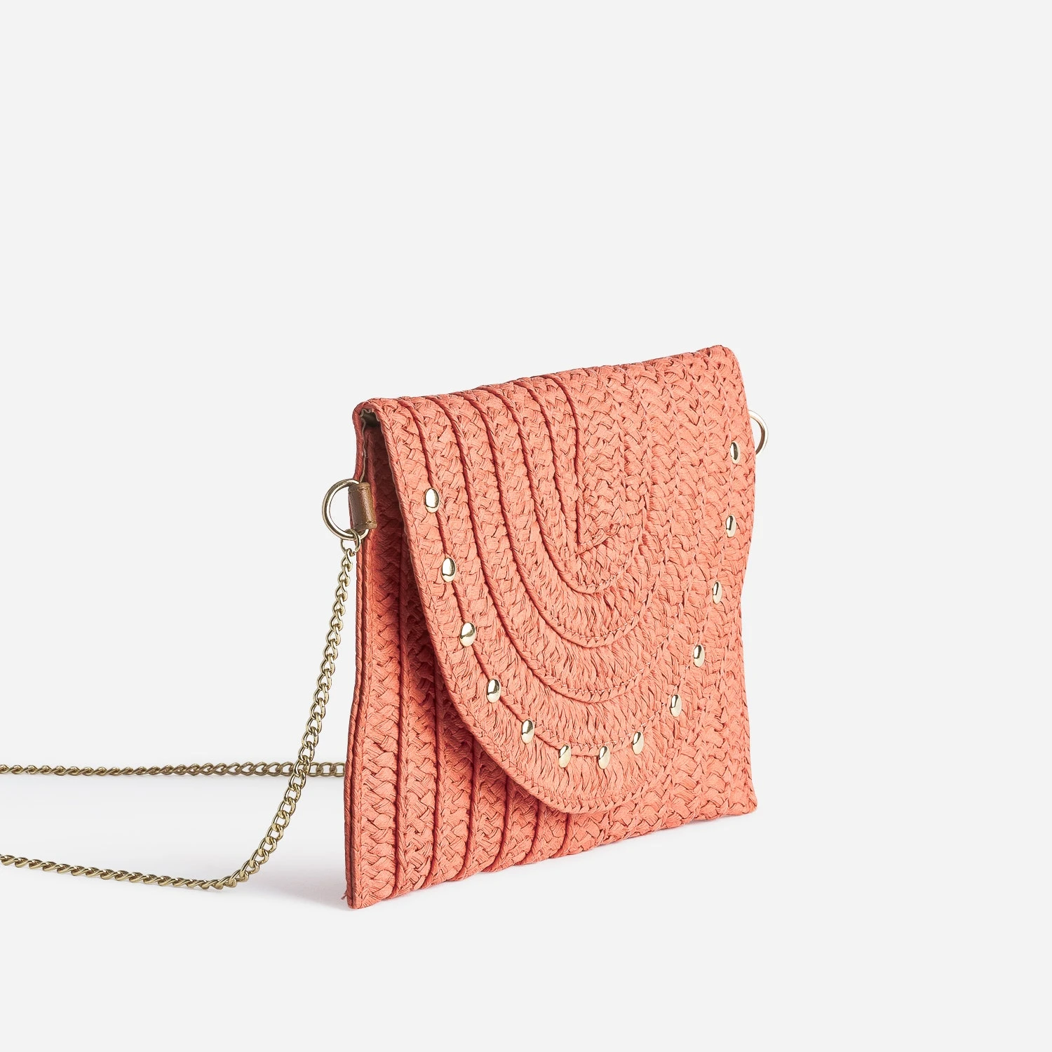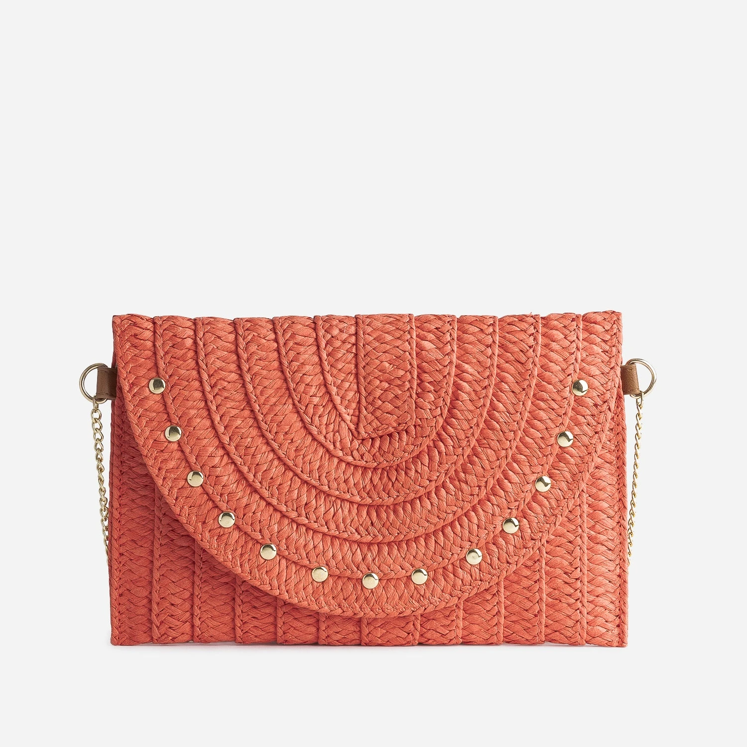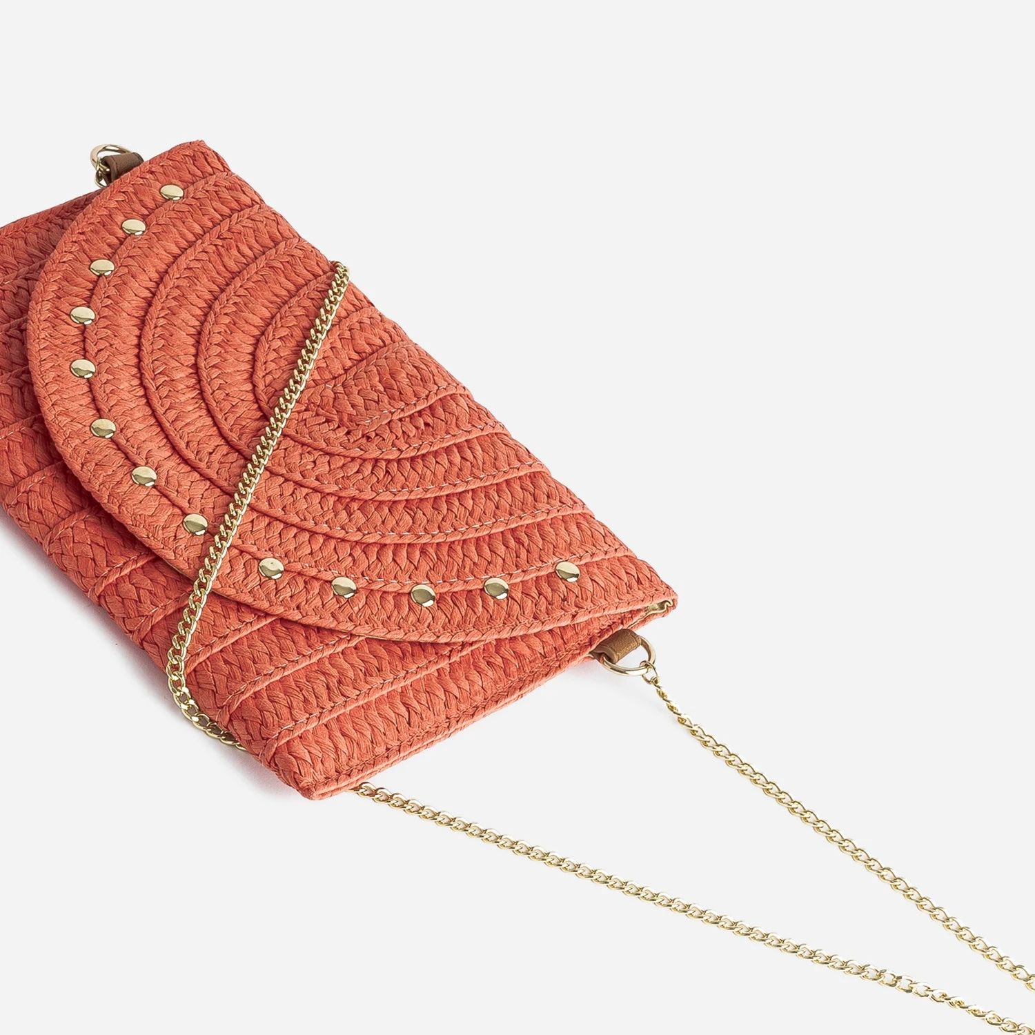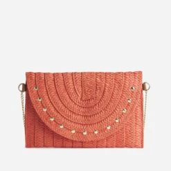 Légèreté et vitamine : 2 mots choisis pour définir ce sac à main pour femme. Léger par sa matière, du 100% papier imitation raphia tressé, vitaminé par sa couleur, un orange lumineux, il adopte un format pochette rigide, très recherché pour les cérémonies. Il est doté d’une fine bandoulière façon chaînette en métal doré, pour pouvoir être posé sur l’épaule ou porté à la main. Le rabat est décoré de clous réguliers, proposant un style romantico-rock. Essayez avec un costume d’été coloris pastel, vert sauge ou parme, ou plus décontracté, avec une blouse fluide écrue, un jean bleu et des sandales à talon.
