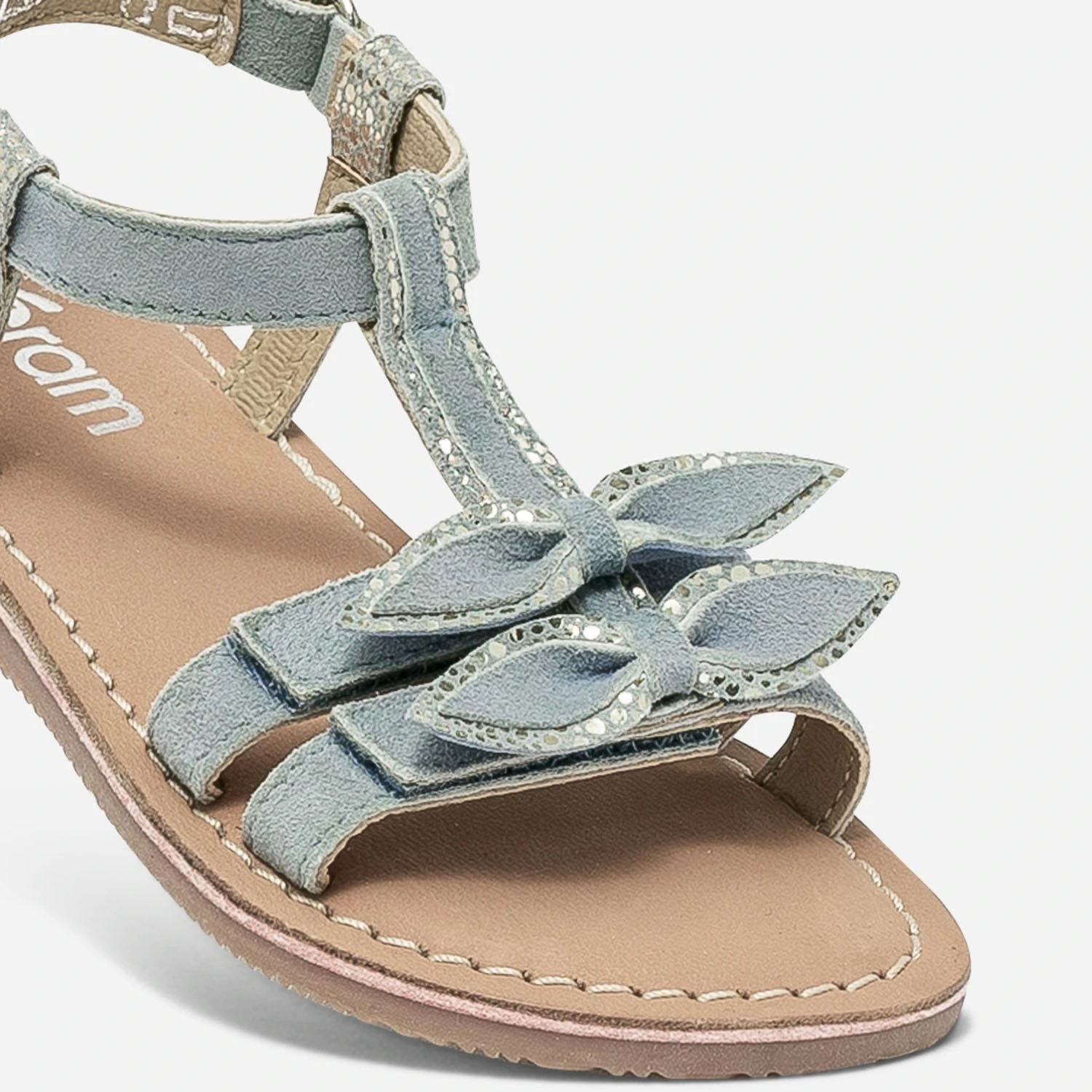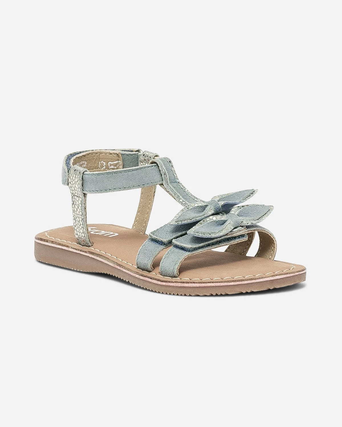 Plongez dans l’été avec cette sandale petite fille, couleur du ciel. En cuir velours, elle se pare de touches imprimées argentées, qui reflètent la lumière. Les 2 brides posées sur le pied sont décordés de nœuds fixes et se ferment par scratchs, tout comme celle à l’arrière de la cheville. Un modèle à associer avec des tons pastel, comme le rose tendre ou le jaune pâle.