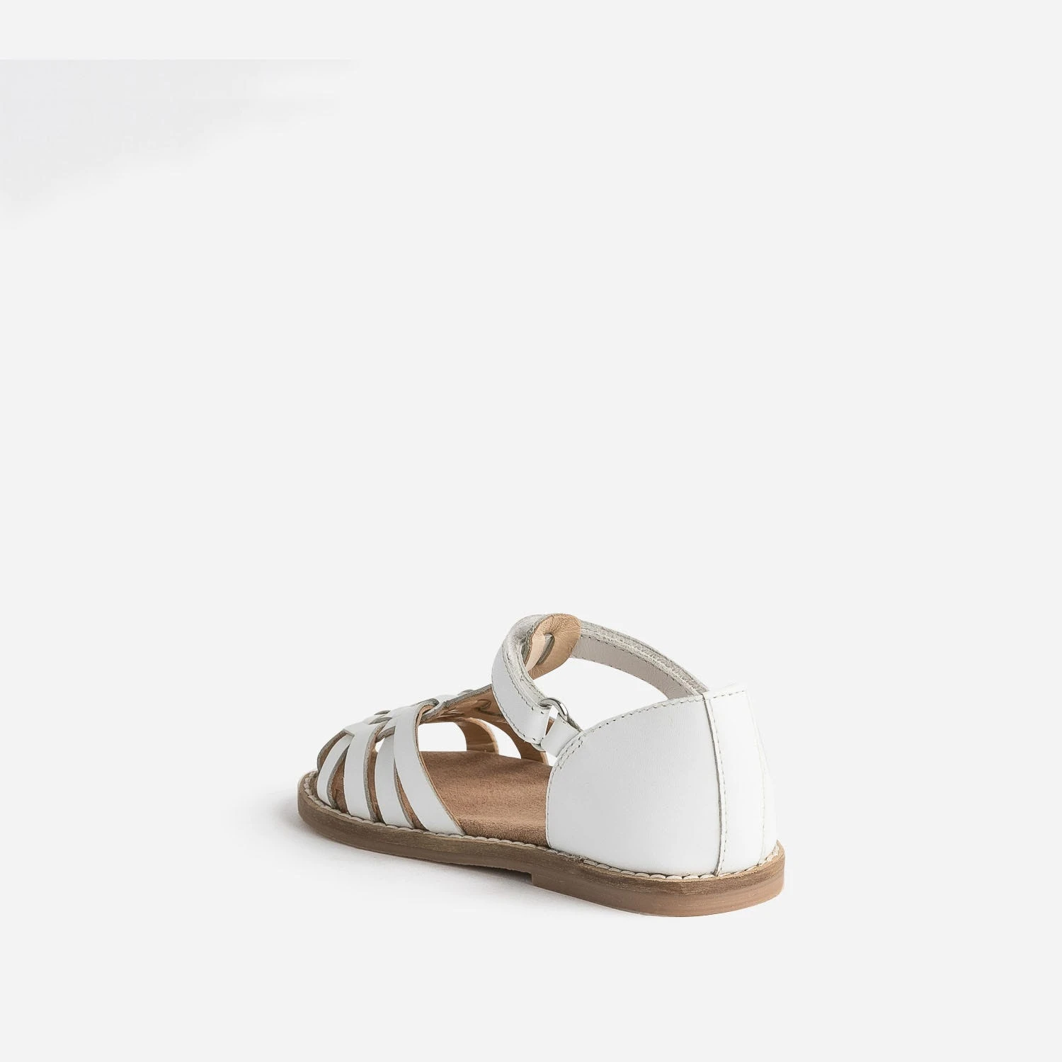 Nouvelle saison estivale, nouveau modèle de sandale. ConfectionnĂ©e en cuir, elle se dĂ©cline en coloris blanc et se dĂ©marque par un jeu de brides tressĂ©es sur le dessus du pied ; un pied parfaitement maintenu, grâce au contrefort arrière et une fermeture par scratch. Avec un tee-shirt Ă manches ballon et un short en jean pour le quotidien, avec une robe en tulle pour une cĂ©rĂ©monie, elle s’adapte Ă l’infini.