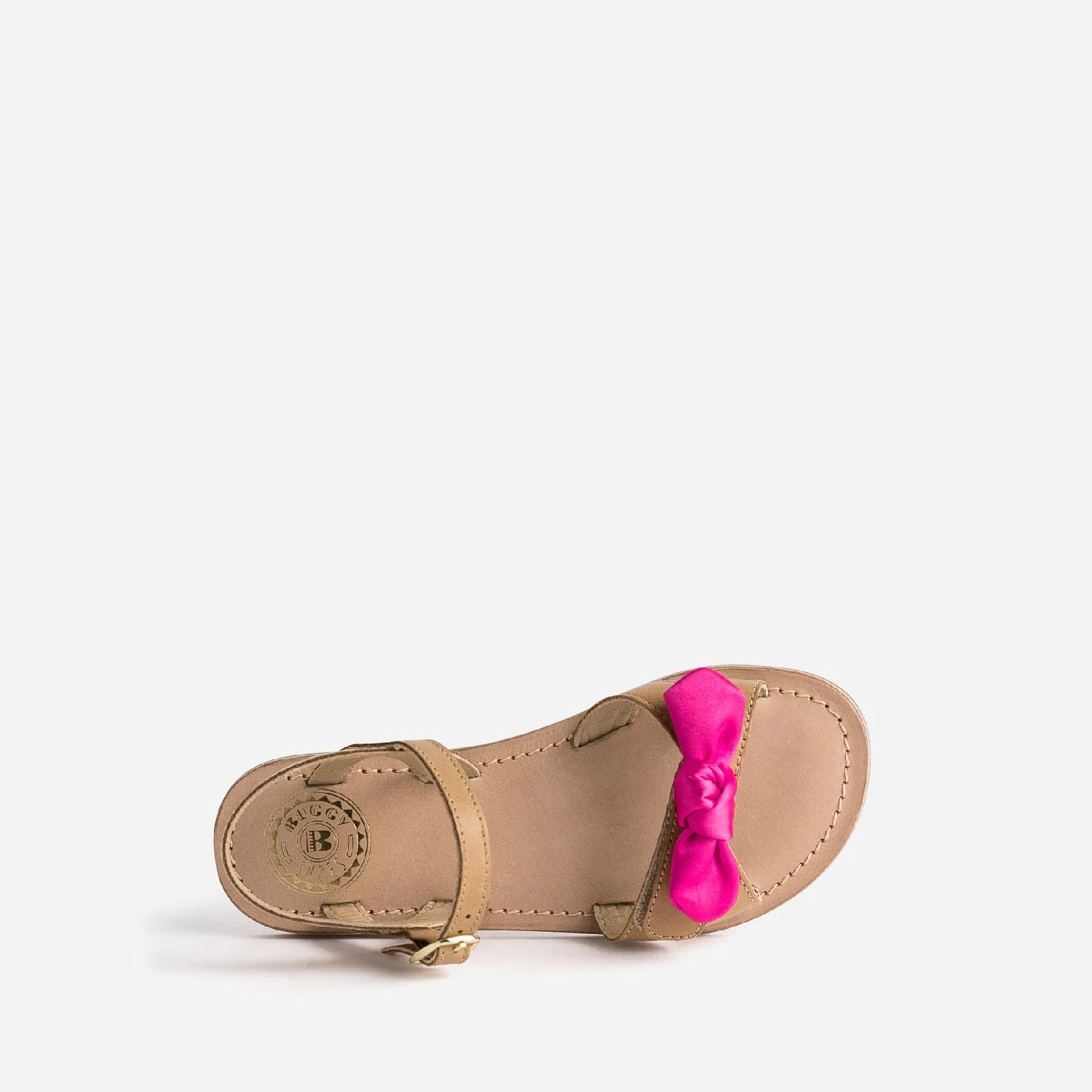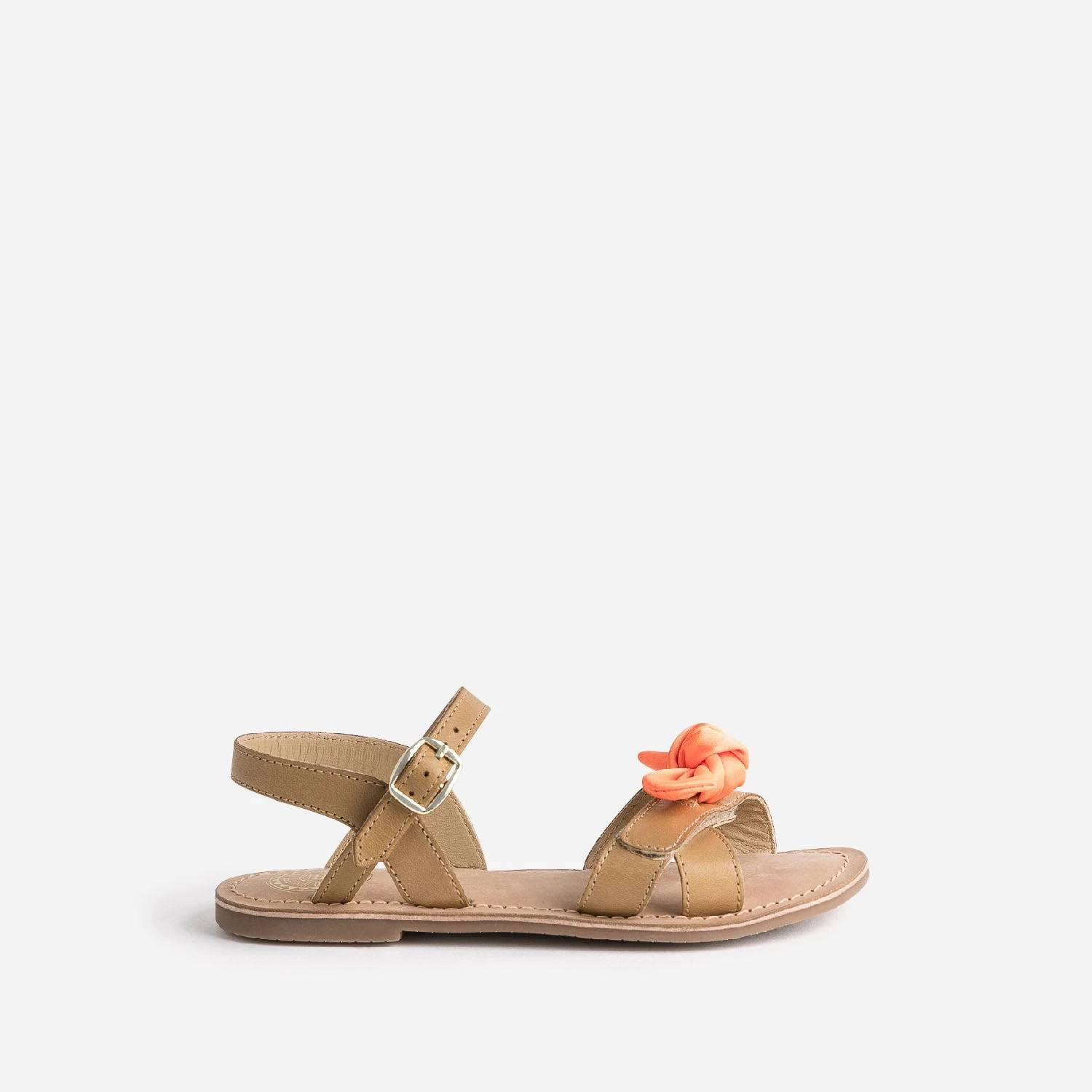 Sur le podium des chaussures incontournables de l’été, la sandale prend la première place. En cuir camel, elle est à la fois sobre, élégante et mode. Elle séduit les filles par son nœud satiné amovible, à poser sur la bride du dessus du pied : rose fuchsia, parme ou orange fluo, à vous de choisir !