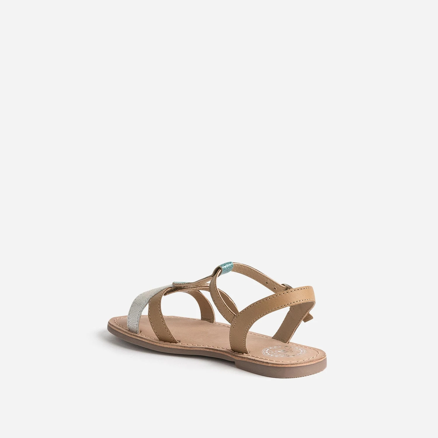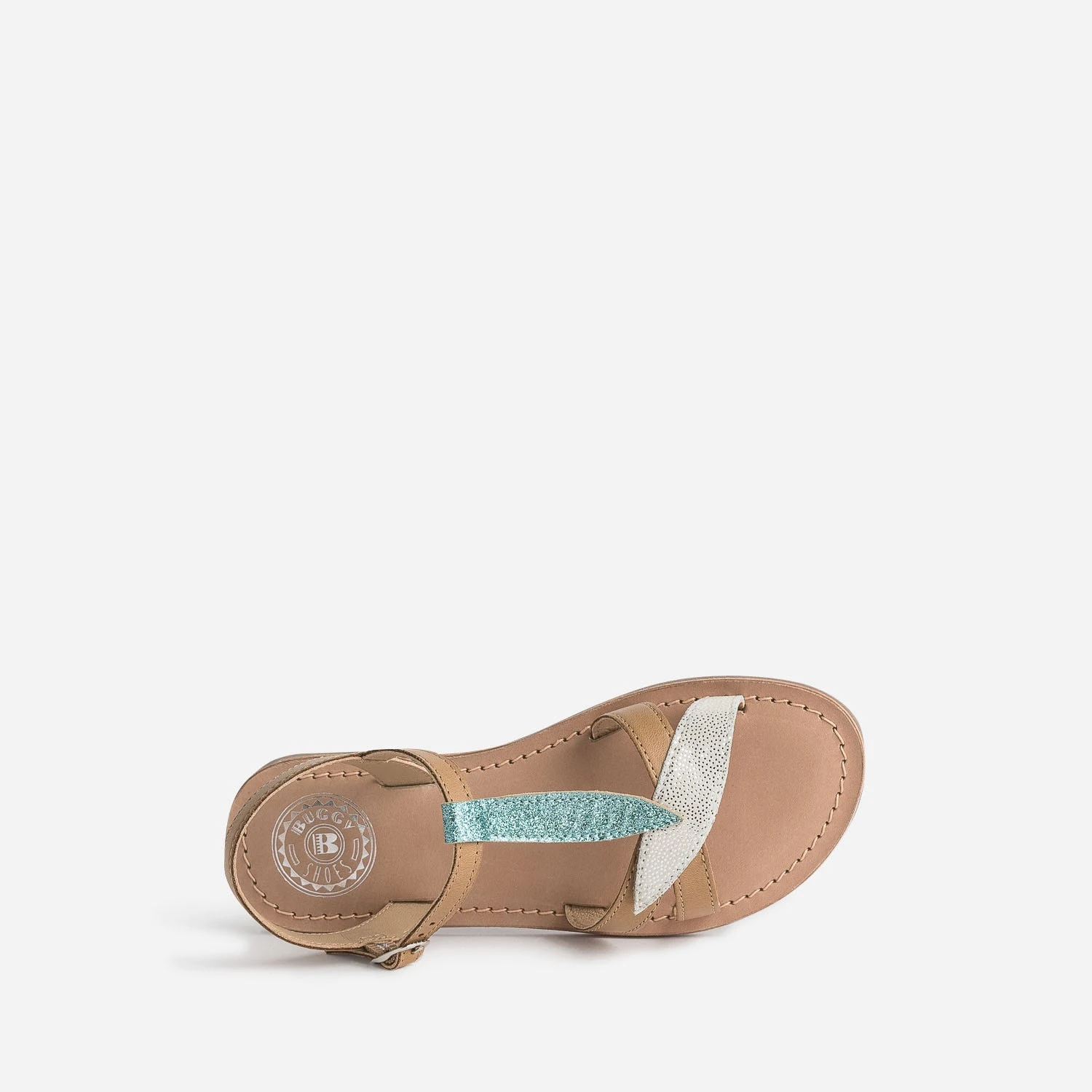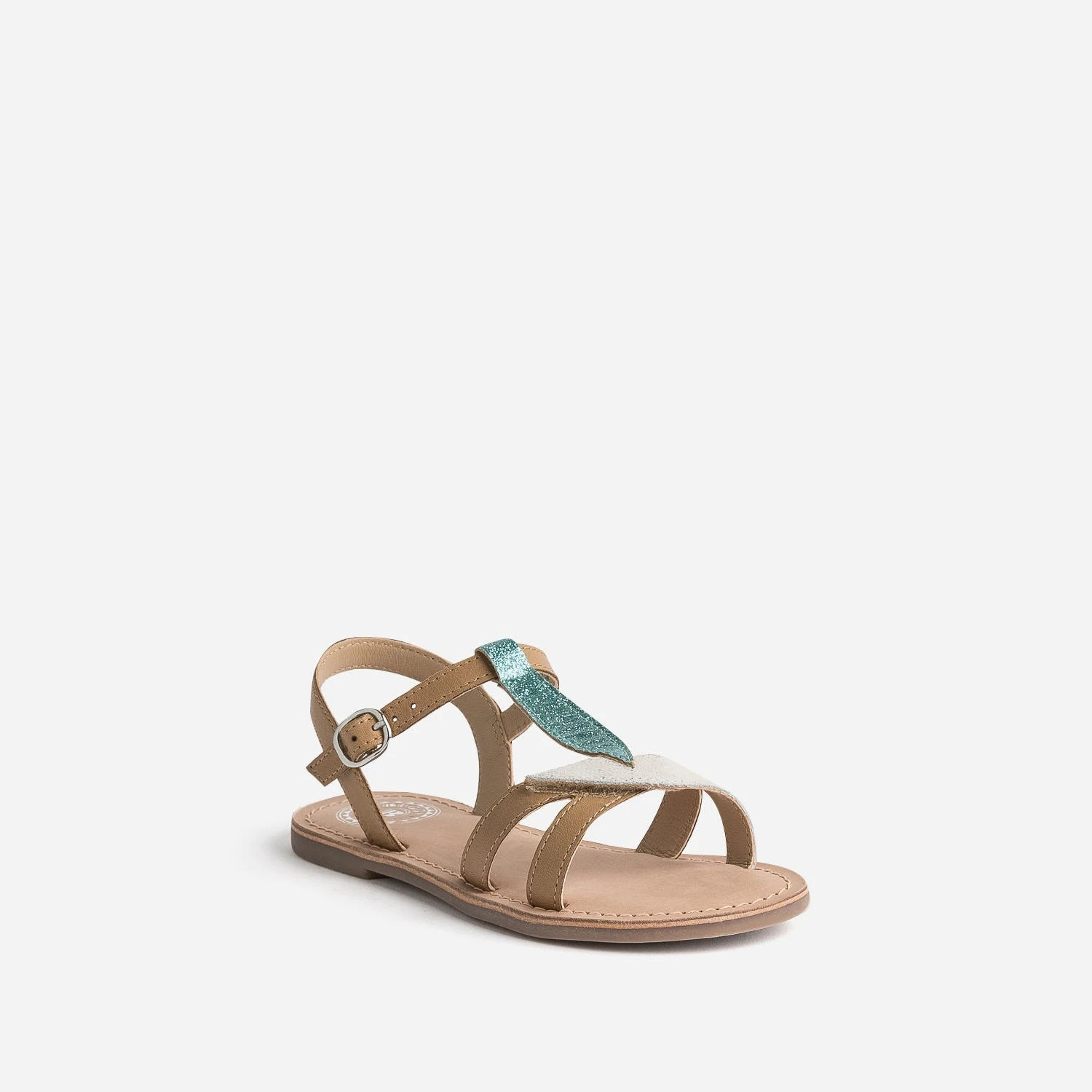Esprit bohème chic pour cette sandale fille. En cuir camel, elle présente deux feuilles en guise de brides, l’une beige à motif argenté, l’autre turquoise pailleté. A réserver pour une cérémonie comme pour le quotidien.