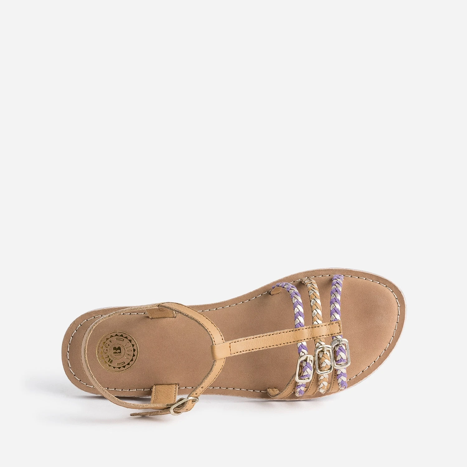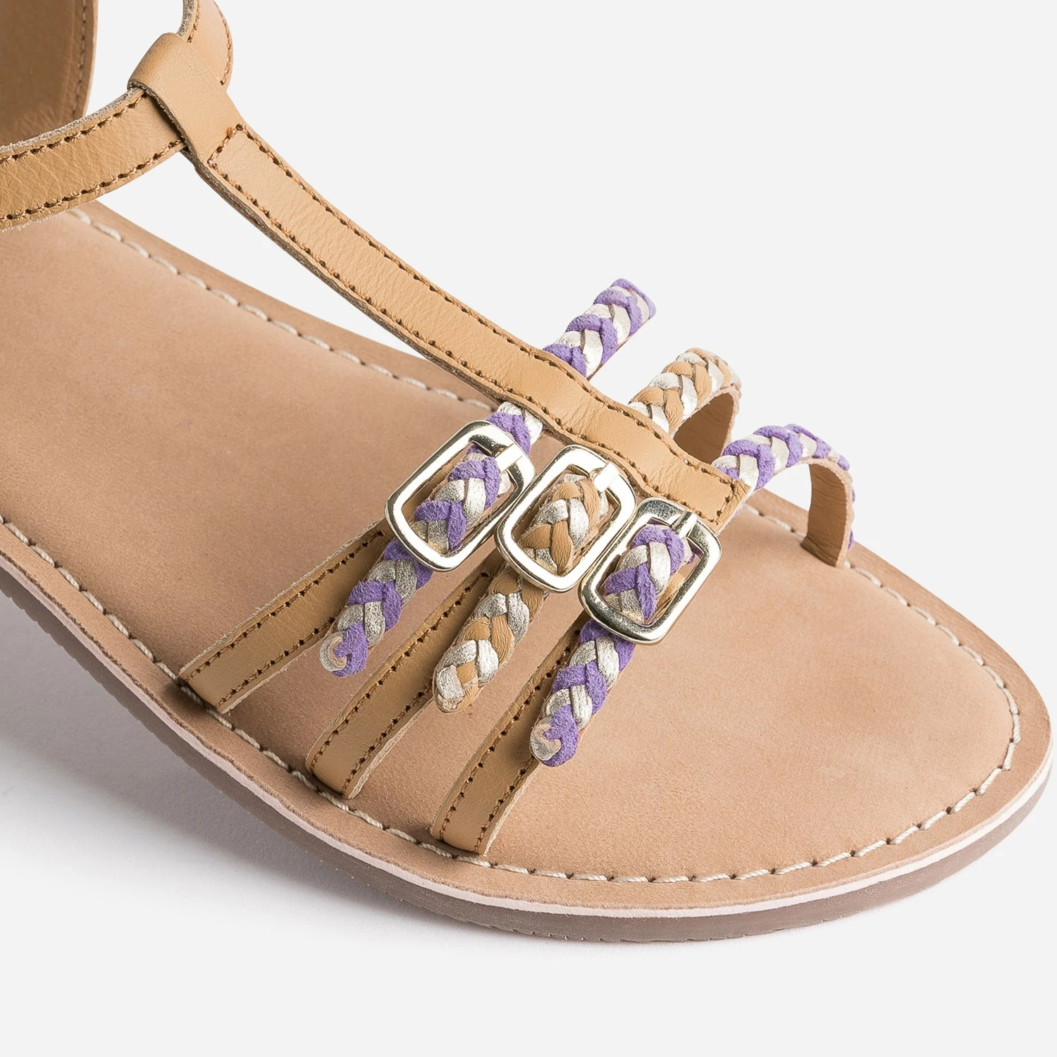 En cuir camel, cette sandale junior fille se démarque par 3 brides tressées de violet et doré sur le dessus du pied. Réglables par boucles, elle s’ajuste au pied sans contraintes. Réservez-la avec une tenue dans les mêmes tonalités.