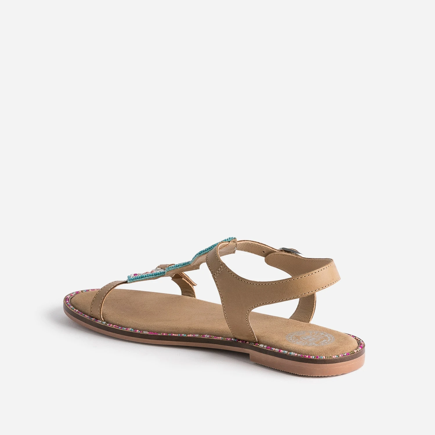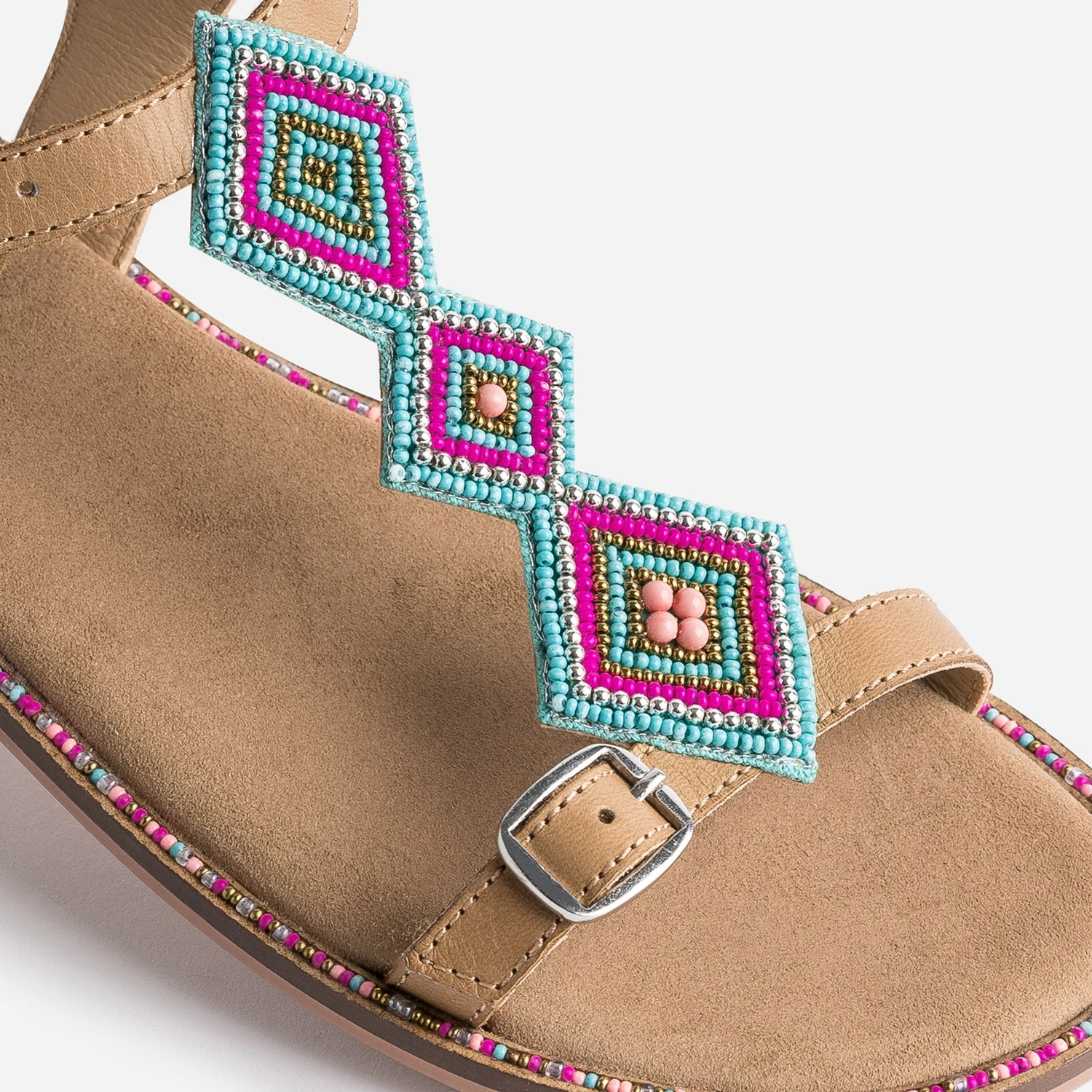 Broderies perles turquoise, rose, pêche, doré et argenté, sur la bride en T à 3 losanges et sur la trépointe, cette sandale junior fille adopte un style ethnique. En cuir camel, elle se ferme par boucles, pour ajuster le confort et le maintien du pied. Imaginez-la avec une robe longue blanche ou un débardeur blanc et un short en jean bleu.