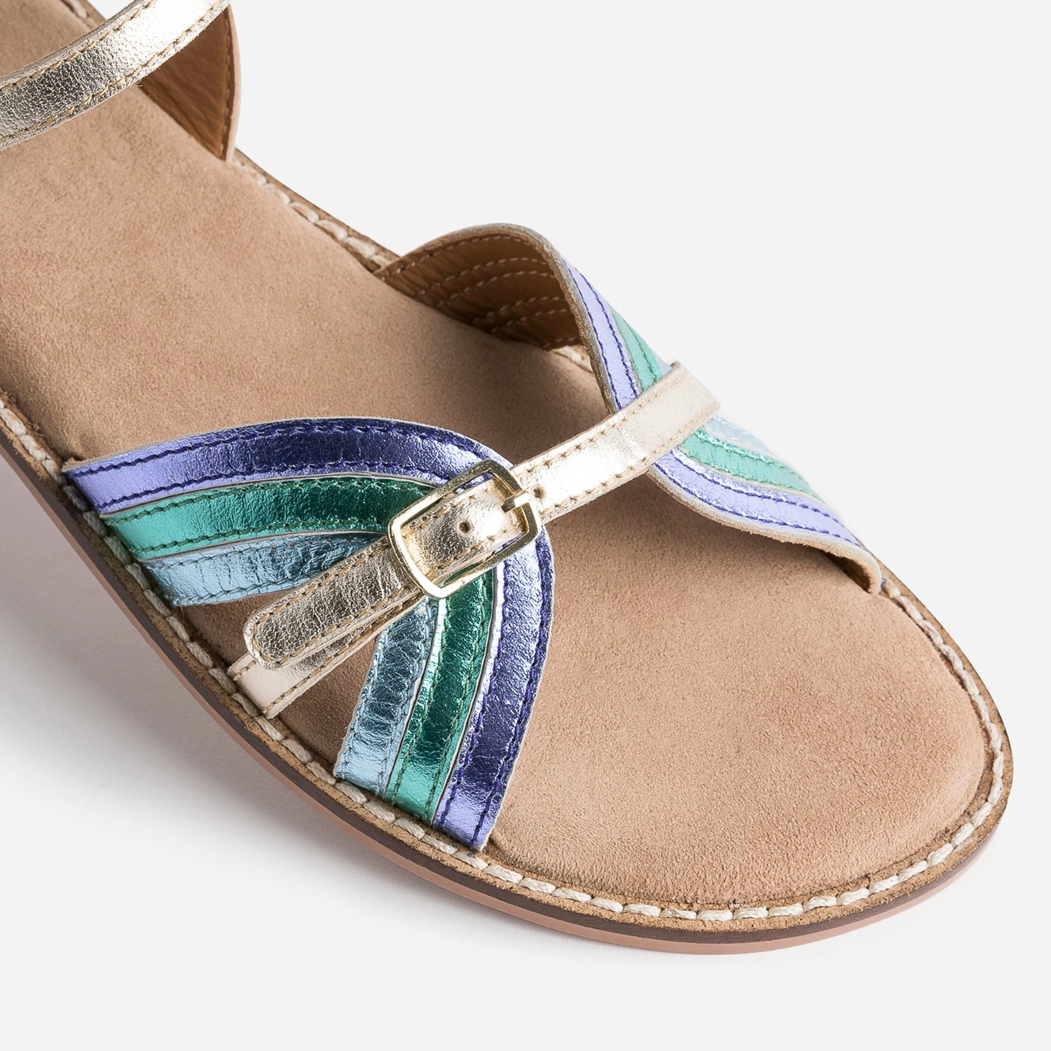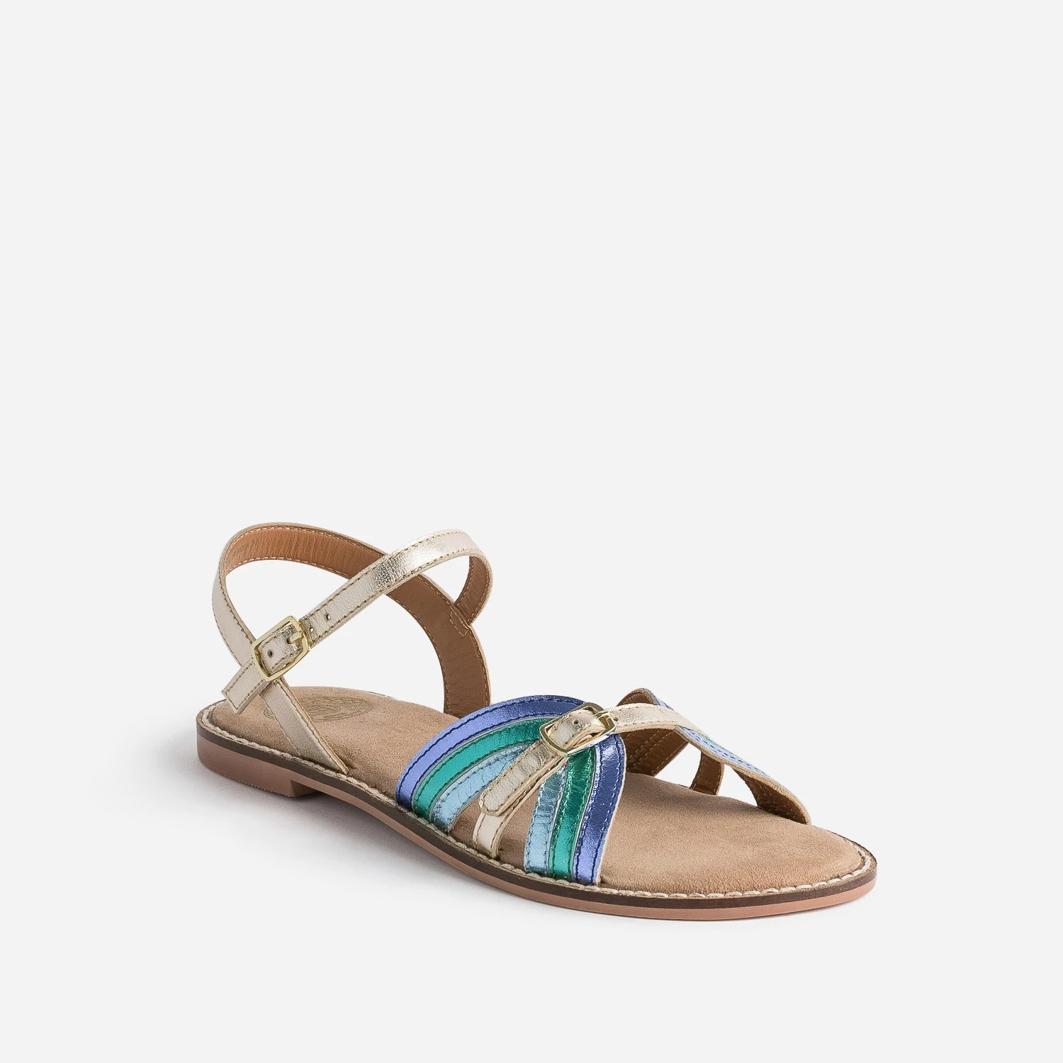 Rien de mieux qu’une sandale en cuir doré, pour sublimer les looks d’été. Dédiée aux junior filles, elle se démarque par trois brides métallisées, une turquoise, une verte, une bleue, placées autour de l’avant du pied. Elle se ferme par boucles, qui assurent un maintien ajusté.