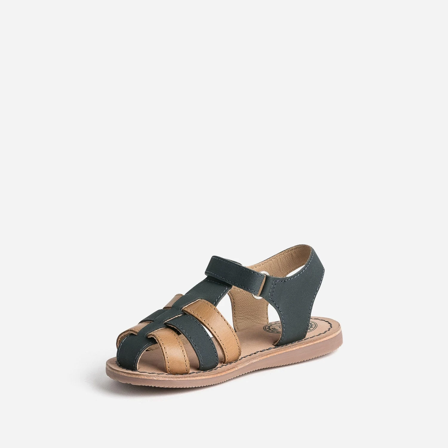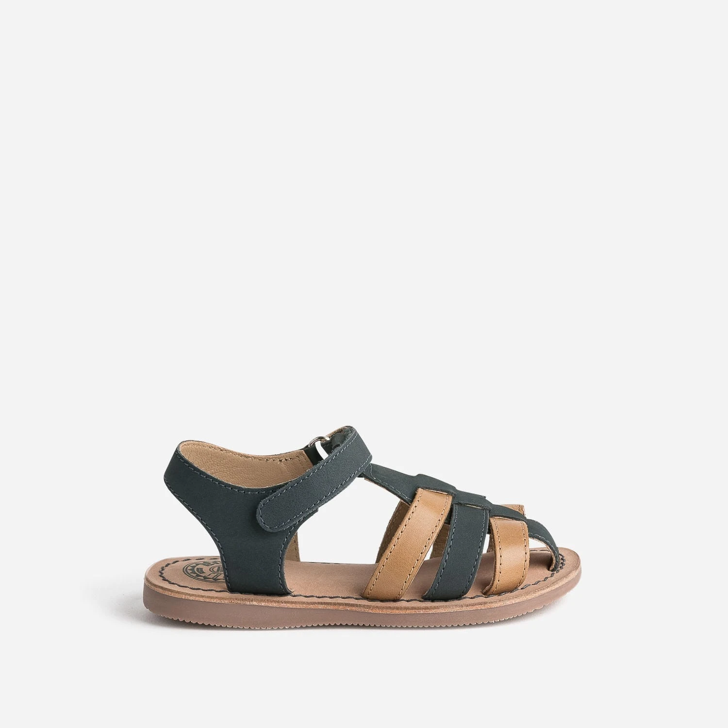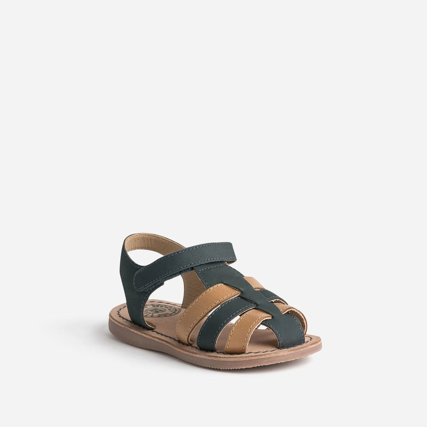 Réservée aux petits garçons, cette sandale d’été est confectionnée en cuir, pour une meilleure résistance. Bleu marine et marron clair, elle joue avec les brides pour alterner les couleurs et se ferme par scratch, pour ajuster le maintien du pied.